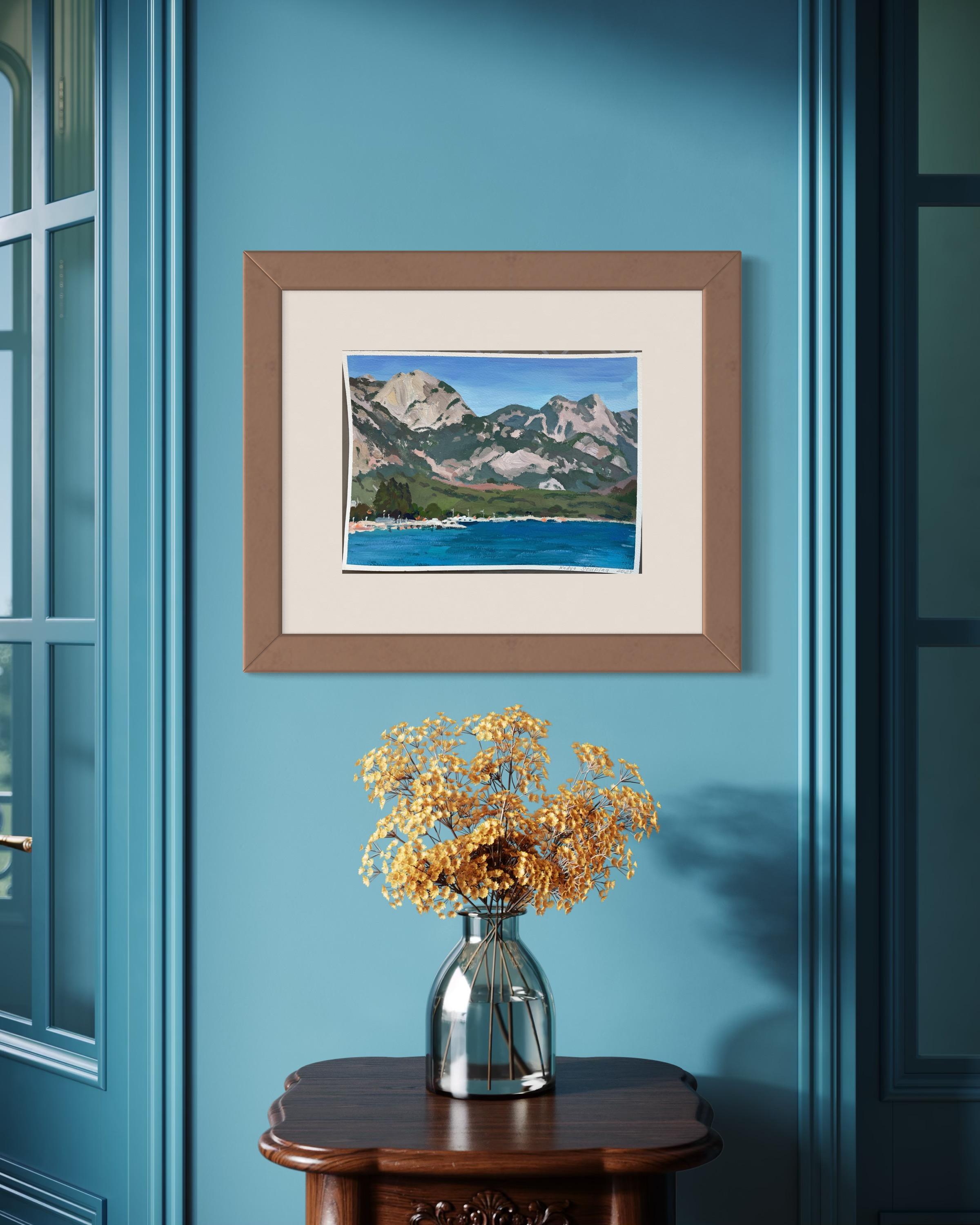 Dieses Kunstwerk zeigt eine lebendige Landschaft, die durch ihre dynamische Darstellung der Natur besticht. Im Hintergrund dominieren die markanten Berge mit ihren schroffen Gipfeln, die sich vor einem klaren, blauen Himmel abzeichnen. Diese natürlichen Formationen sind mit subtilen Grau- und Grüntönen gemalt, die die Struktur und Majestät der Szene einfangen. Im Vordergrund spiegelt ein ruhiges Gewässer tiefblaue Farbtöne wider, die eine friedliche, einladende Atmosphäre suggerieren. Die Uferlinie ist mit kleinen Booten übersät, die der Komposition ein Gefühl von Größe und Lebendigkeit verleihen. Der Künstler kontrastiert gekonnt das ruhige Wasser mit den imposanten Bergen und schafft so ein harmonisches Gleichgewicht. Das üppige Grün am Fuße der Berge unterstreicht die Tiefe und den Reichtum der Landschaft. Dieses Werk besticht durch seine kühne Farbgebung und seine beeindruckende Detailtreue, die ein Gefühl der Ehrfurcht und Wertschätzung für die natürliche Welt hervorruft.