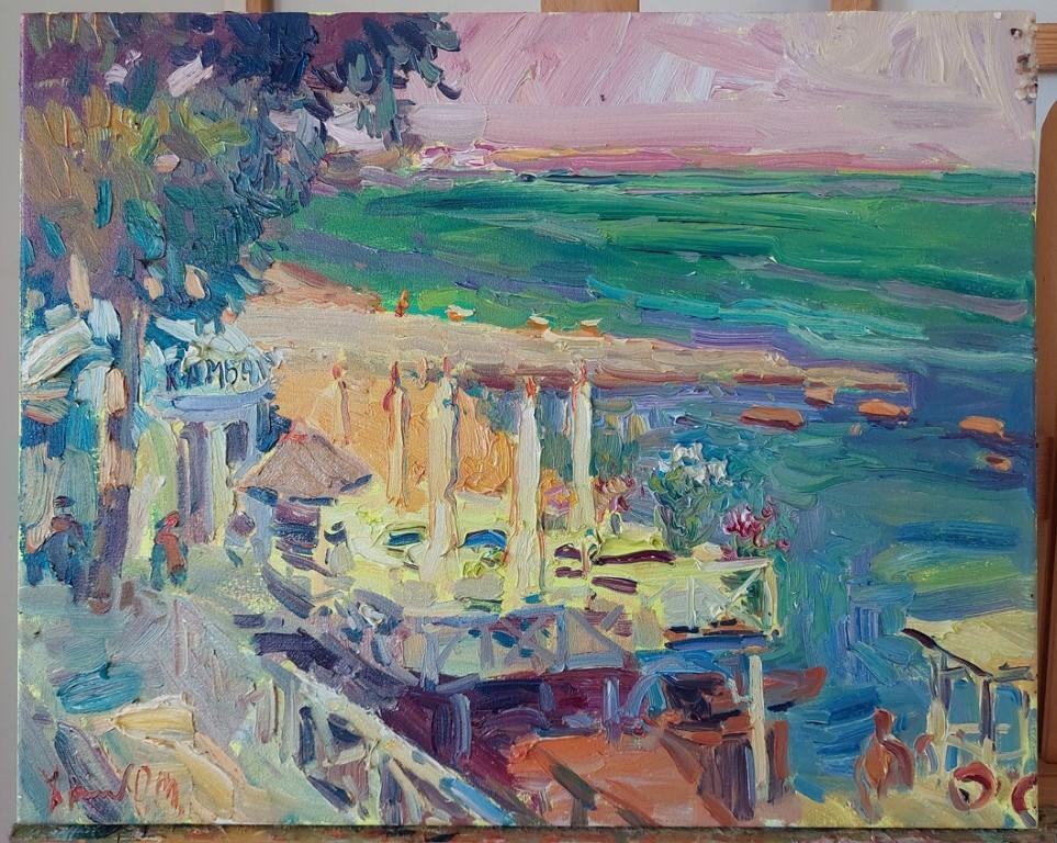 Vor uns liegt das legendäre Restaurant Kambala an der Küste, ein Ort, an dem der Geschmack des Meeres, die Aromen der Küche und die Unendlichkeit des blauen Horizonts ineinander übergehen. Gekonnt stellt der Künstler den Moment dar, in dem das blau-blaue Schwarze Meer besonders tief erscheint und das Sonnenlicht die gesamte Küste golden überstrahlt.