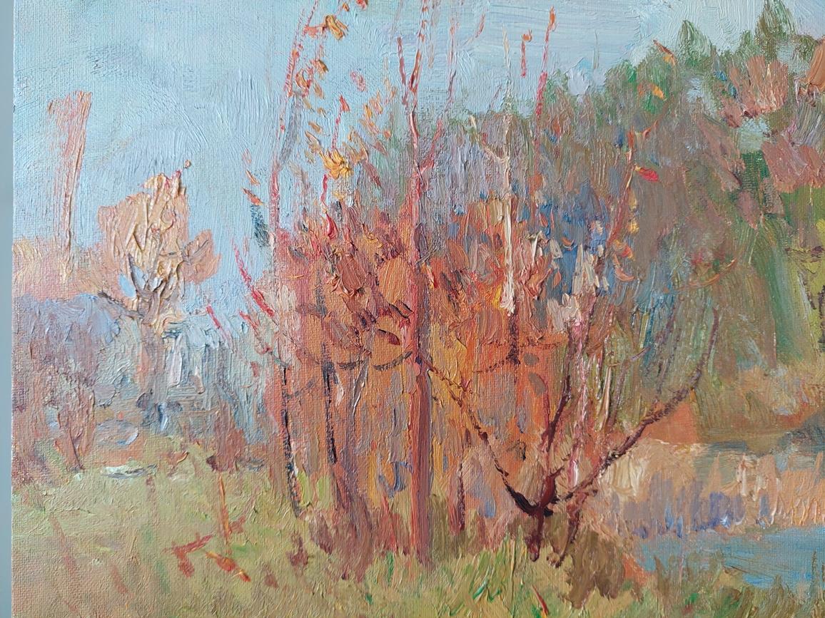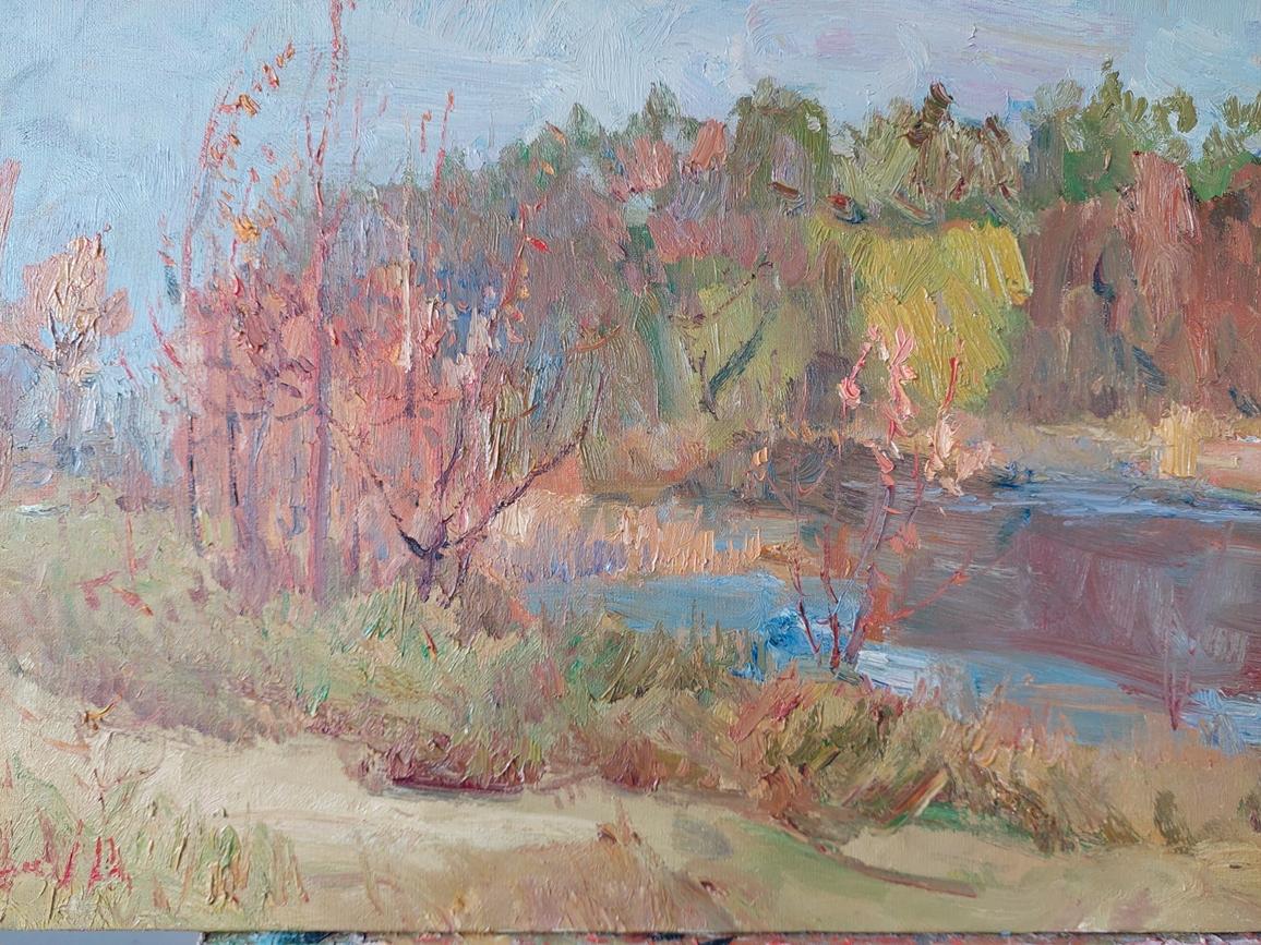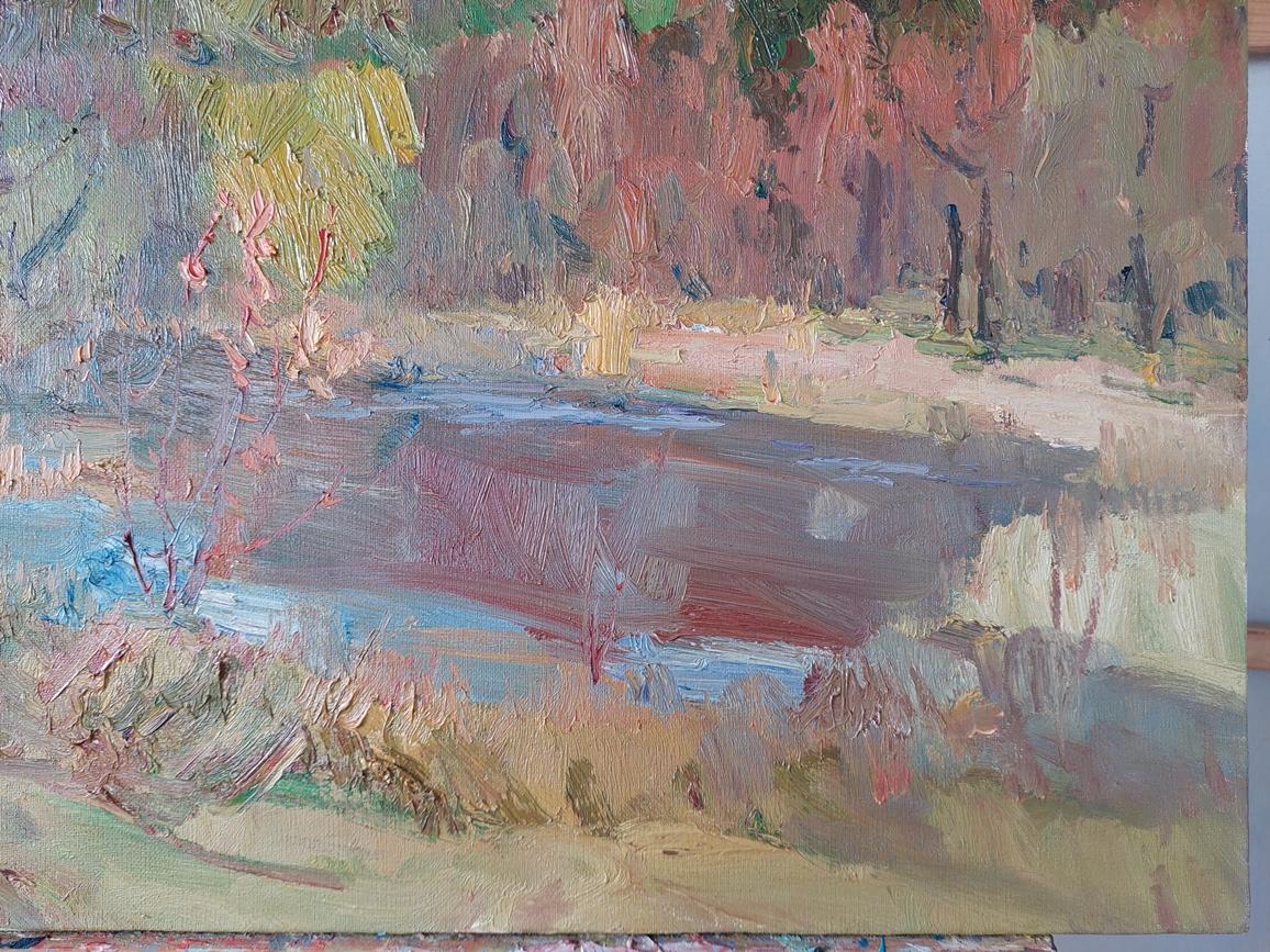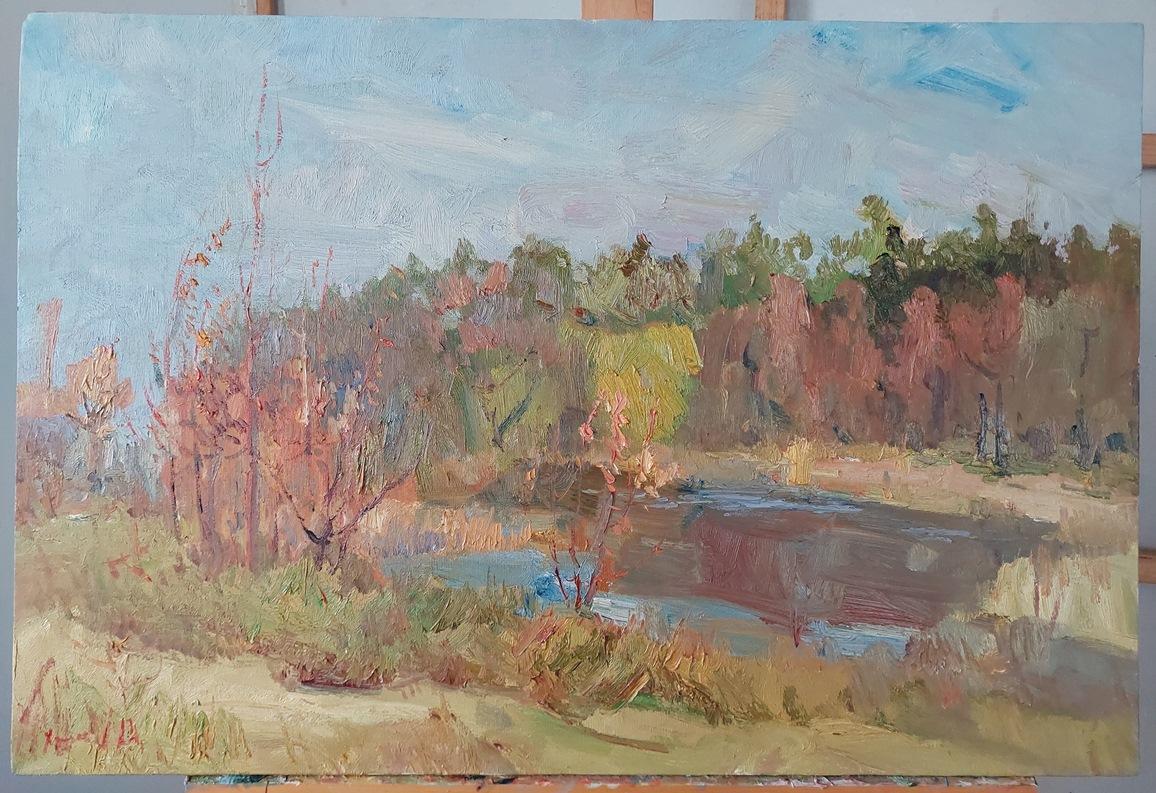 Ein kleines Pleinair-Gemälde, das nach dem Leben im Spätherbst in einer ruhigen Gegend mit Seen un...