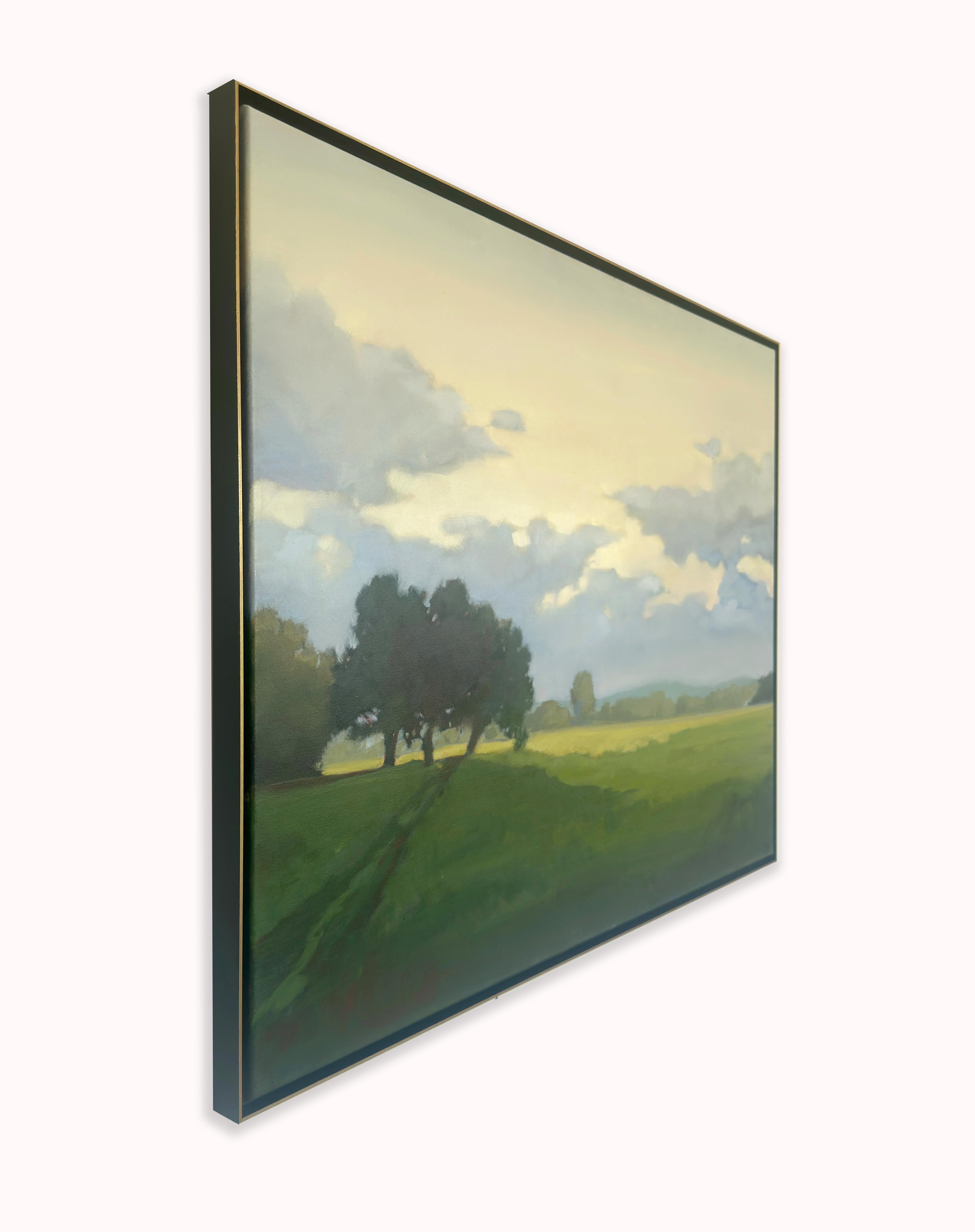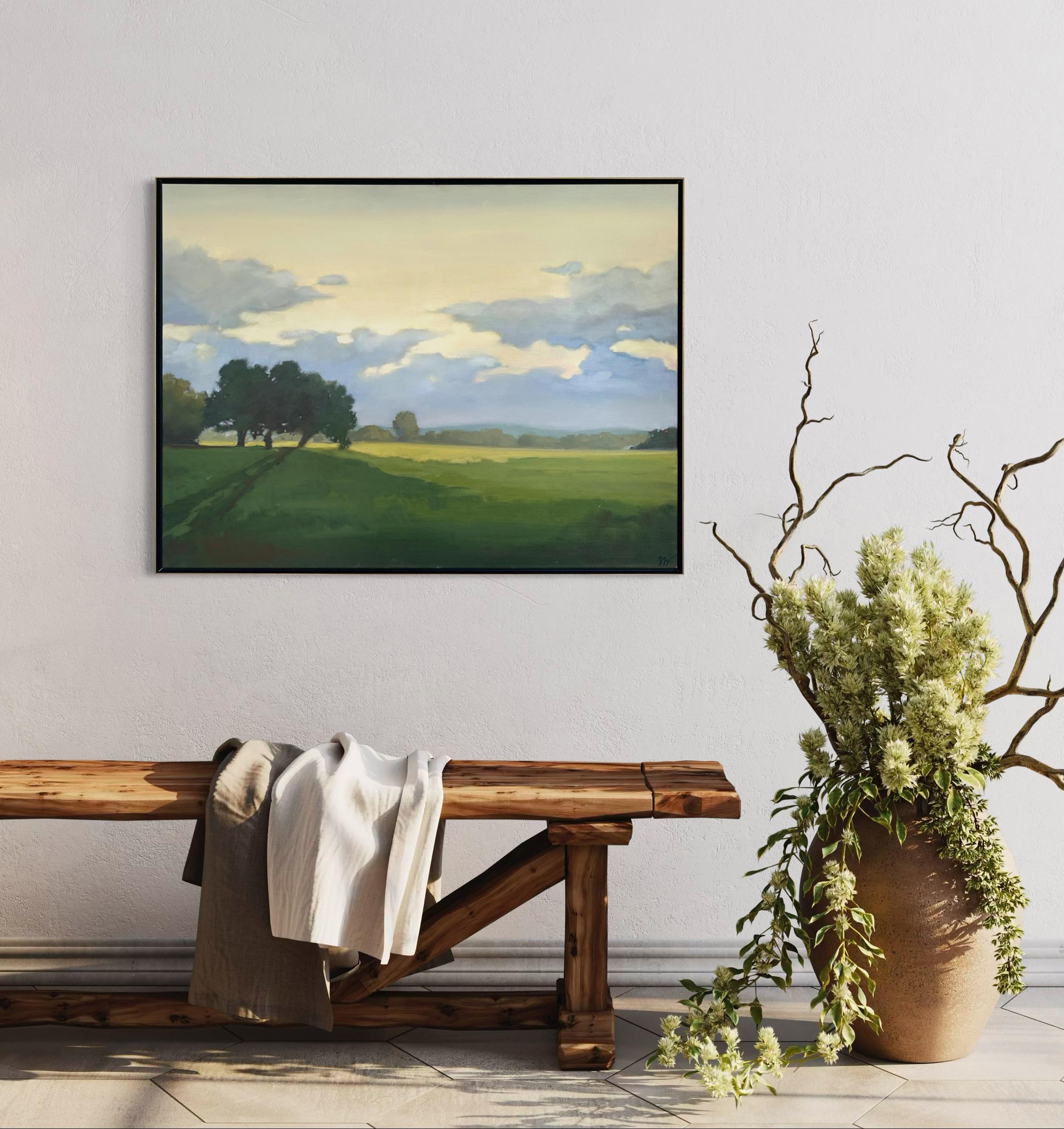Dieses Ölgemälde von Stephanie Johnson fängt einen Moment des Lichts in der Natur ein - eine goldene Lichtung, die sich unter einem stimmungsvollen Himmel abzeichnet. Durch das meisterhafte Gleichgewicht zwischen Licht und Schatten zieht die Komposition den Betrachter in eine weite, offene Wiese, während das Sonnenlicht durch die Wolken strömt und einen warmen Schein auf das Gras wirft. Die Bäume auf der linken Seite verankern das Werk in sattem, erdigem Grün, während der ausdrucksstarke Himmel darüber ein Gefühl von Veränderung und Atmosphäre vermittelt. Das in Öl gemalte und in einem schlanken goldenen Rahmen präsentierte Werk strahlt Ruhe, Erneuerung und stille Dramatik aus.