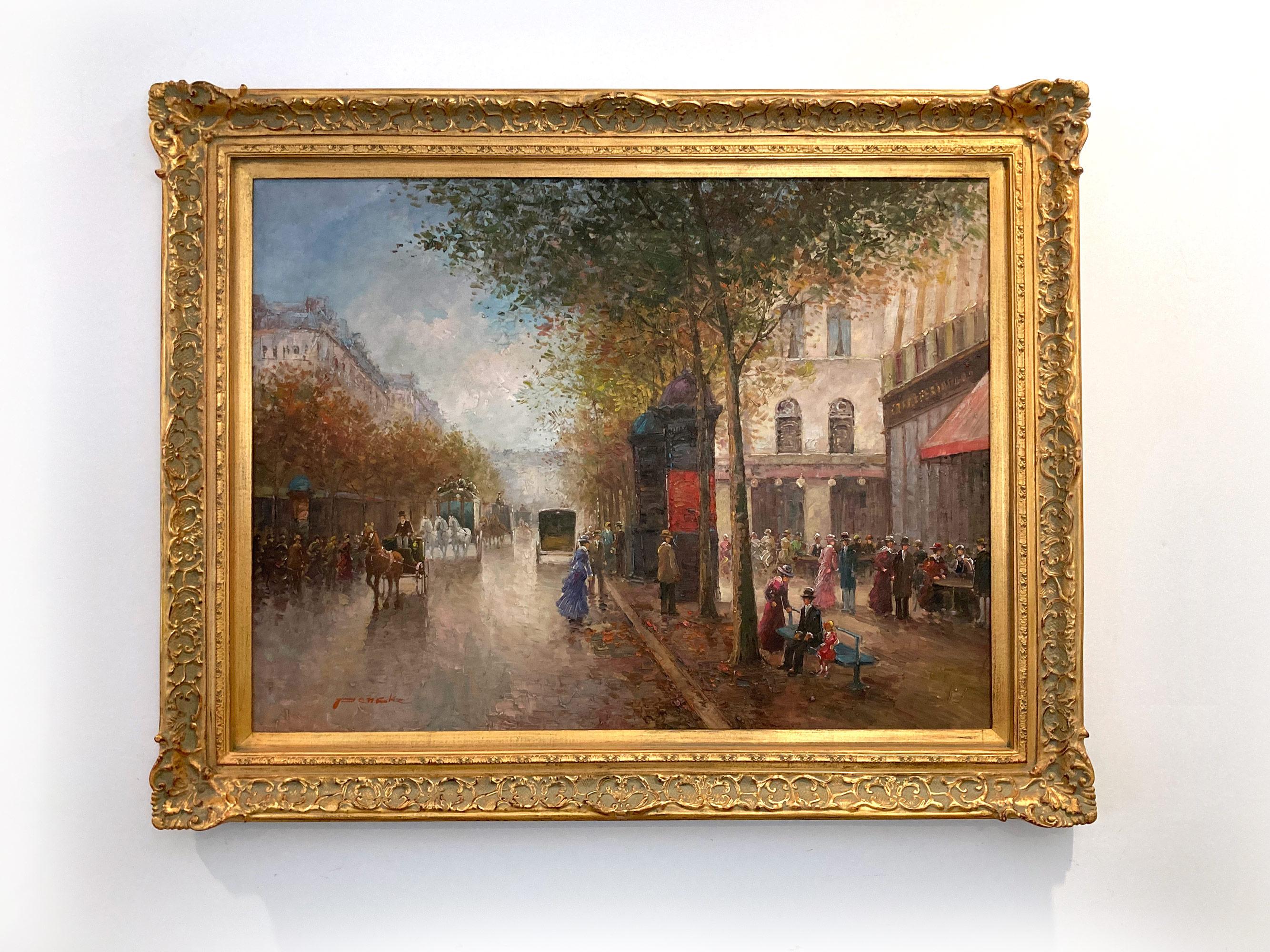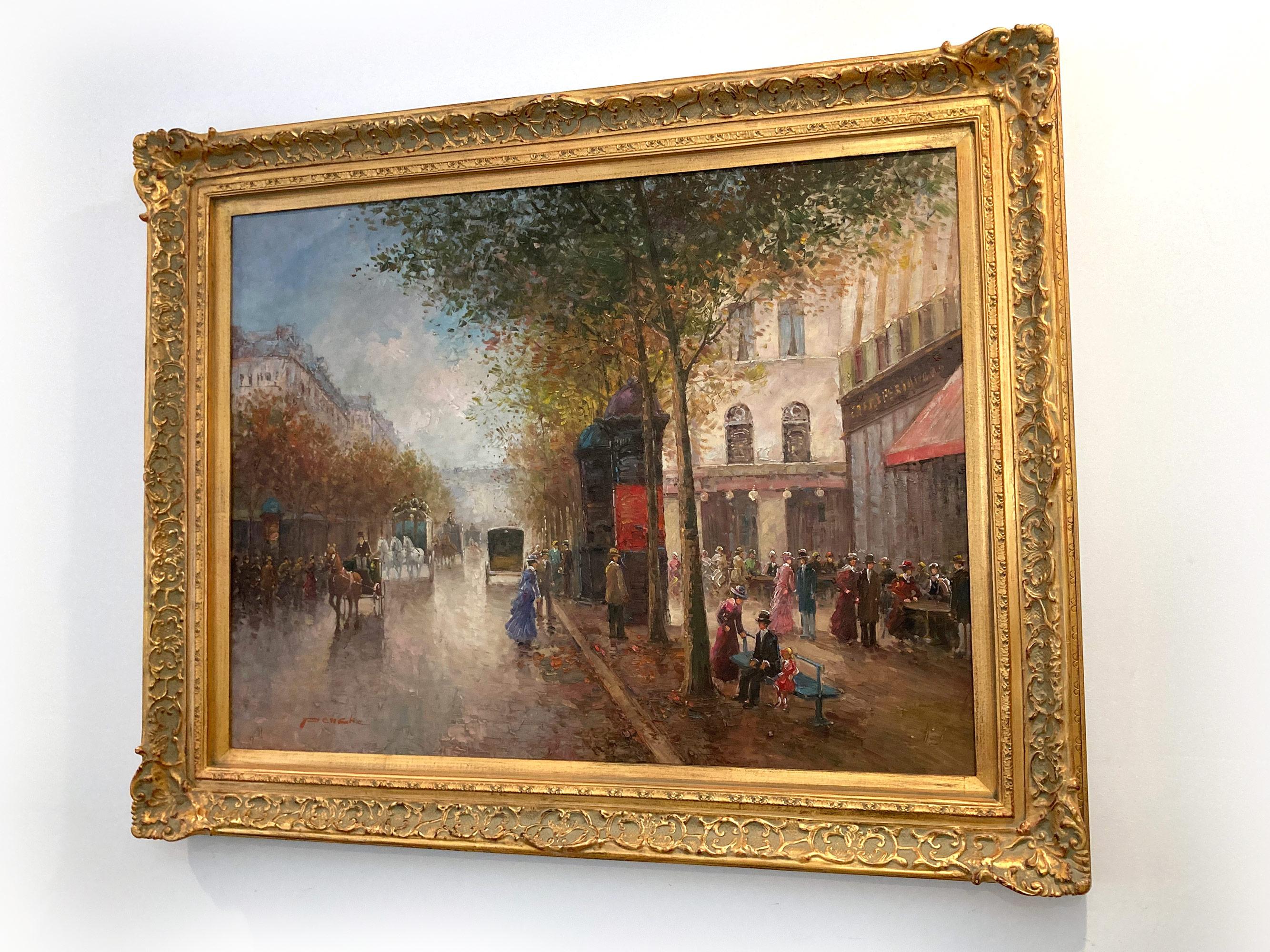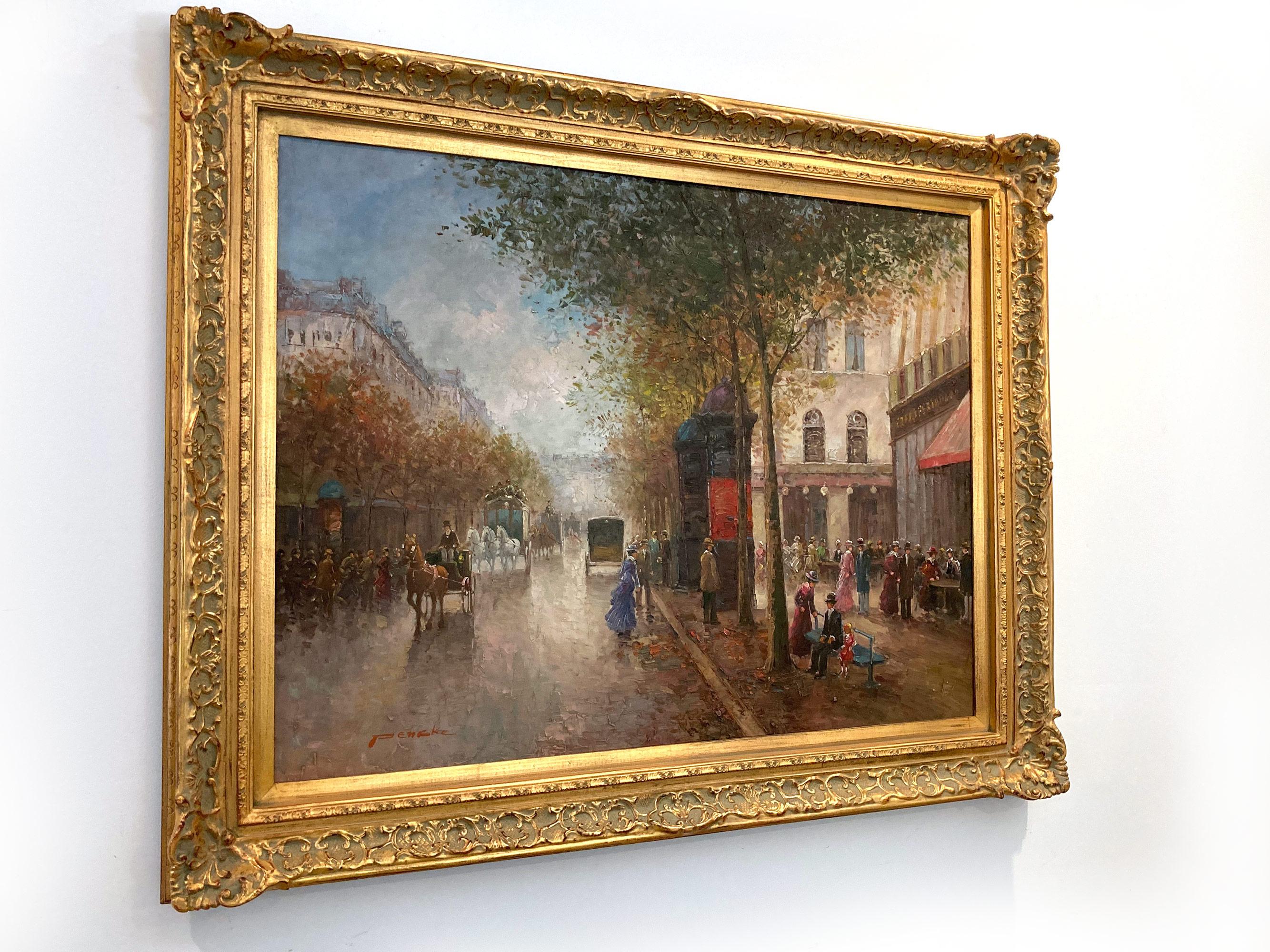 Ein schönes Ölgemälde auf Leinwand des französischen Künstlers Te Pencke. Pencke war ein Pariser Maler, der für seine farbenfrohen Stadtansichten bekannt war, die die Zeit seiner Generation darstellten. Seine Arbeiten sind vergleichbar mit denen von Jules Herve, Antoine Blanchard und Edouard Cortes. Dieses Gemälde ist ein wunderbares Beispiel für seine Arbeit in der Blütezeit seiner Karriere. Hier sehen Sie einen geschäftigen, warmen Tag mit Leben auf den Grands Boulevards von Paris. Zwischen den von Bäumen gesäumten Straßen sind die Menschen in Geschäften und Cafés verstreut, während Pferde und Kutschen entlangfahren. Die Details sind großartig, da Pencke die Architektur von Paris so schön einfängt; man kann die Energie des Tages und die Aufregung spüren. Das Gemälde ist unten links vom Künstler signiert und befindet sich in einem originalen verschnörkelten Goldrahmen mit Aufhängung auf der Rückseite, um es auszustellen.