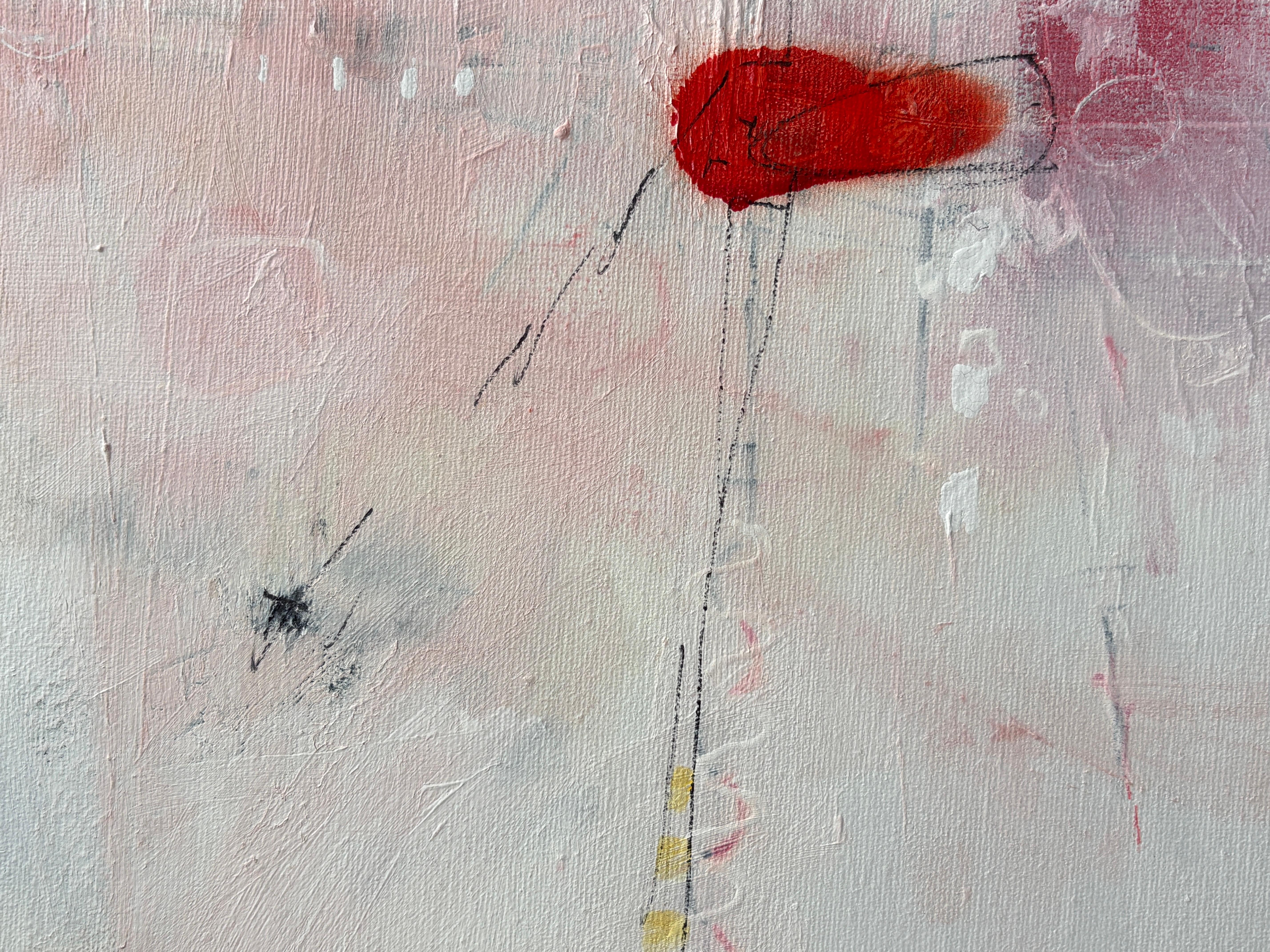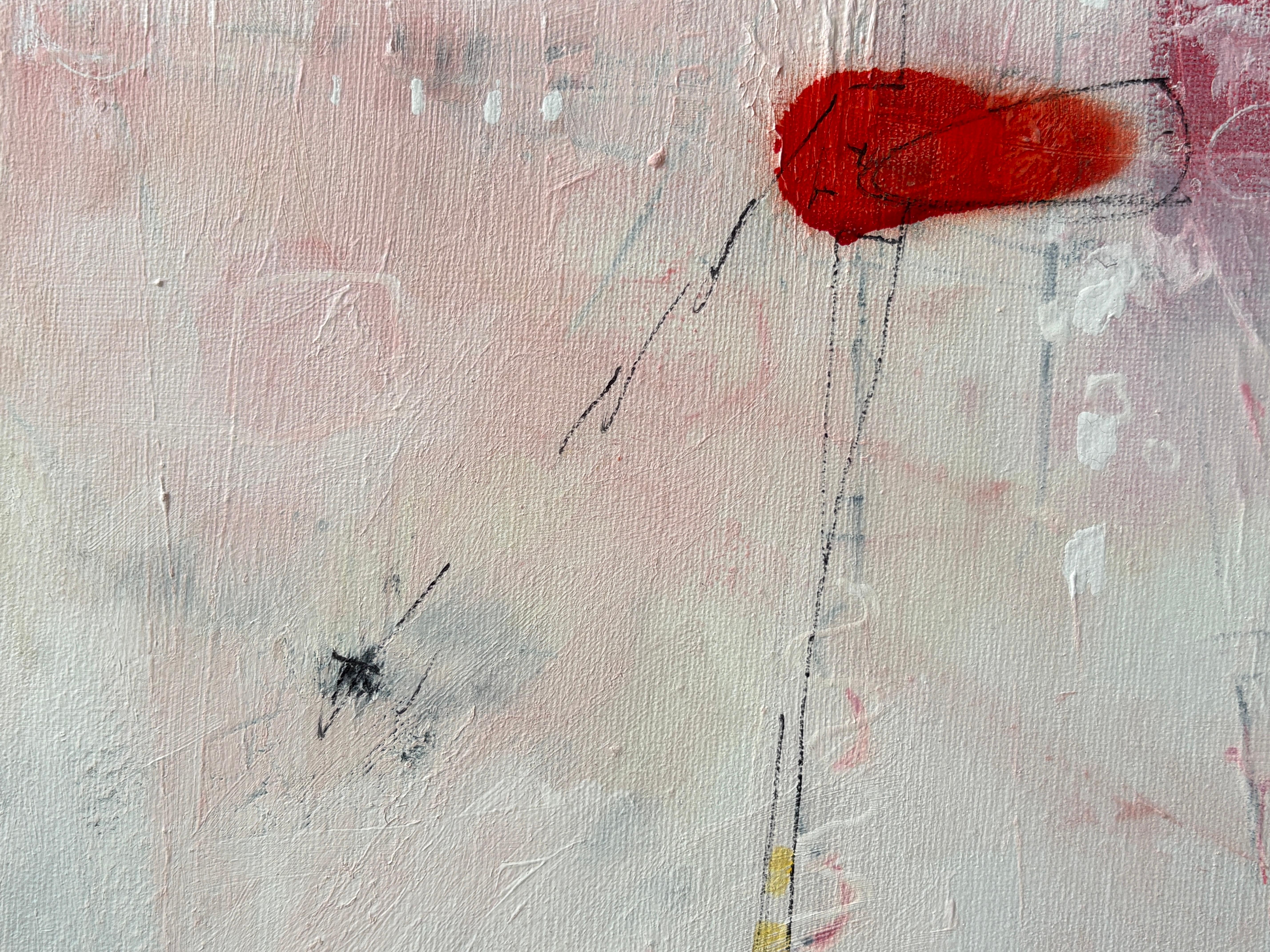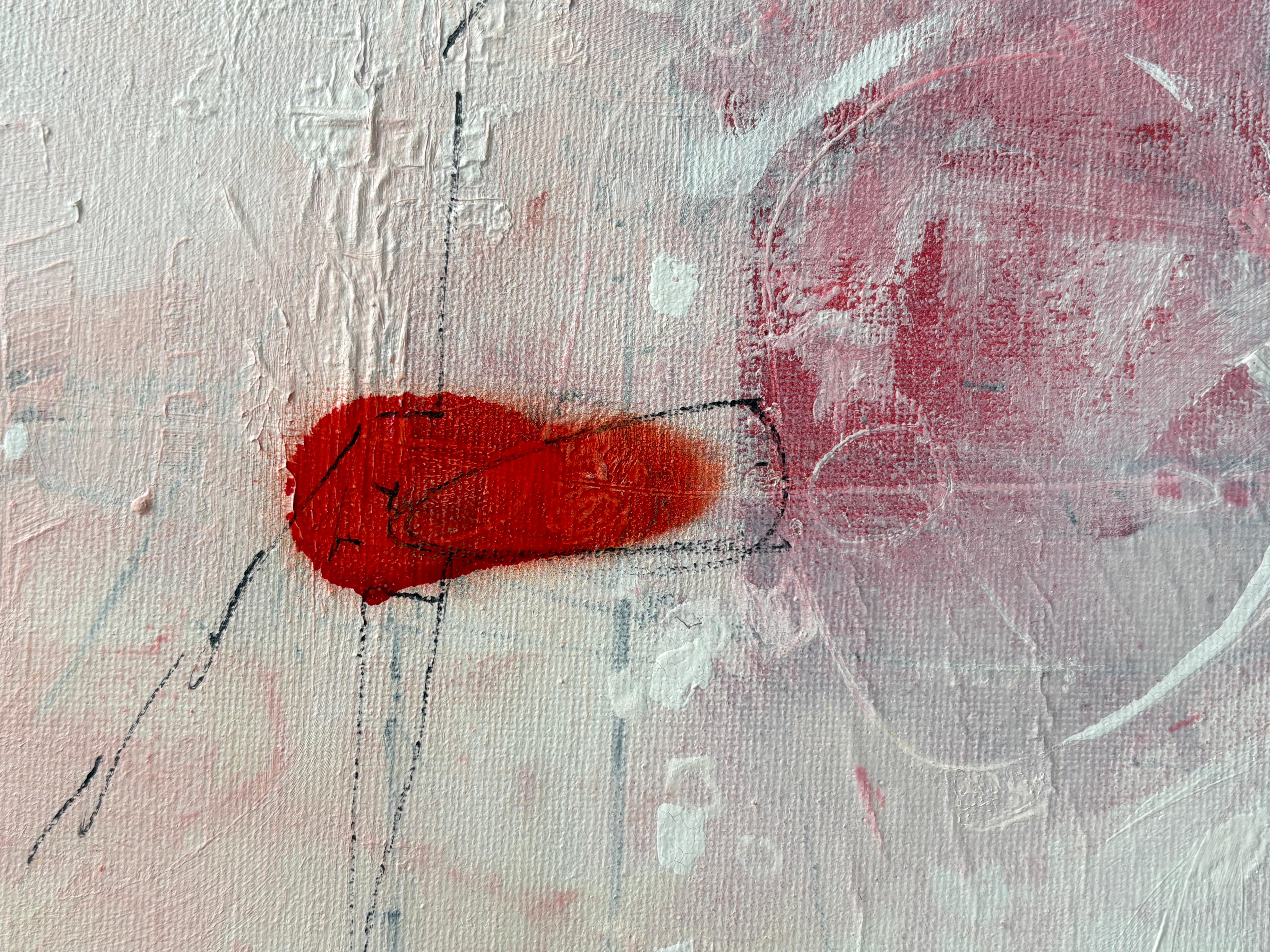In Zion Mors "Just Love" stehen hellere Farben im Vordergrund dieses Meisterwerks und rufen ein leichteres und helleres Gefühl hervor, ein Gefühl der Liebe. Eine blasse Leinwand wird durch sanfte Pinselstriche in Rot und Interpunktionen in leuchtendem Rot und Ocker zum Leben erweckt. Das zentrale rote Element, das fast an ein schwebendes Blütenblatt oder eine flüchtige Erinnerung erinnert, dient als Brennpunkt und zieht den Blick in seine weiche und doch kraftvolle Umarmung. Verstreute Linien und Markierungen suggerieren die Andeutung einer städtischen Kulisse oder vielleicht die Vergänglichkeit von Zeit und Erinnerung. Das Gemälde ist eine Symphonie der Subtilität und der Absicht und zeigt Mors Vorliebe, mathematische Präzision mit der unvorhersehbaren Schönheit des abstrakten Expressionismus zu verbinden.