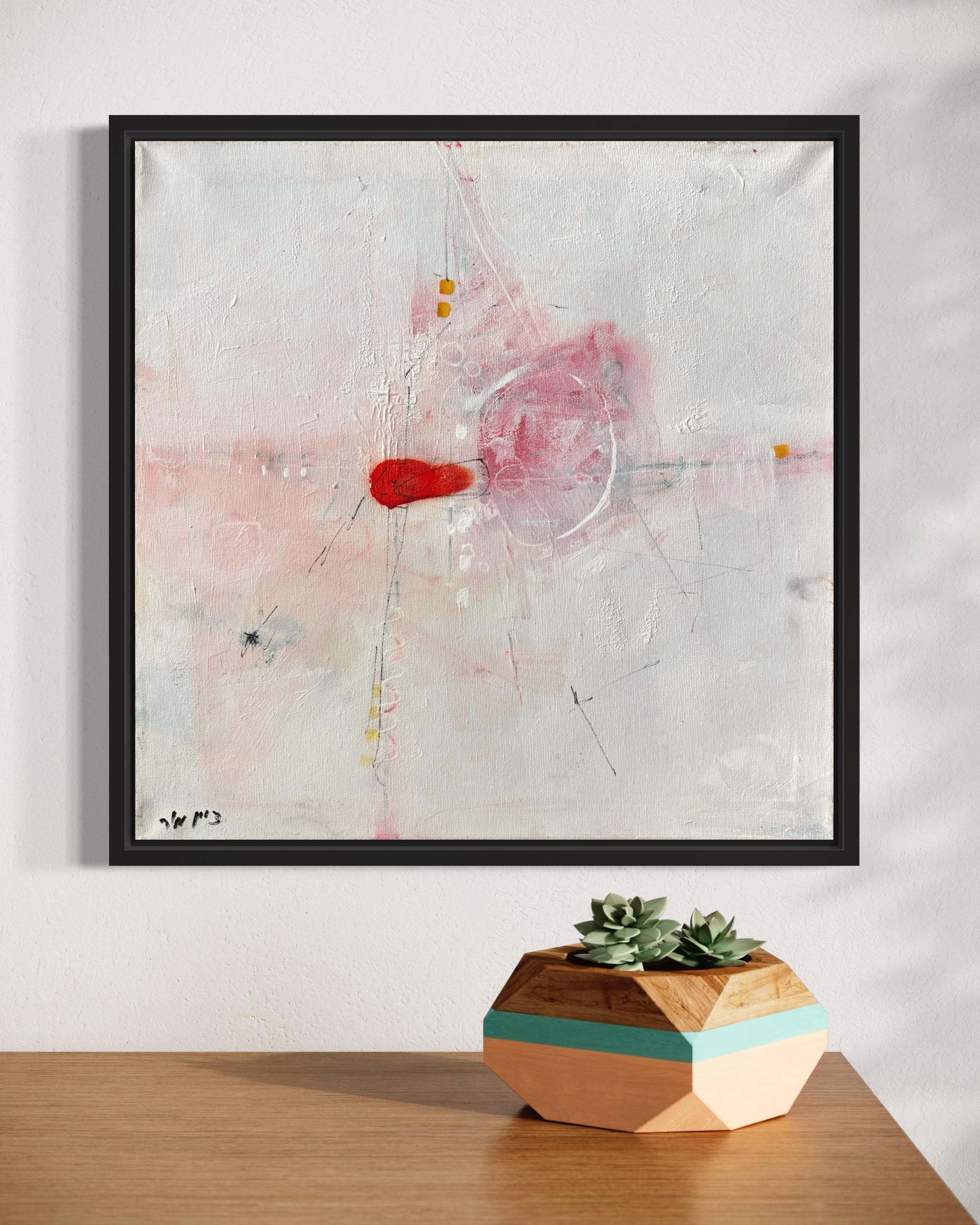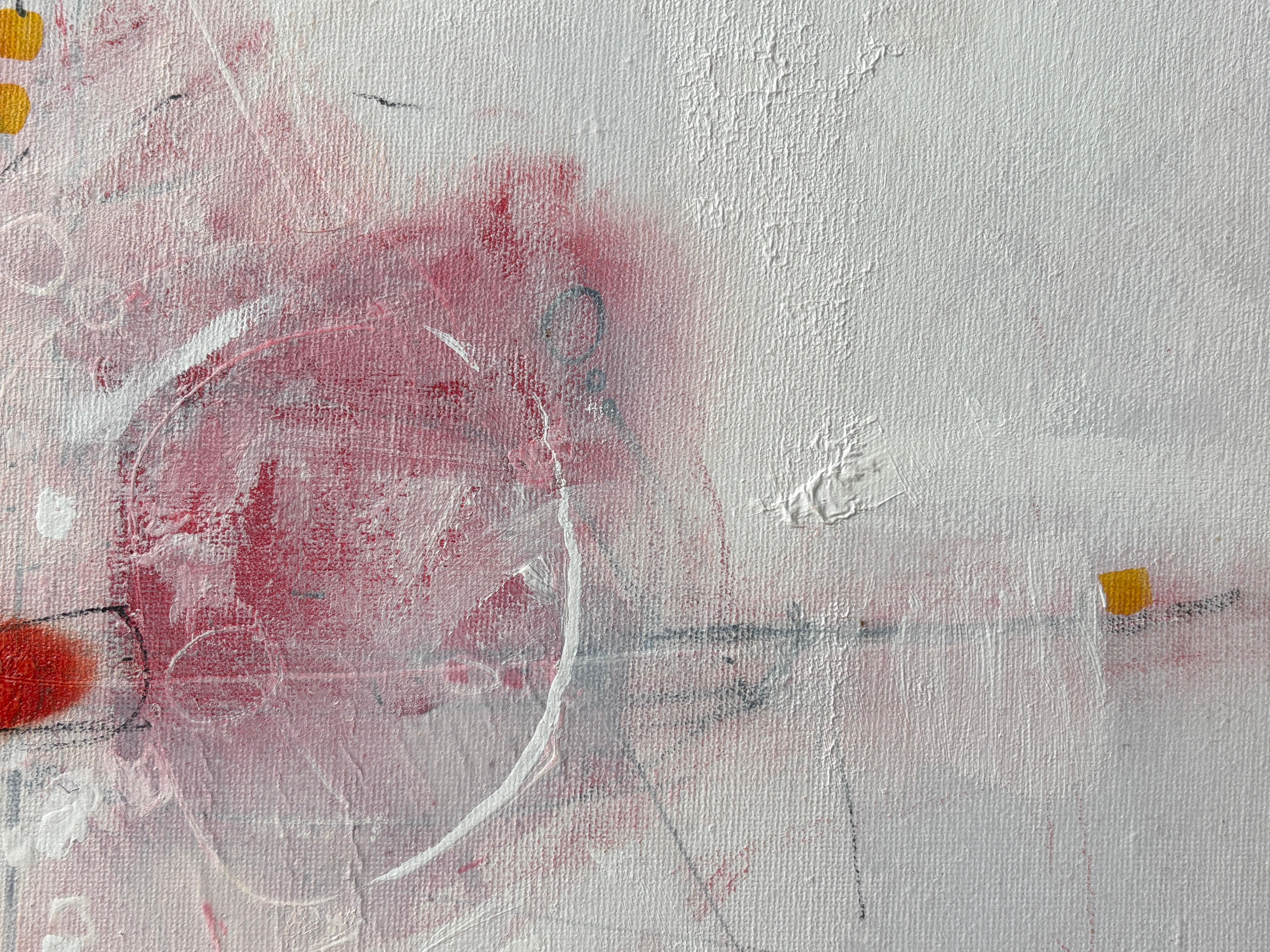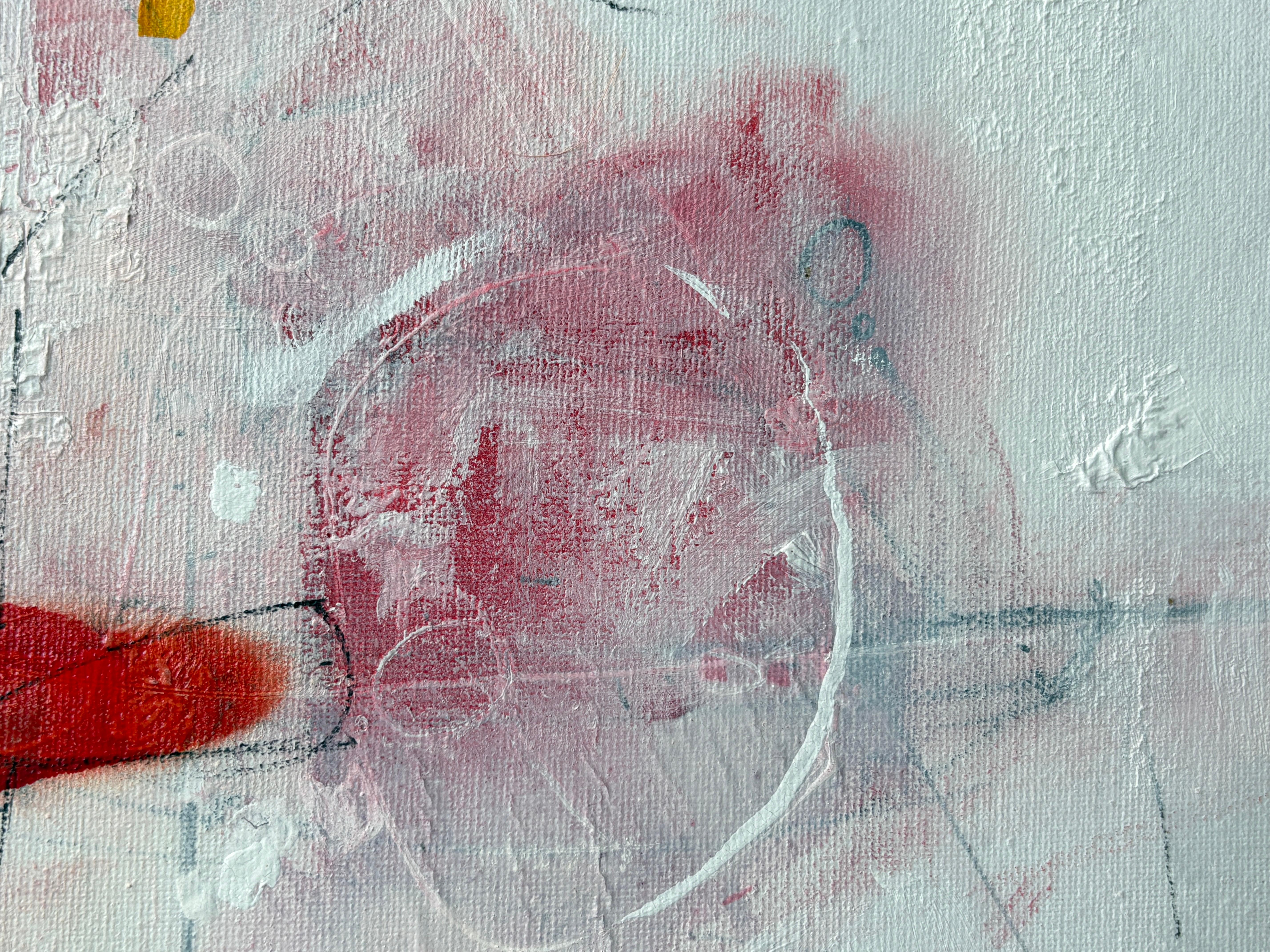 In Zion Mors "Just Love" stehen hellere Farben im Vordergrund dieses Meisterwerks und rufen ein leichteres und helleres Gefühl hervor, ein Gefühl der Liebe. Eine blasse Leinwand wird durch sanfte Pinselstriche in Rot und Interpunktionen in leuchtendem Rot und Ocker zum Leben erweckt. Das zentrale rote Element, das fast an ein schwebendes Blütenblatt oder eine flüchtige Erinnerung erinnert, dient als Brennpunkt und zieht den Blick in seine weiche und doch kraftvolle Umarmung. Verstreute Linien und Markierungen suggerieren die Andeutung einer städtischen Kulisse oder vielleicht die Vergänglichkeit von Zeit und Erinnerung. Das Gemälde ist eine Symphonie der Subtilität und der Absicht und zeigt Mors Vorliebe, mathematische Präzision mit der unvorhersehbaren Schönheit des abstrakten Expressionismus zu verbinden.