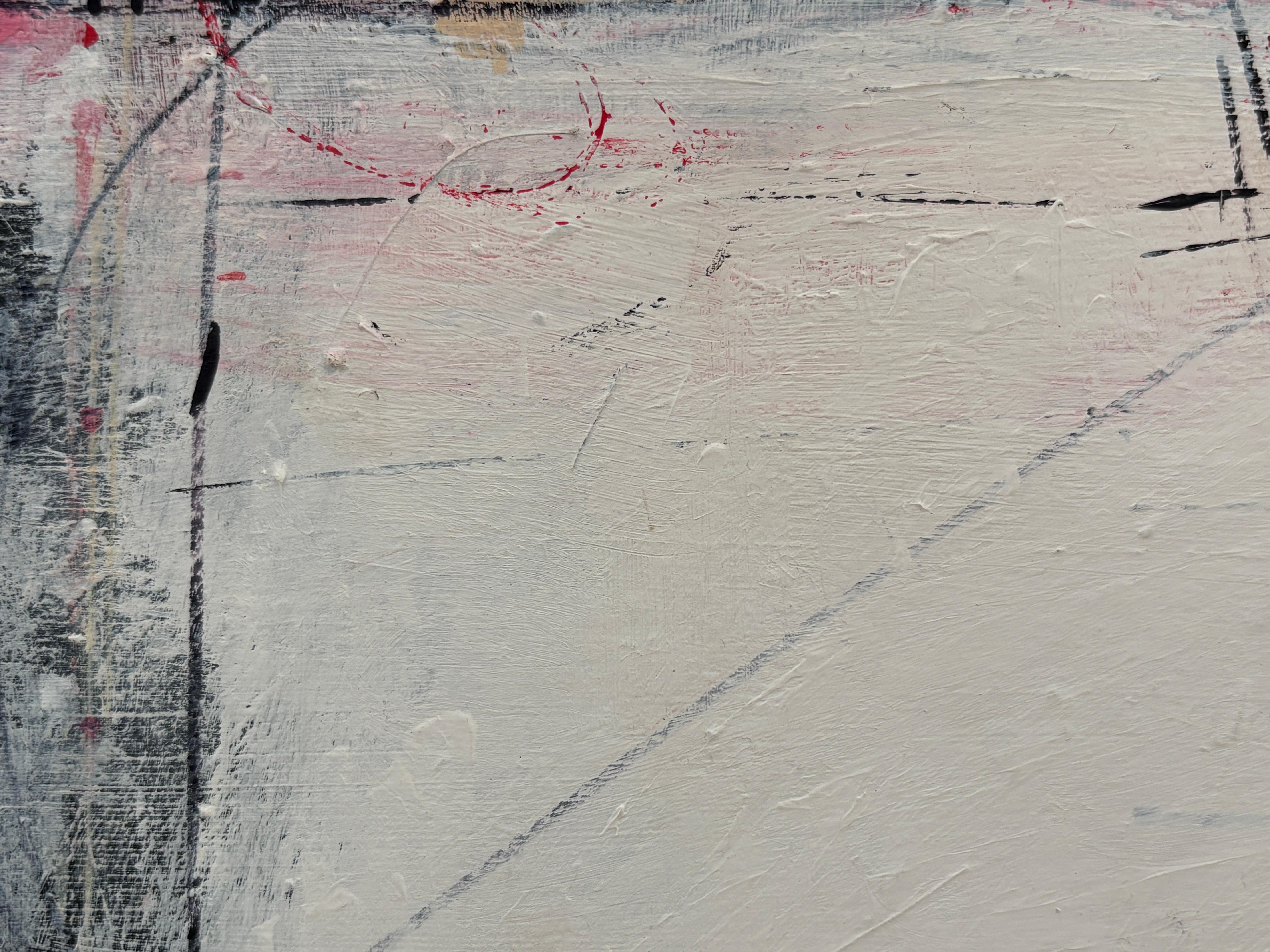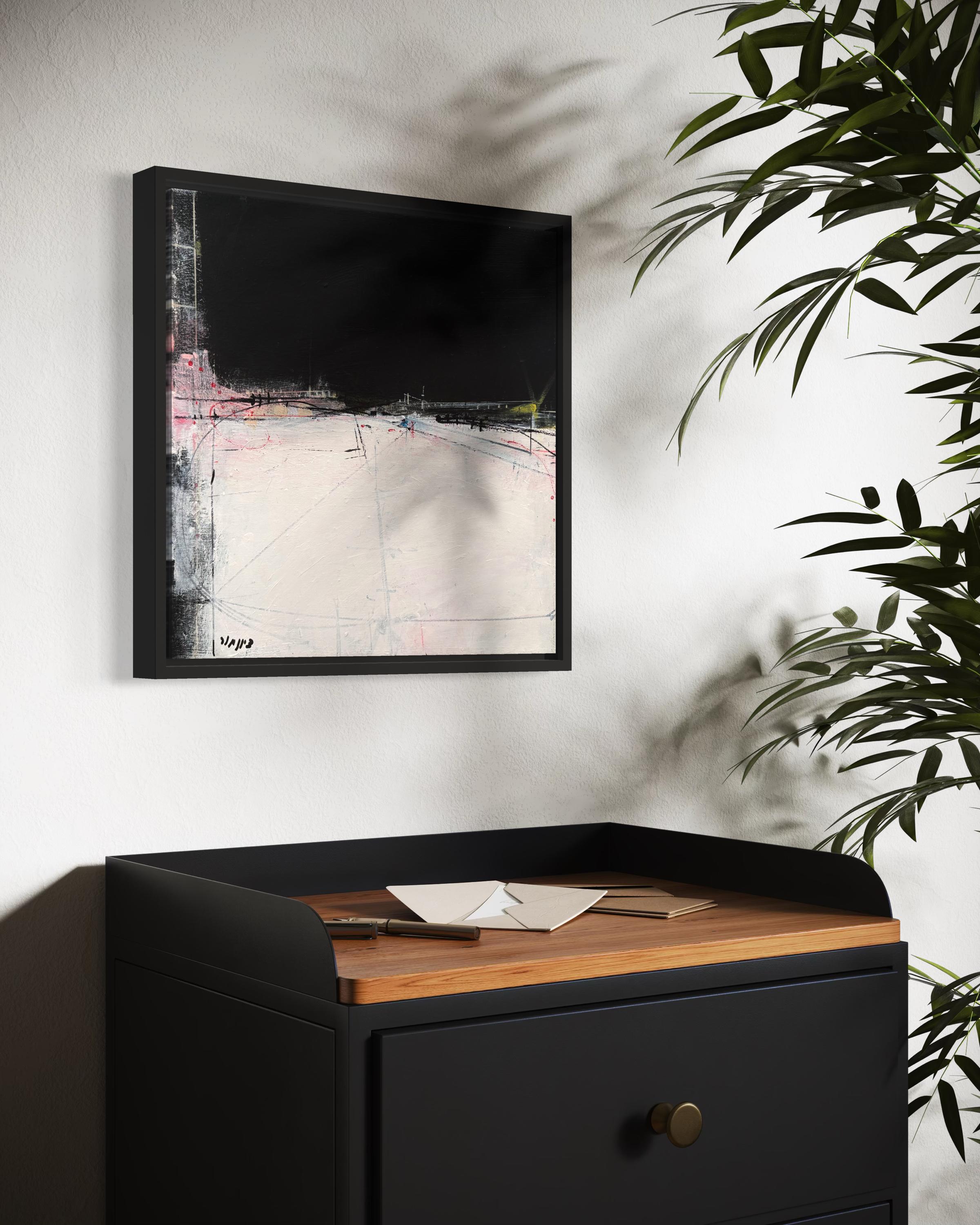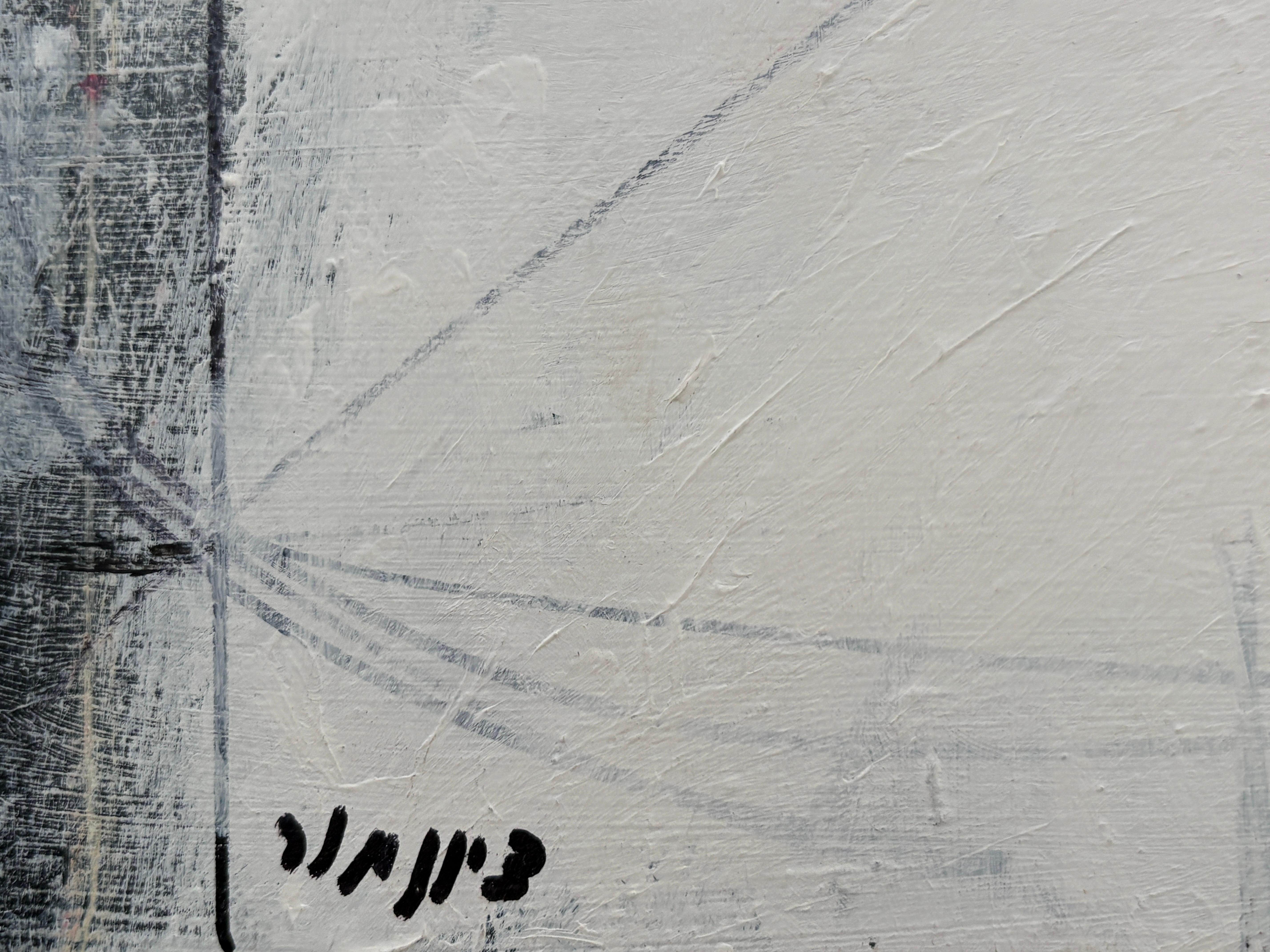 Dieses 14" x 14" große Meisterwerk von Zion Mor trägt den Titel "Mystery" und entführt den Betrachter in eine rätselhafte urbane Welt, gemalt mit abstrakter expressionistischer Finesse. Das Kunstwerk spielt elegant mit starken Kontrasten und zeigt ein reiches Wechselspiel zwischen einer zarten pastellfarbenen Leinwand auf der linken Seite und einer tiefdunklen Fläche auf der rechten Seite. Zarte Kratzer, Tropfen und Linien, die möglicherweise urbane Strukturen und flüchtige menschliche Interaktionen andeuten, durchziehen den hellen Teil der Leinwand und sorgen für zusätzliche Faszination. Eine kühne vertikale Teilung, akzentuiert durch rote Flecken und gelbe Streifen, fungiert als symbolische Brücke zwischen zwei gegensätzlichen Welten oder vielleicht Geisteszuständen. Mors Engagement für die Abstraktion schimmert durch, doch seine Vorliebe für die Einbettung subtiler Hinweise aus der greifbaren Welt sorgt für eine Tiefe, die zu längerem Nachdenken anregt. "Mystery" verkörpert Mors einzigartige Mischung aus mathematischer Präzision und intuitiver Kreativität und stellt eine visuelle Symphonie dar, die sowohl das Herz als auch den Verstand anspricht.