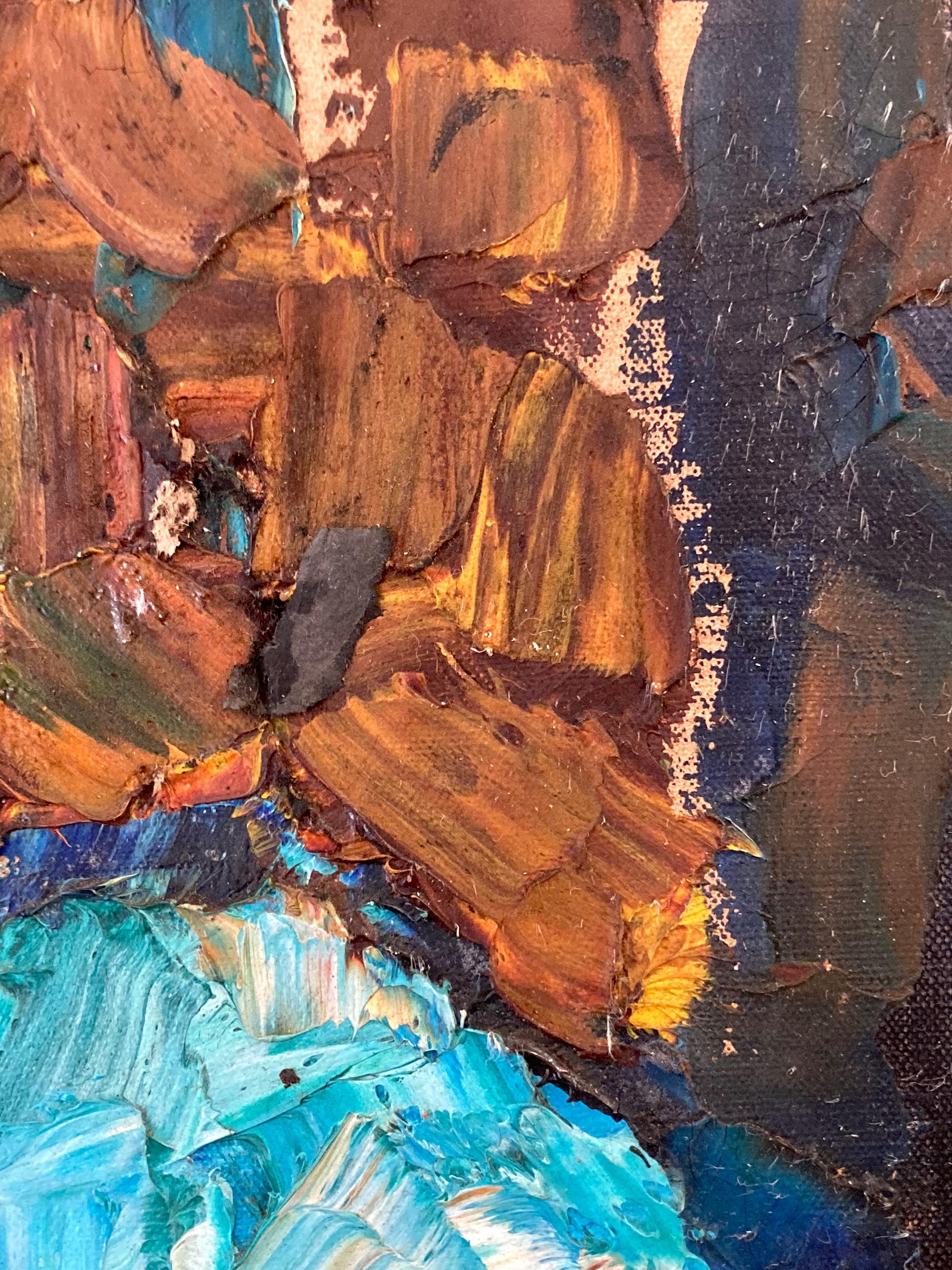 - Zustand:Das Gemälde präsentiert sporadische craquelure durch die Leinwand und gewöhnlichen Verschleiß von Alter. Der Rahmen weist auch Chips und kleinere altersbedingte Unvollkommenheiten auf.