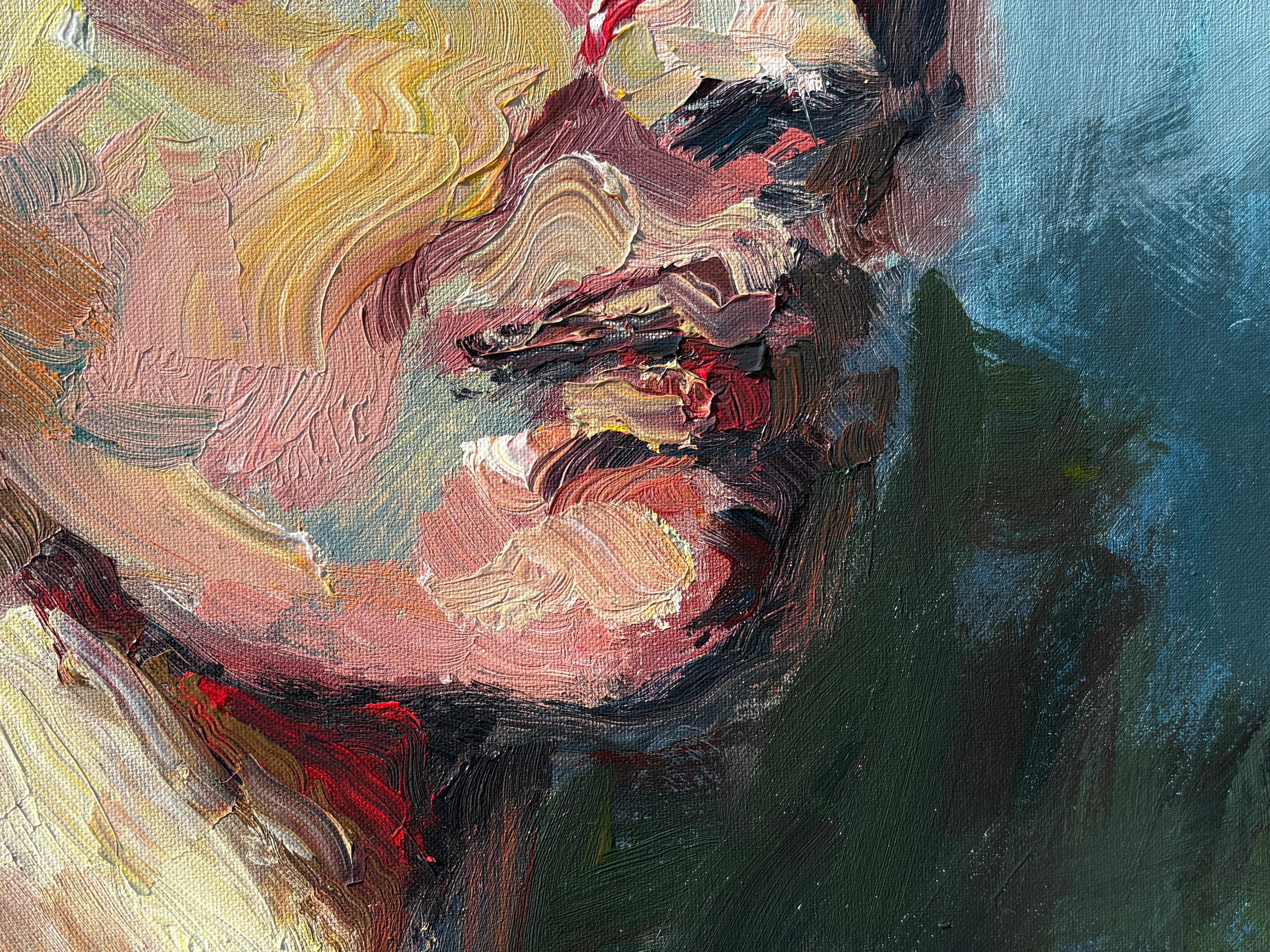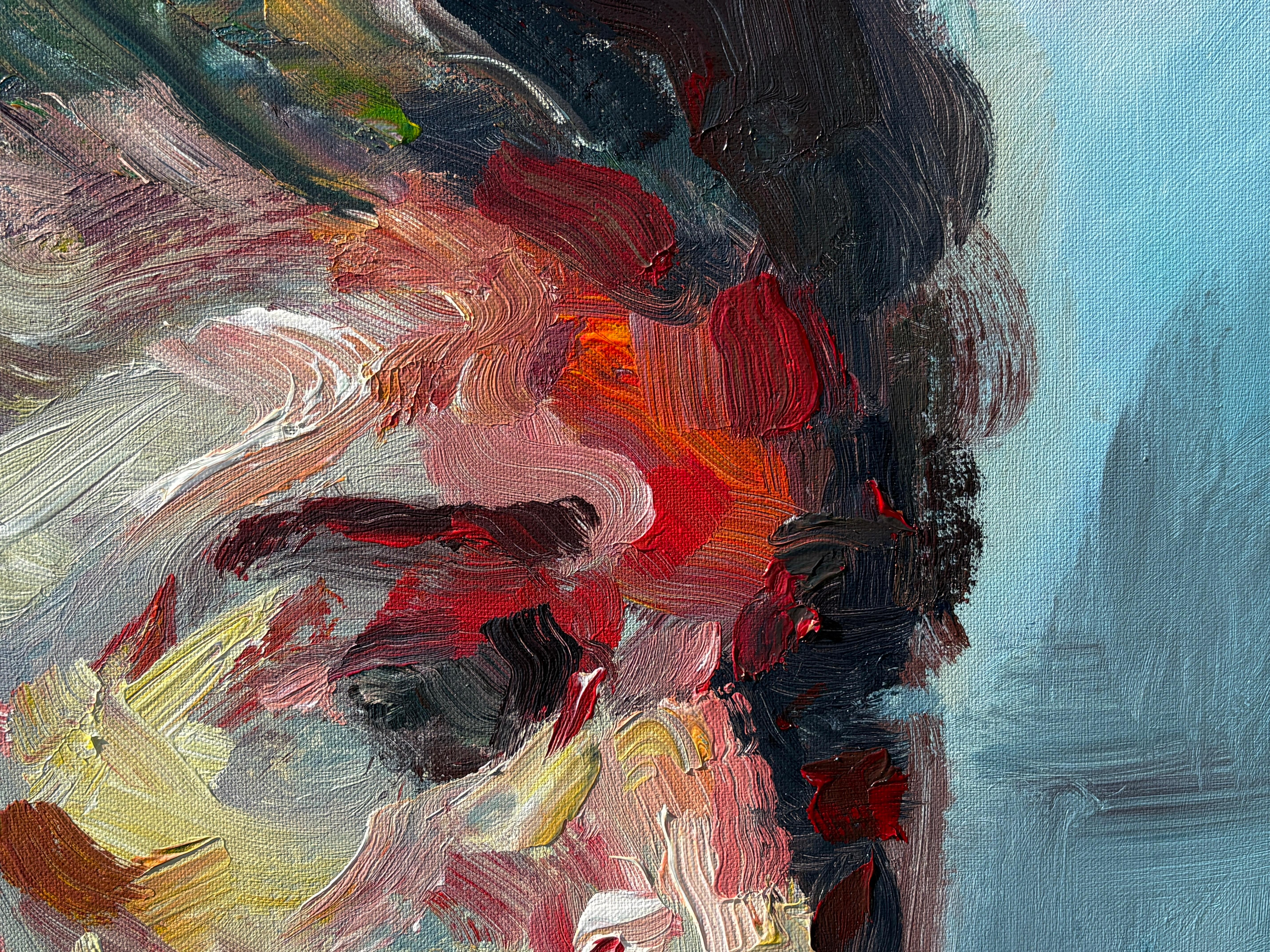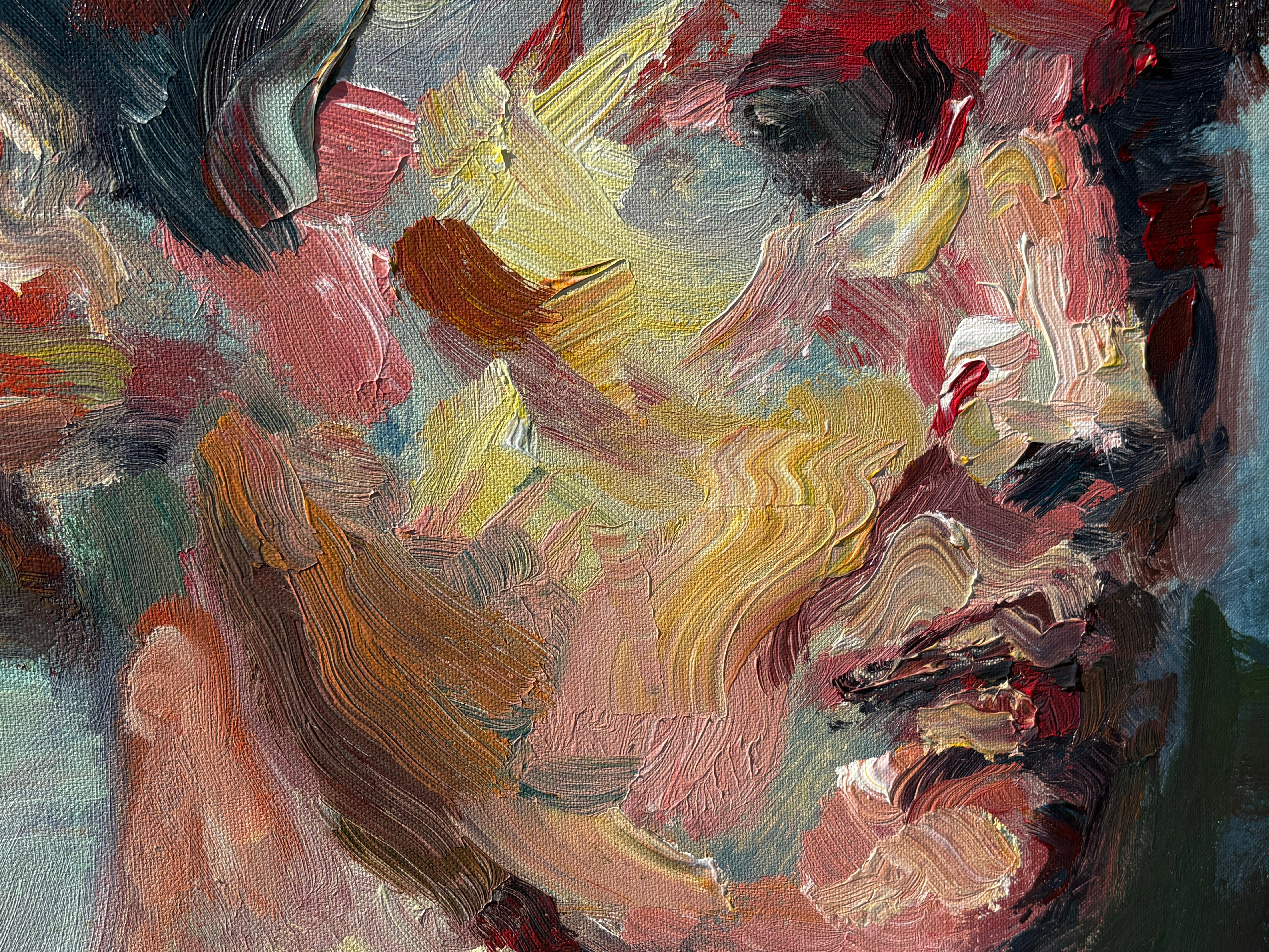 Dieser Neuzugang aus Masris aktueller Kollektion strahlt eine rohe Intensität und emotionale Tiefe aus und fängt die wechselnden Strömungen des menschlichen Ausdrucks ein. Mit bloßen Händen gemalt - mit Daumen, Handflächen und Fingerspitzen - strahlt das Porträt eine viszerale Energie aus, die Pinsel niemals vermitteln könnten. Kühne Pinselstriche in Karminrot, Ocker und Schatten verflechten sich im Gesicht der Figur und suggerieren sowohl Verletzlichkeit als auch Stärke. Dieses zeitgenössische Ölgemälde verwischt die Grenze zwischen Porträt und Expressionismus und bietet eine kraftvolle Erkundung des menschlichen Geistes.