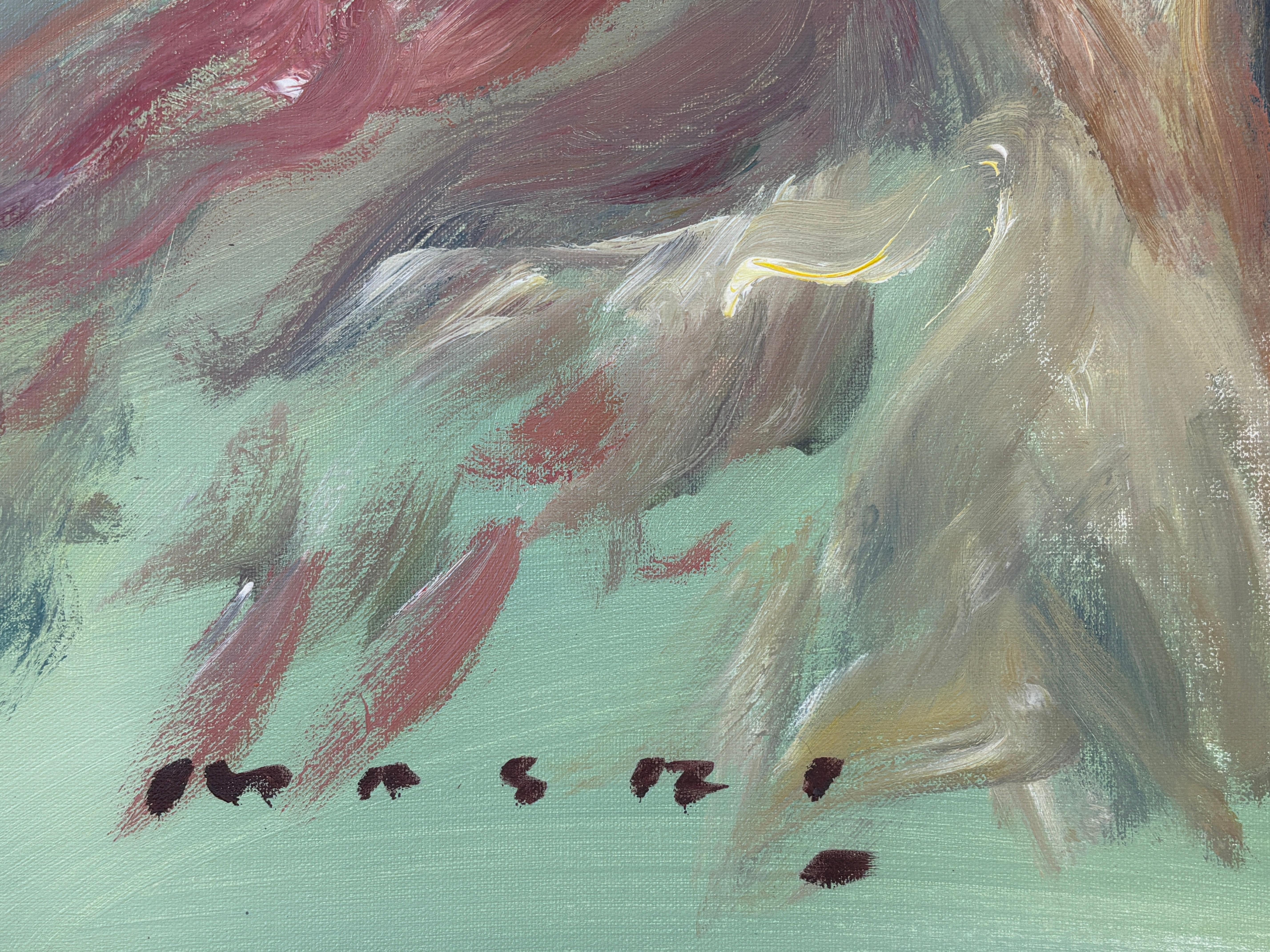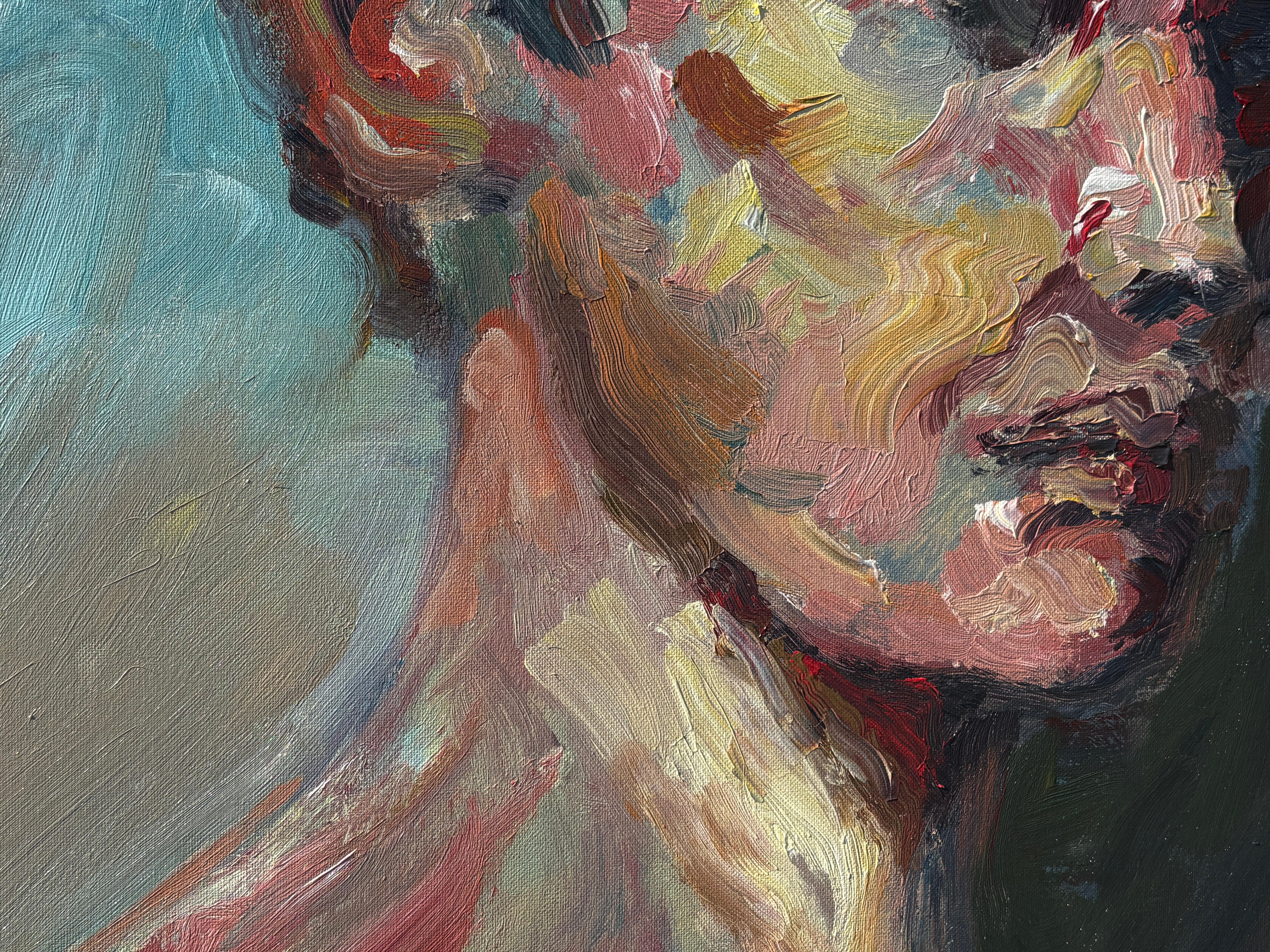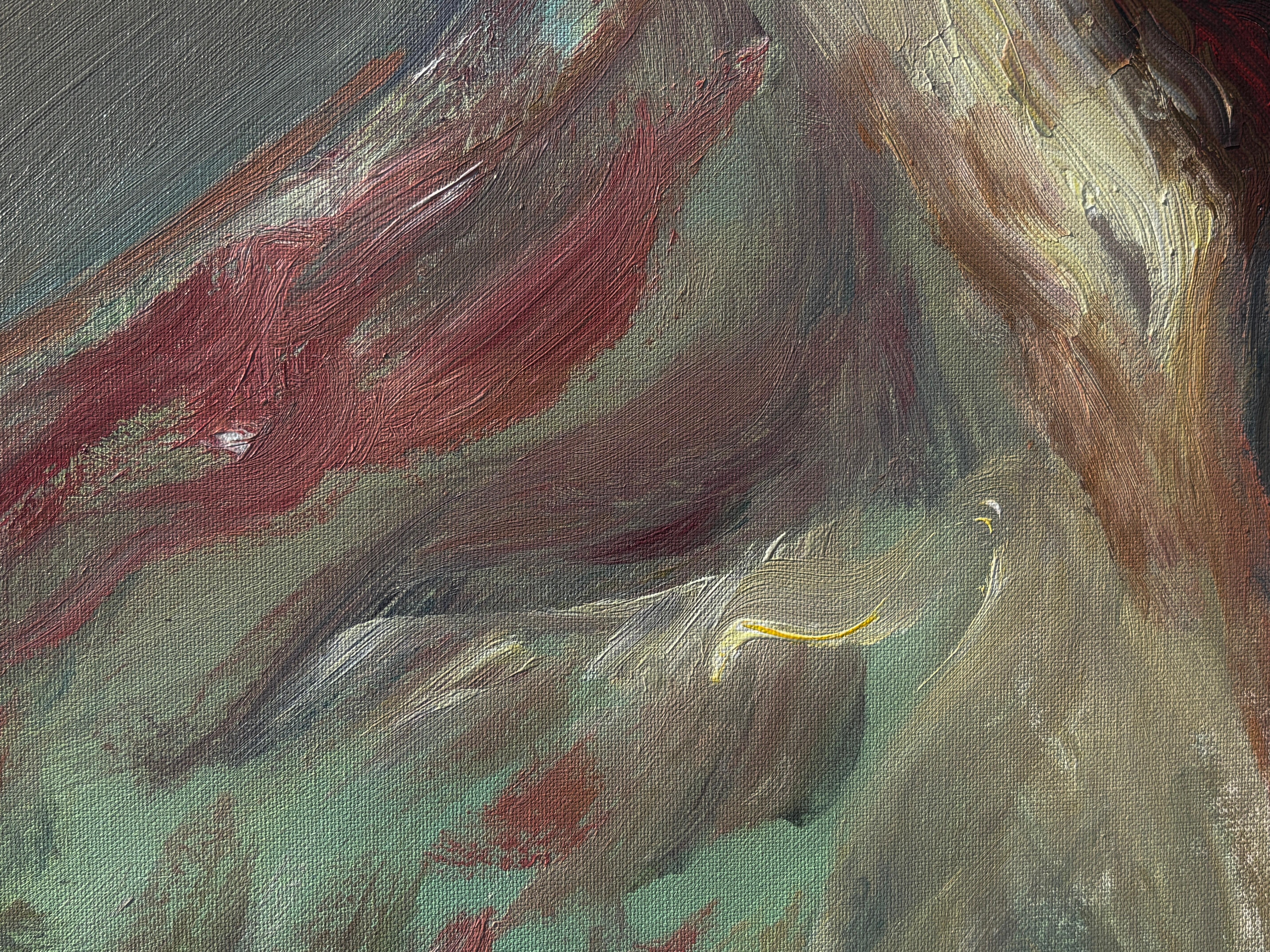 Dieser Neuzugang aus Masris aktueller Kollektion strahlt eine rohe Intensität und emotionale Tiefe aus und fängt die wechselnden Strömungen des menschlichen Ausdrucks ein. Mit bloßen Händen gemalt - mit Daumen, Handflächen und Fingerspitzen - strahlt das Porträt eine viszerale Energie aus, die Pinsel niemals vermitteln könnten. Kühne Pinselstriche in Karminrot, Ocker und Schatten verflechten sich im Gesicht der Figur und suggerieren sowohl Verletzlichkeit als auch Stärke. Dieses zeitgenössische Ölgemälde verwischt die Grenze zwischen Porträt und Expressionismus und bietet eine kraftvolle Erkundung des menschlichen Geistes.