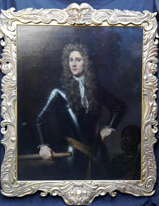 Nicolaes MaesPorträt von Oberst Rupert Bridge in Rüstung mit einem schwarzen Pagen - Niederländisch 17.CIRCA 1680