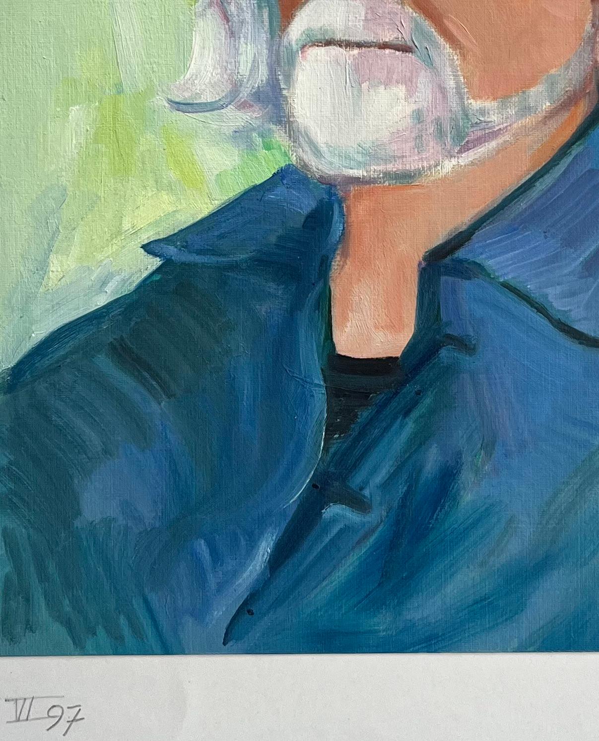 Beschreibung: Dieses eindrucksvolle Porträt von Roland Pichard zeigt einen reifen Herrn mit wallendem weißen Haar und Brille, der eine ruhige und nachdenkliche Haltung ausstrahlt. Die dynamische Verwendung von Blautönen in der Kleidung des Motivs durch den Künstler bildet einen schönen Kontrast zum sanften Grün des Hintergrunds, wodurch eine harmonische und dennoch auffällige Komposition entsteht.