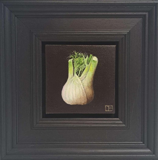 Pocket Green Fig 3c ist ein Original-Ölgemälde von Dani Humberstone als Teil ihrer Pocket-Painting-Serie, die realistische Ölgemälde in kleinem Maßstab mit einer Anspielung auf die b...