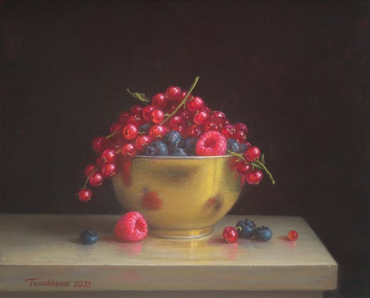 Die verstreuten Kirschen auf der Metallplatte bilden einen lebhaften Kontrast zum weißen Tischtuch und lenken den Blick des Betrachters auf die Mitte der Komposition. Die verschiedenen Rot- und Gelbtöne und die Wahl der Details ermöglichten es, die Schönheit dieser Beeren zu vermitteln. Das verwendete Medium ist Öl auf Leinwand, das es erlaubt, die lebendigen Farben, die zarte Textur und das Spiel des Lichts auf dem Motiv einzufangen. Das Werk ist in mehreren Schichten gemalt. Der Stil des Gemäldes ist von den holländischen Meistern des 17. Jahrhunderts inspiriert. Zeitgenössisches Blumenstillleben in realistischem Stil.
