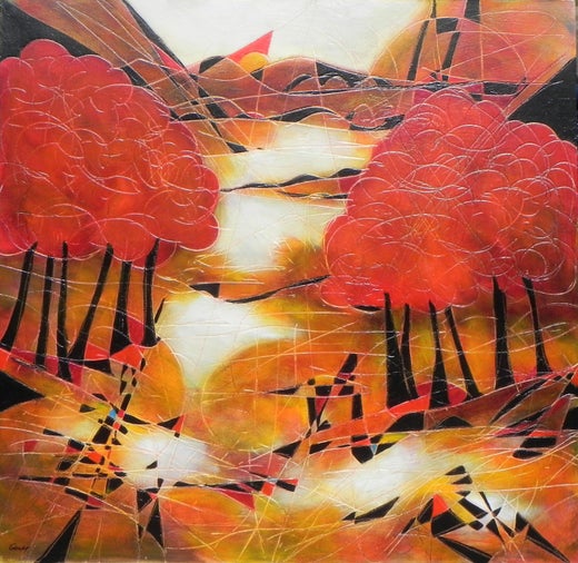"Nouveau Paysage" ist ein Originalgemälde in Öl auf Karton mit den Maßen 48x48 Zoll und wird ungerahmt geliefert. Gaugy verwendet in diesem zeitgenössischen Gemälde seine strukturier...