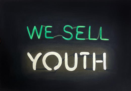 Zeitgenössisches modernistisches Neonschild Trompe L'Oeil Stillleben "Wir verkaufen Jugend"