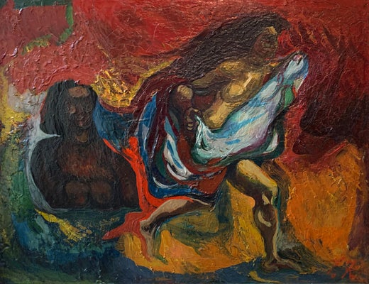 Das "Rote Stillleben" ist ein Innenraumstillleben des in Philadelphia geborenen expressionistischen Malers Bernard Harmon. Das 28,25" x 24,25" große Ölgemälde auf Karton ist in einem...