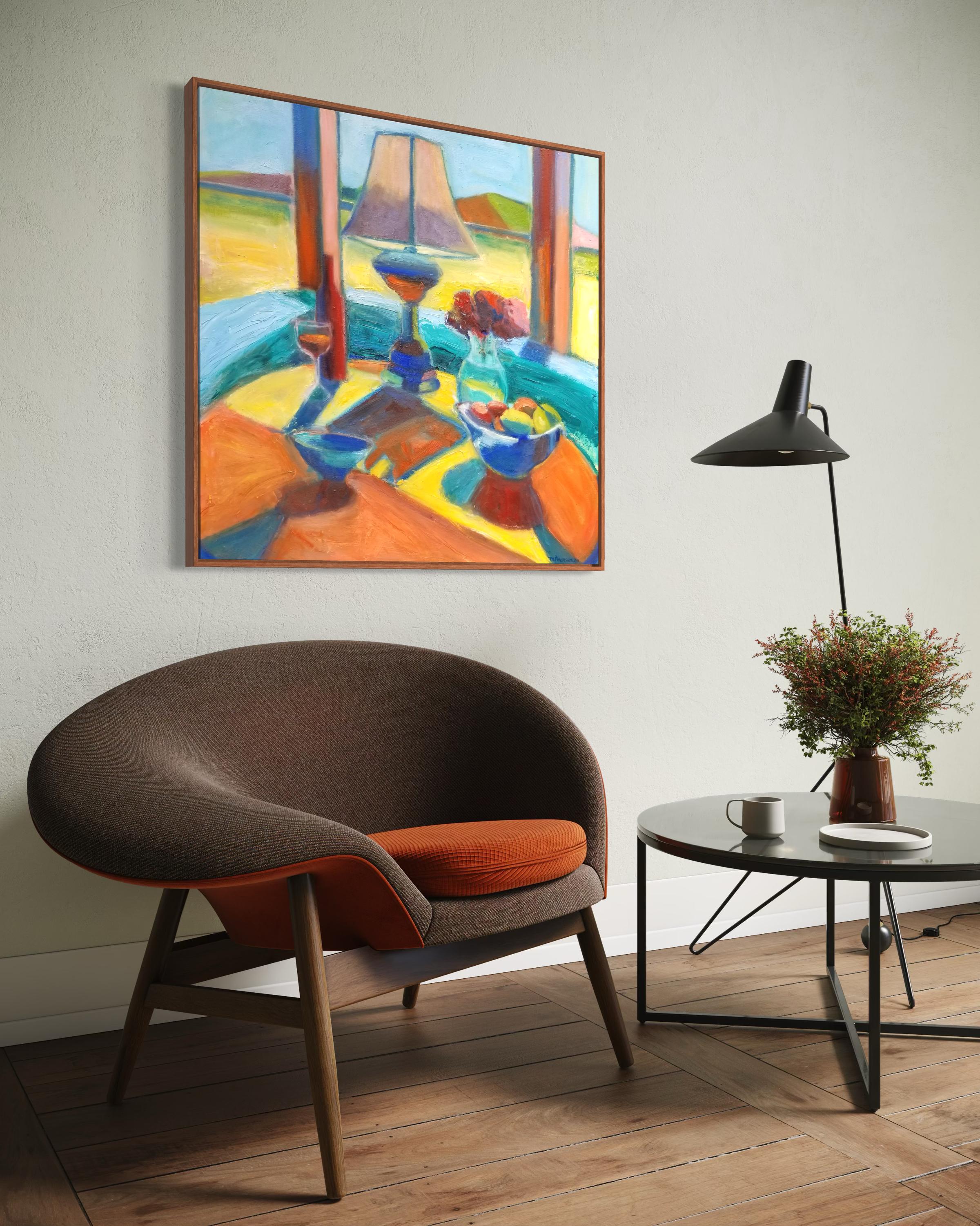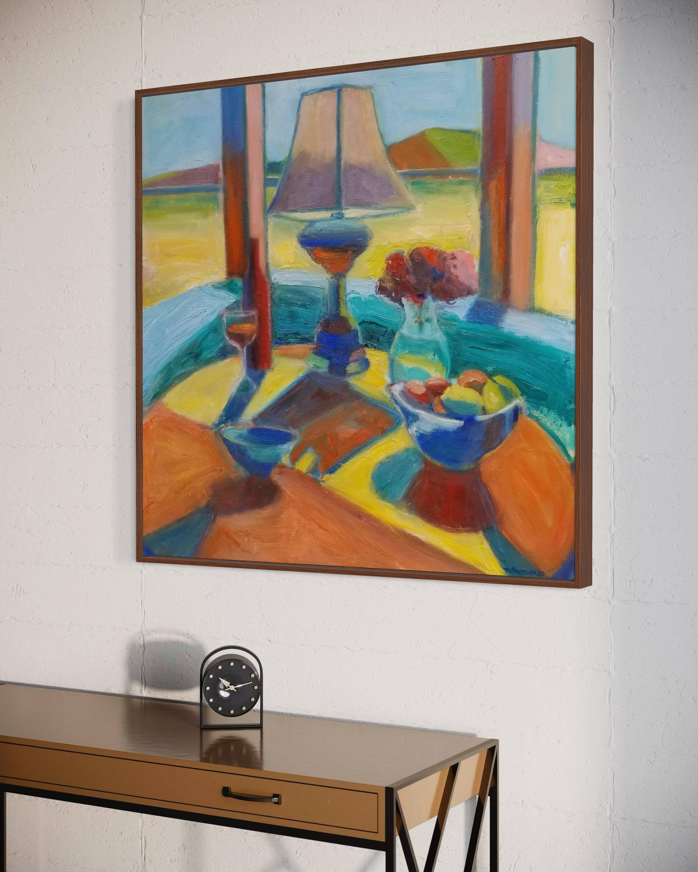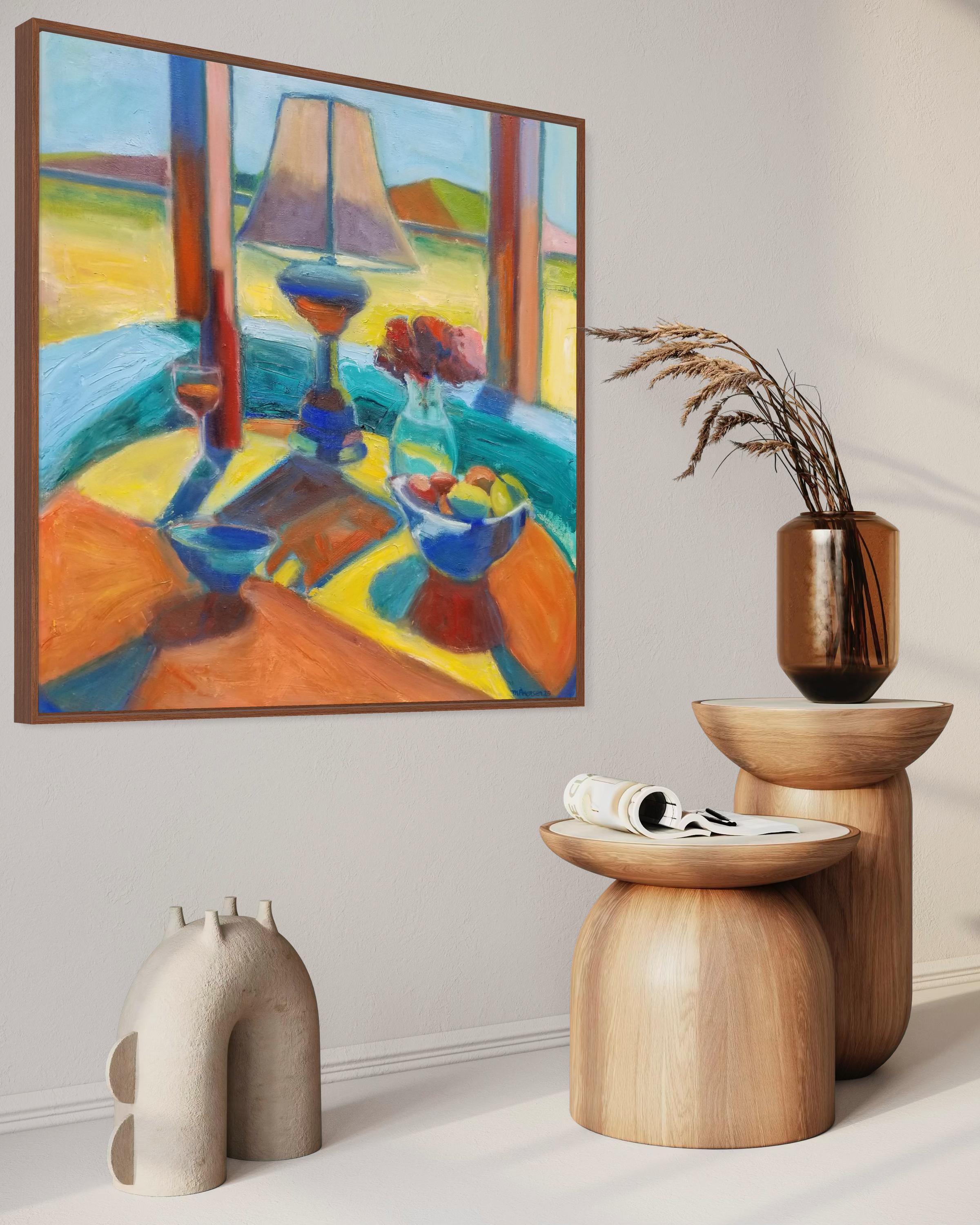 "Summer Still Life" ist ein lebhaftes, zeitgenössisches Ölgemälde, das die Tradition des Stilllebens durch kräftige, vom Fauvismus inspirierte Farben und ausdrucksstarke Pinselführung neu interpretiert. Die Komposition zeigt eine warm beleuchtete Innenraumszene: einen Tisch mit einer leuchtenden Lampe, ein Glas Wein, eine Blumenvase und eine Schale mit Obst. Das Sonnenlicht strömt durch die Fenster, beleuchtet die Landschaft dahinter und wirft satte, geometrische Schatten auf den Tisch.