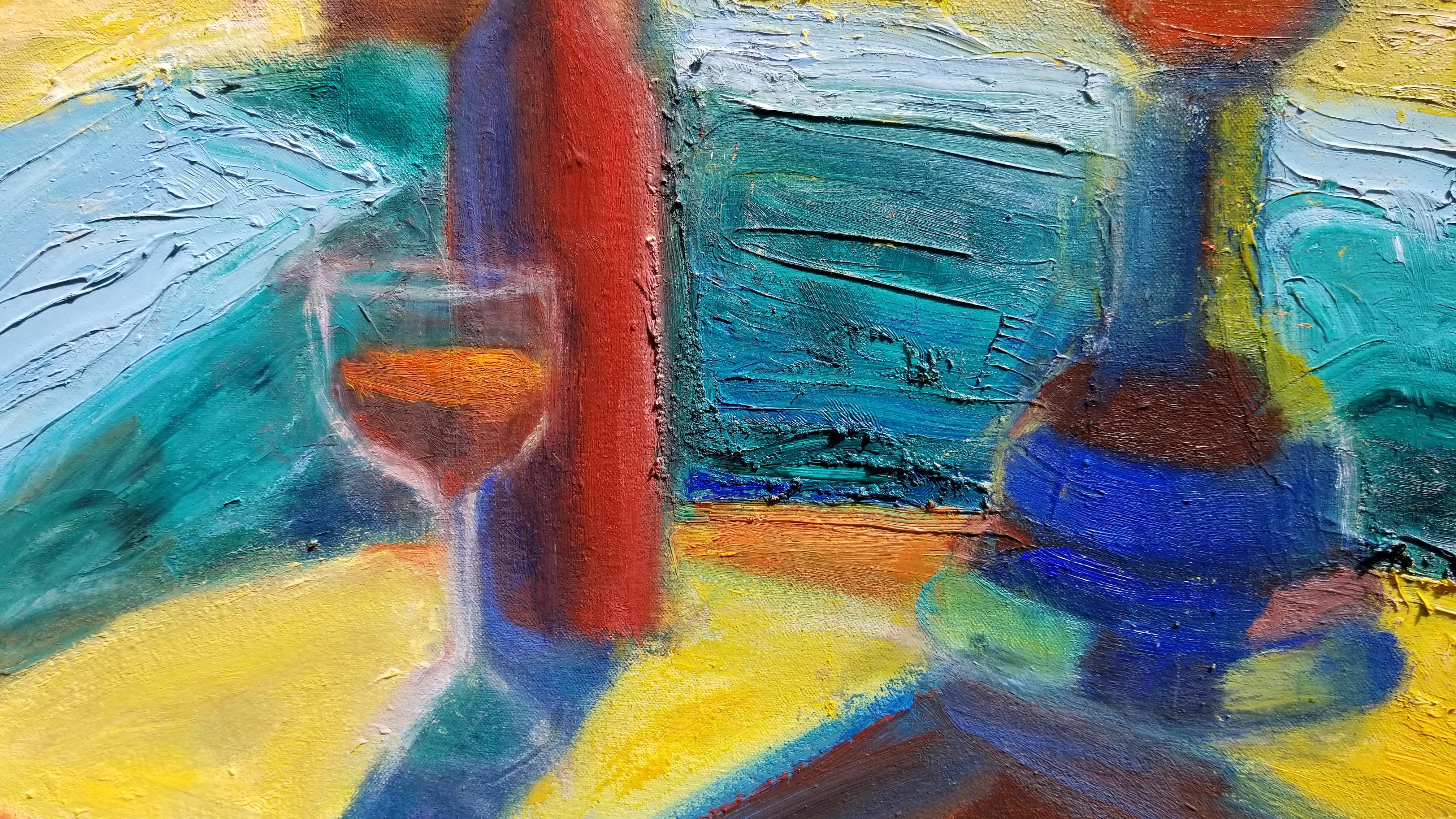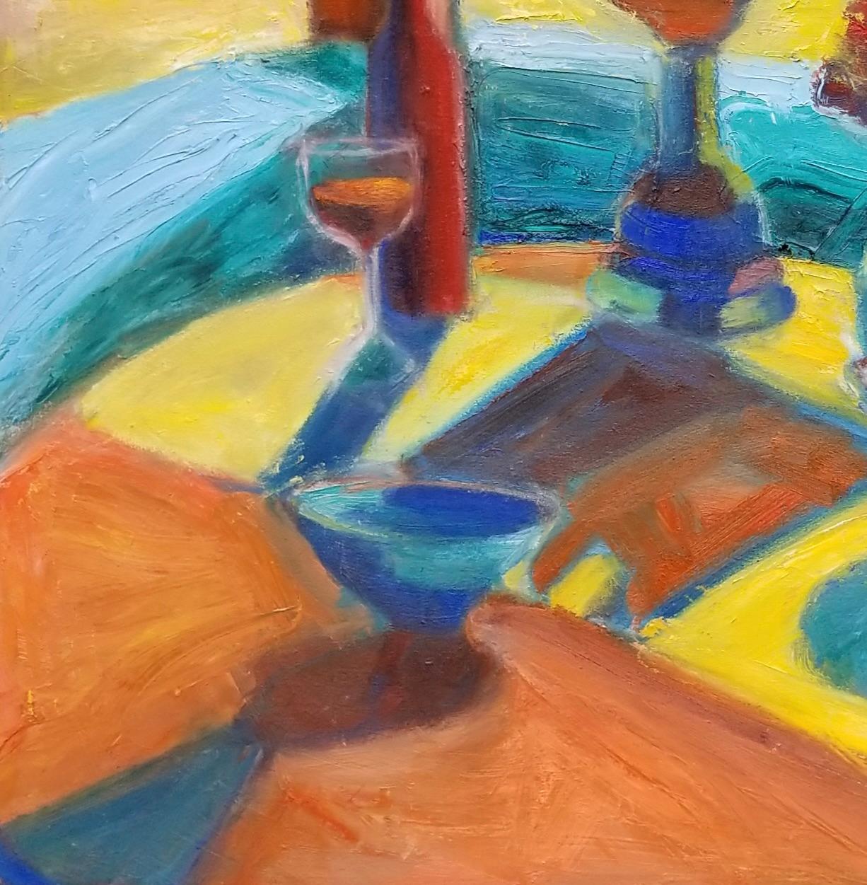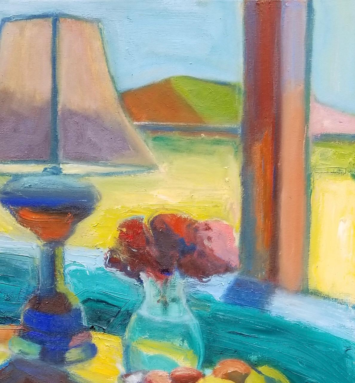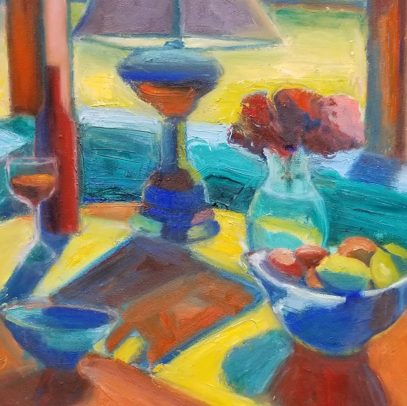 "Summer Still Life" ist ein lebhaftes, zeitgenössisches Ölgemälde, das die Tradition des Stilllebens durch kräftige, vom Fauvismus inspirierte Farben und ausdrucksstarke Pinselführung neu interpretiert. Die Komposition zeigt eine warm beleuchtete Innenraumszene: einen Tisch mit einer leuchtenden Lampe, ein Glas Wein, eine Blumenvase und eine Schale mit Obst. Das Sonnenlicht strömt durch die Fenster, beleuchtet die Landschaft dahinter und wirft satte, geometrische Schatten auf den Tisch.