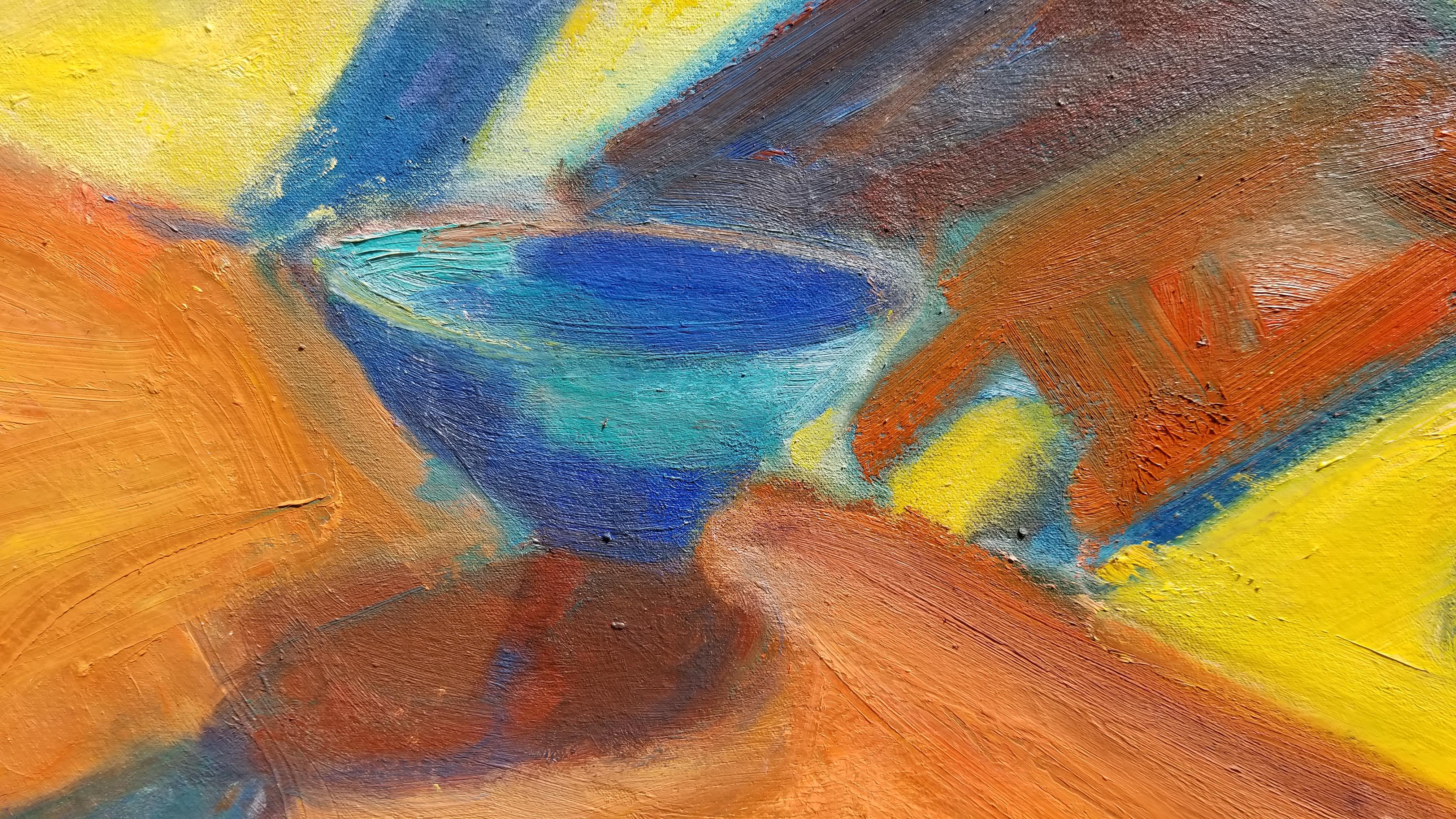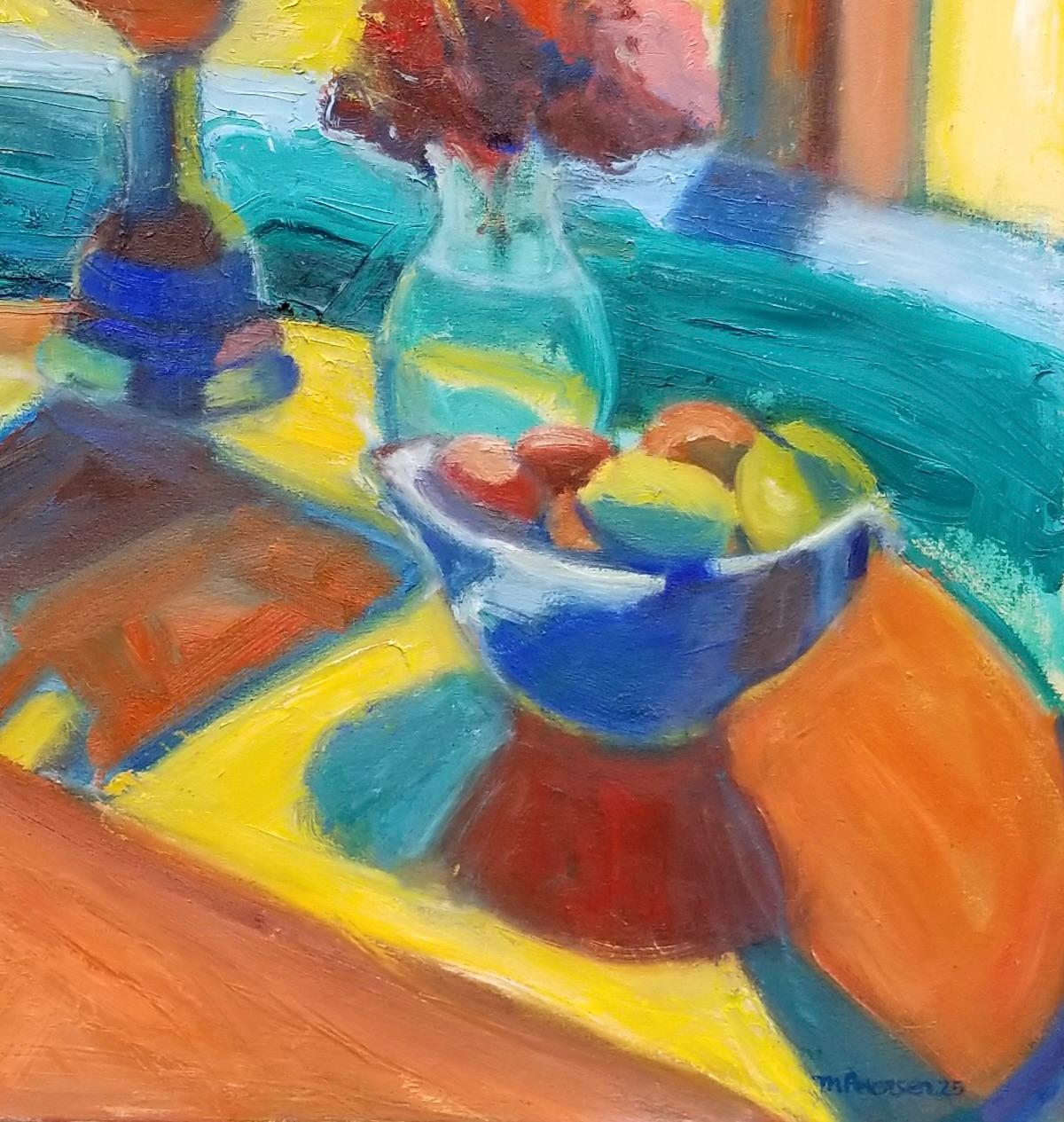 Alle anzeigen„Stillleben“ von Maura Petersen – farbenfrohes Stillleben mit Obstschale und Lampe