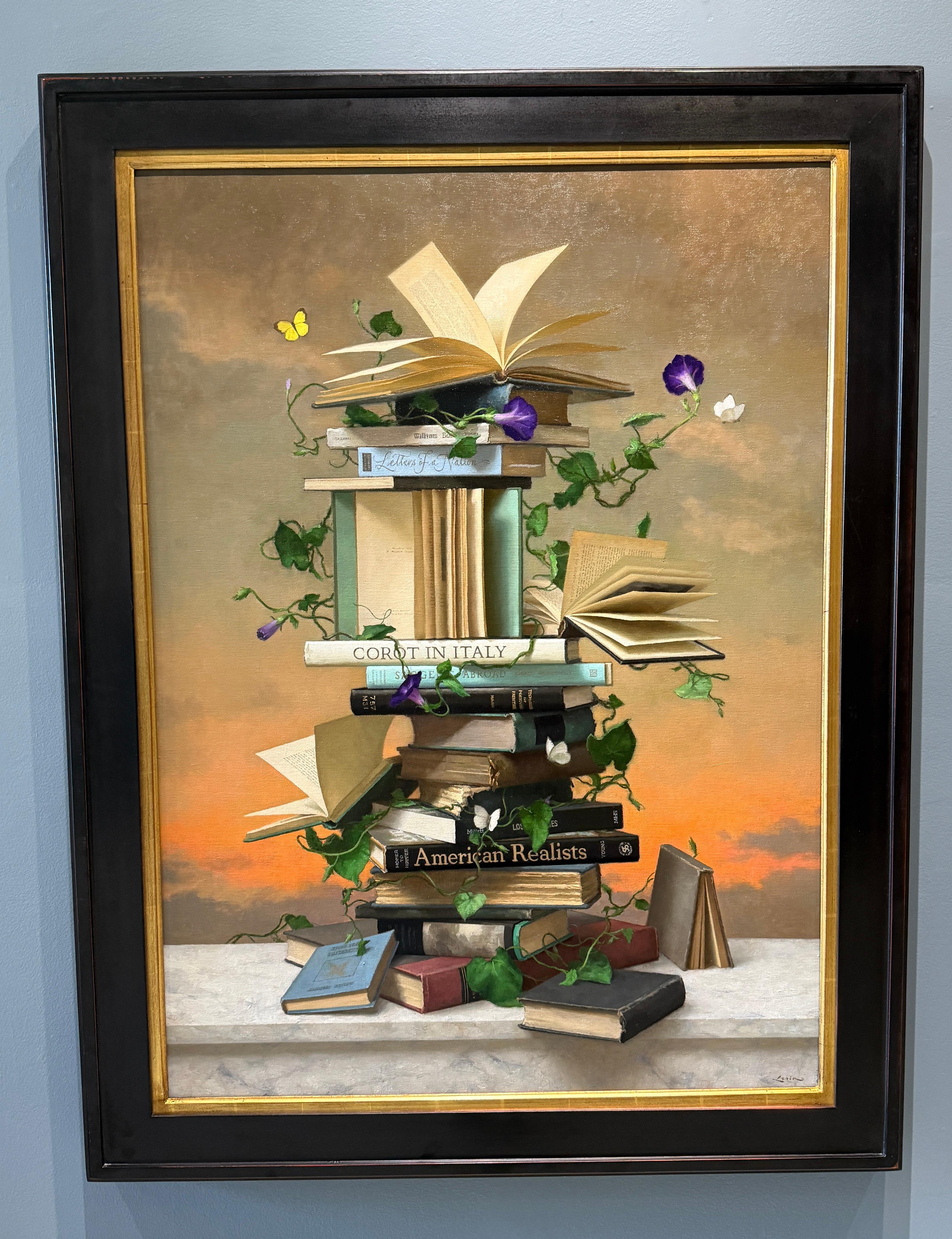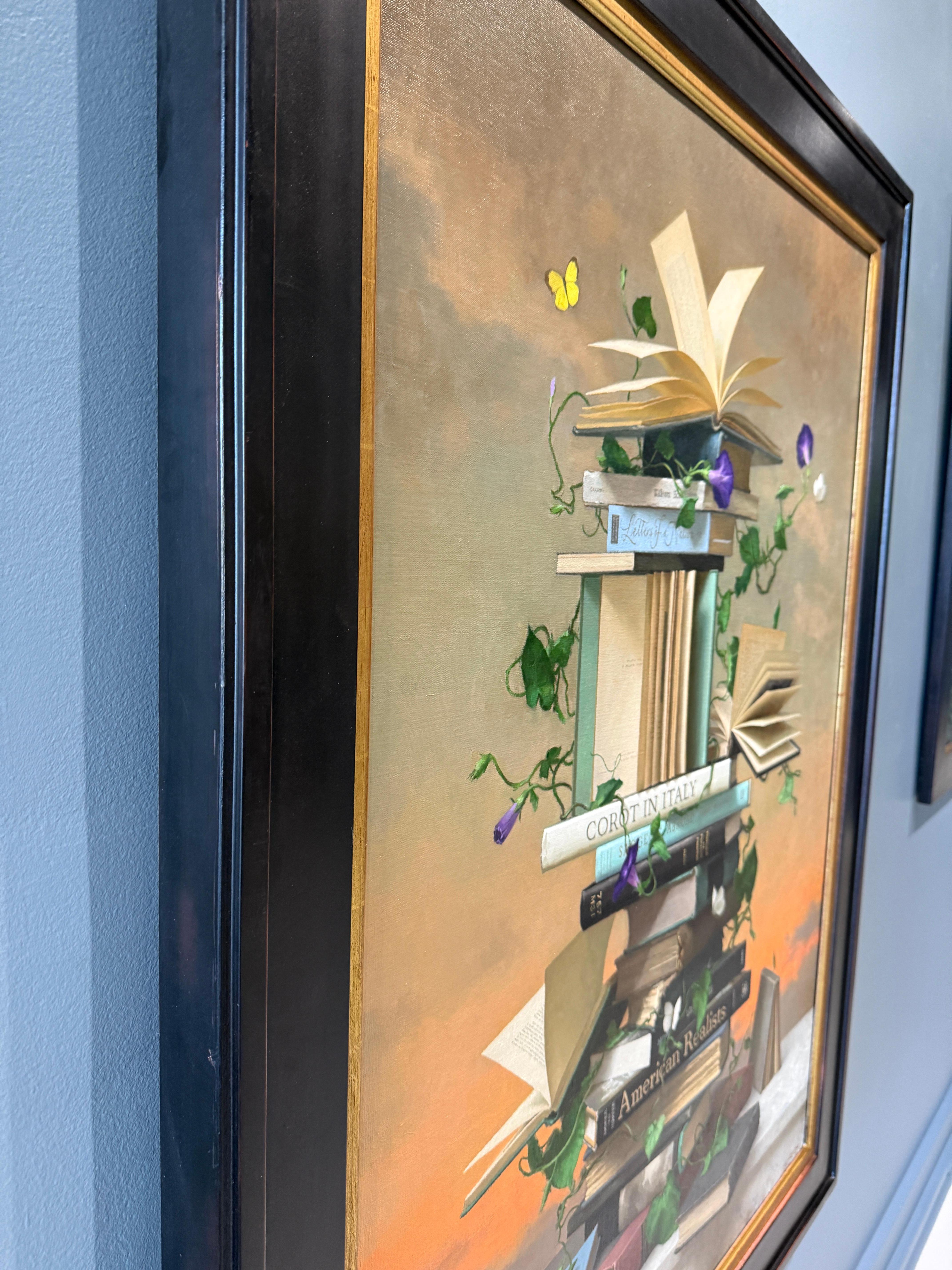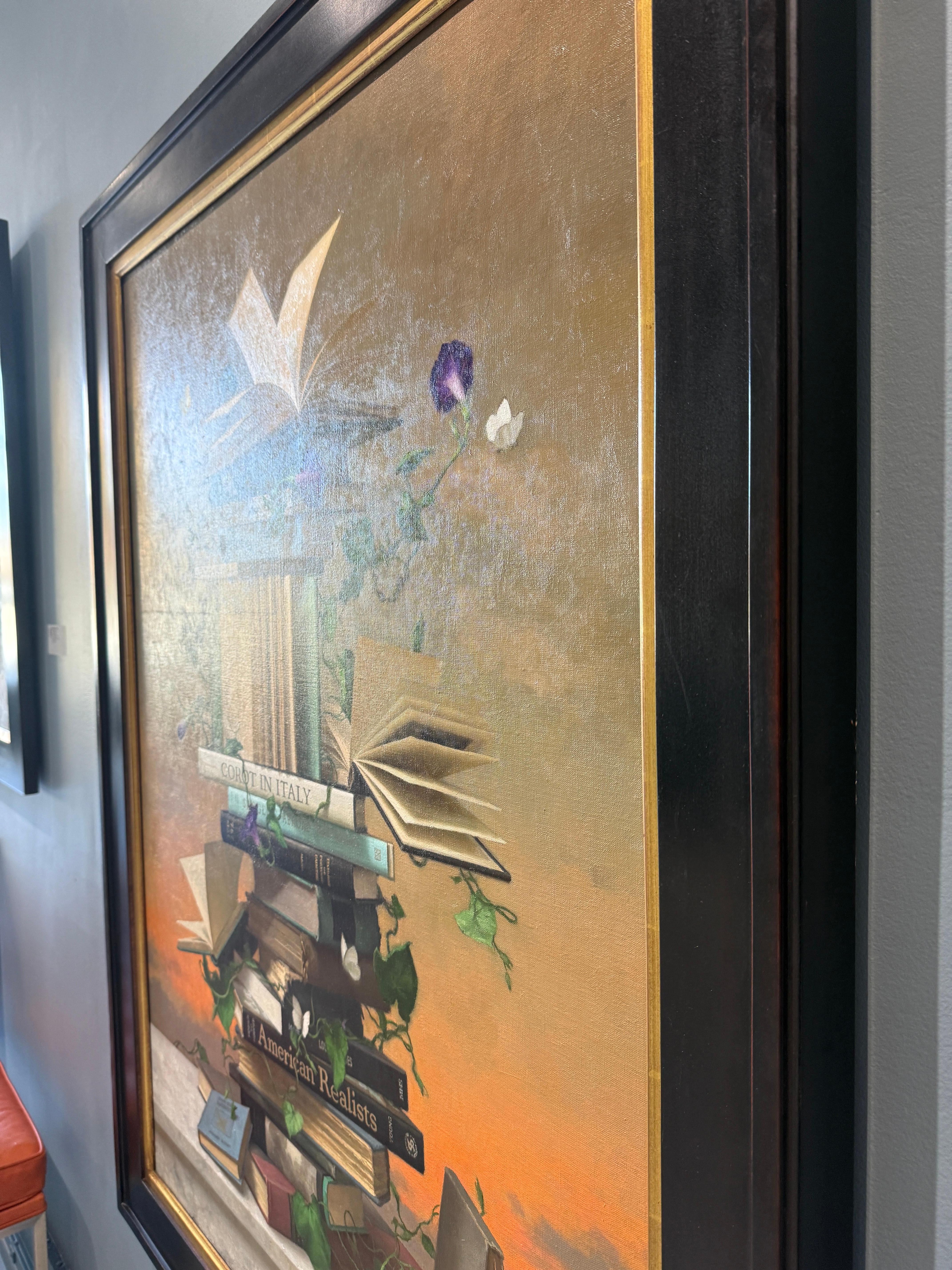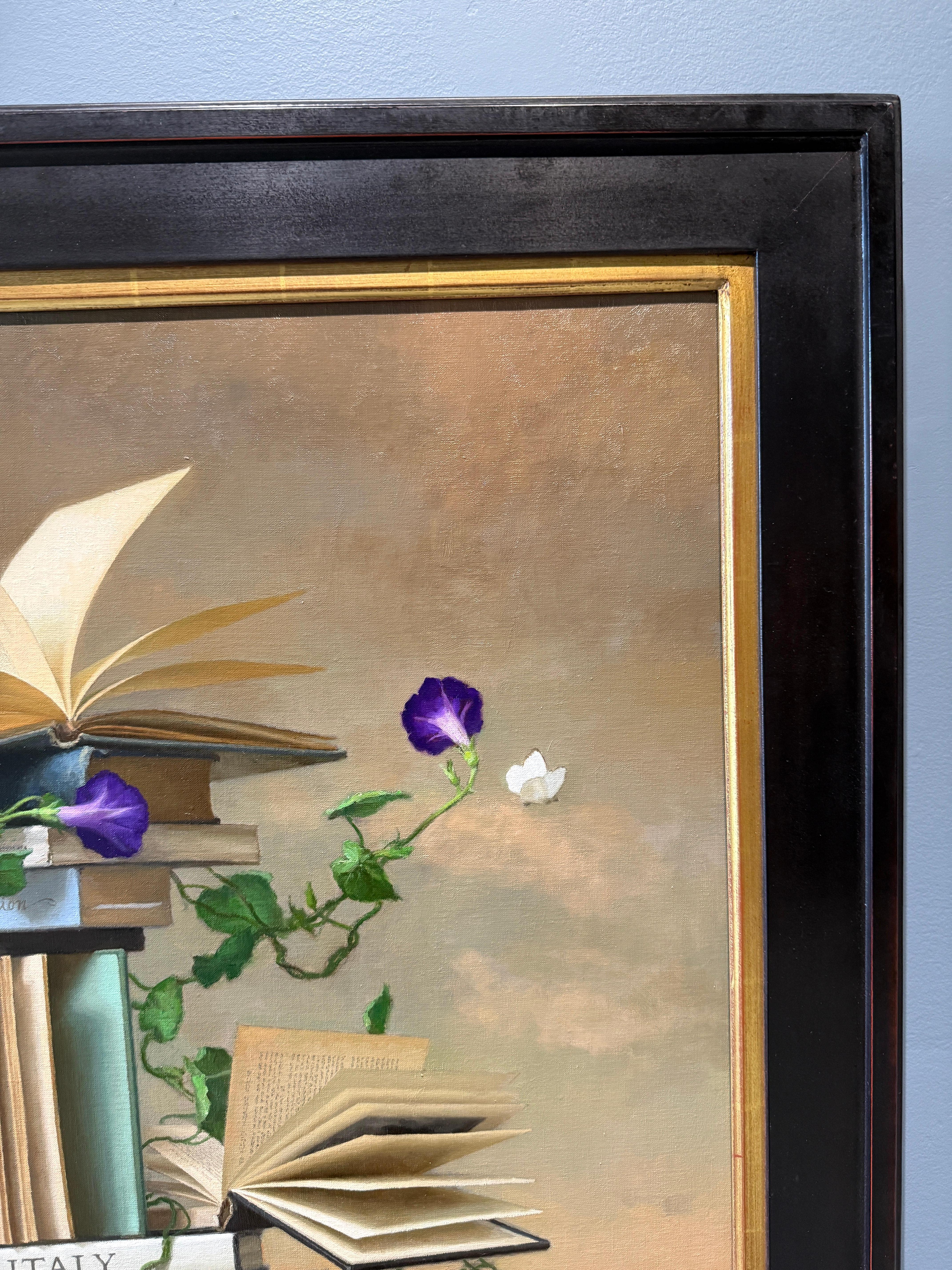Das neunte "Books and Butterflies"-Gemälde von Steven Levin und das einzige noch verfügbare aus dieser Serie wurde im August 2025 an unsere Galerie geliefert. Ein sorgfältig gemaltes Stillleben mit einem Turm aus übereinander gestapelten Büchern. Viele kunsthistorische Bücher, einige Titel: "Amerikanische Realisten" "Corot in Italien" "Sargent im Ausland" sowie amerikanische Geschichte, wie im Buchrücken "Letters of a Nation" zu sehen. Ein orangefarbener, dunstiger Himmel bildet die Kulisse für dieses Stillleben, das ziemlich surreal wirkt. Es gibt keine Landschaft, nur den Himmel. Wir befinden uns oberhalb des Horizonts; die Bücher stehen auf einem Sims aus feinem Marmor. Veilchen und Efeuranken winden sich um den Bücherturm und laden Schmetterlinge ein.