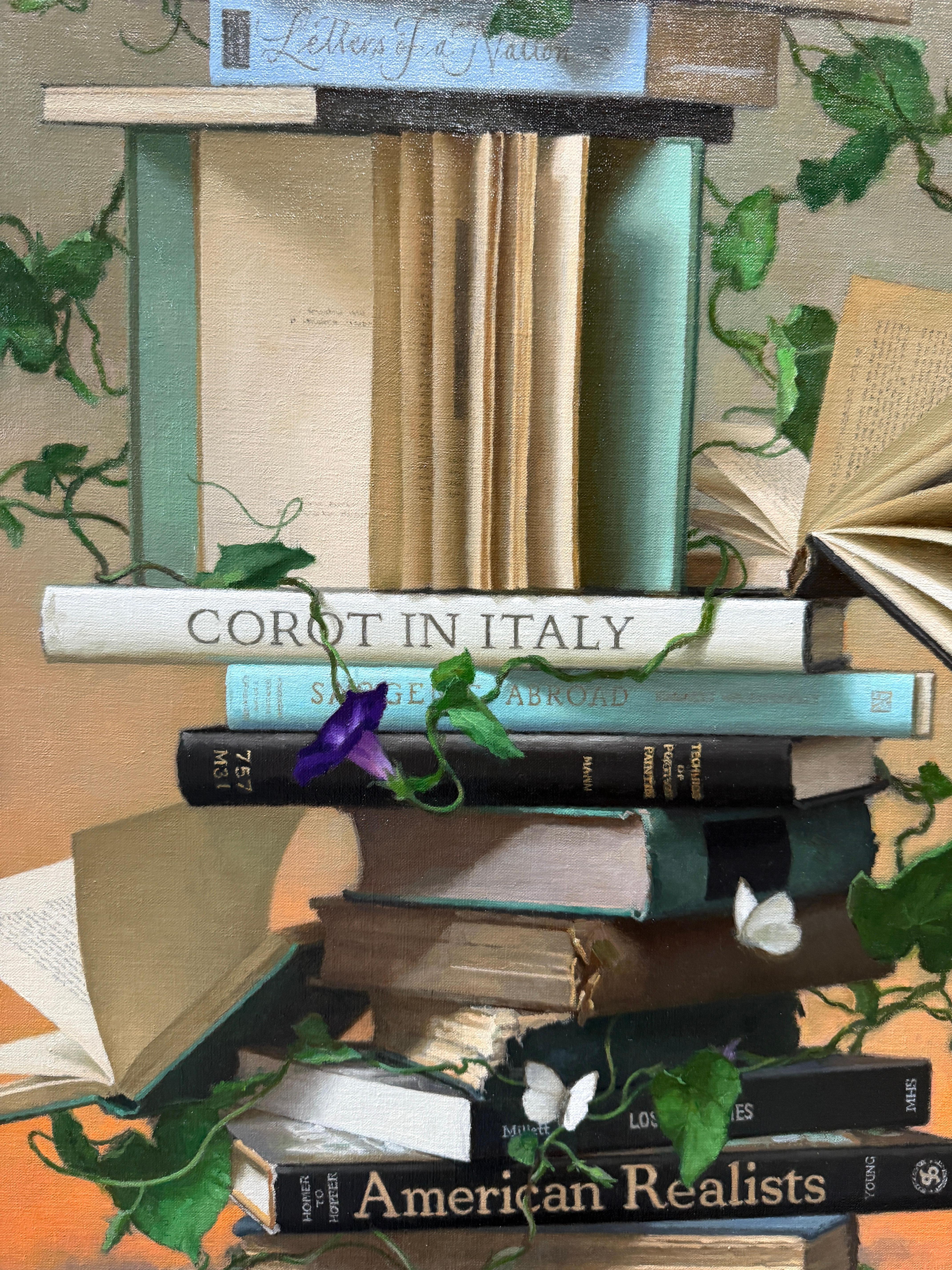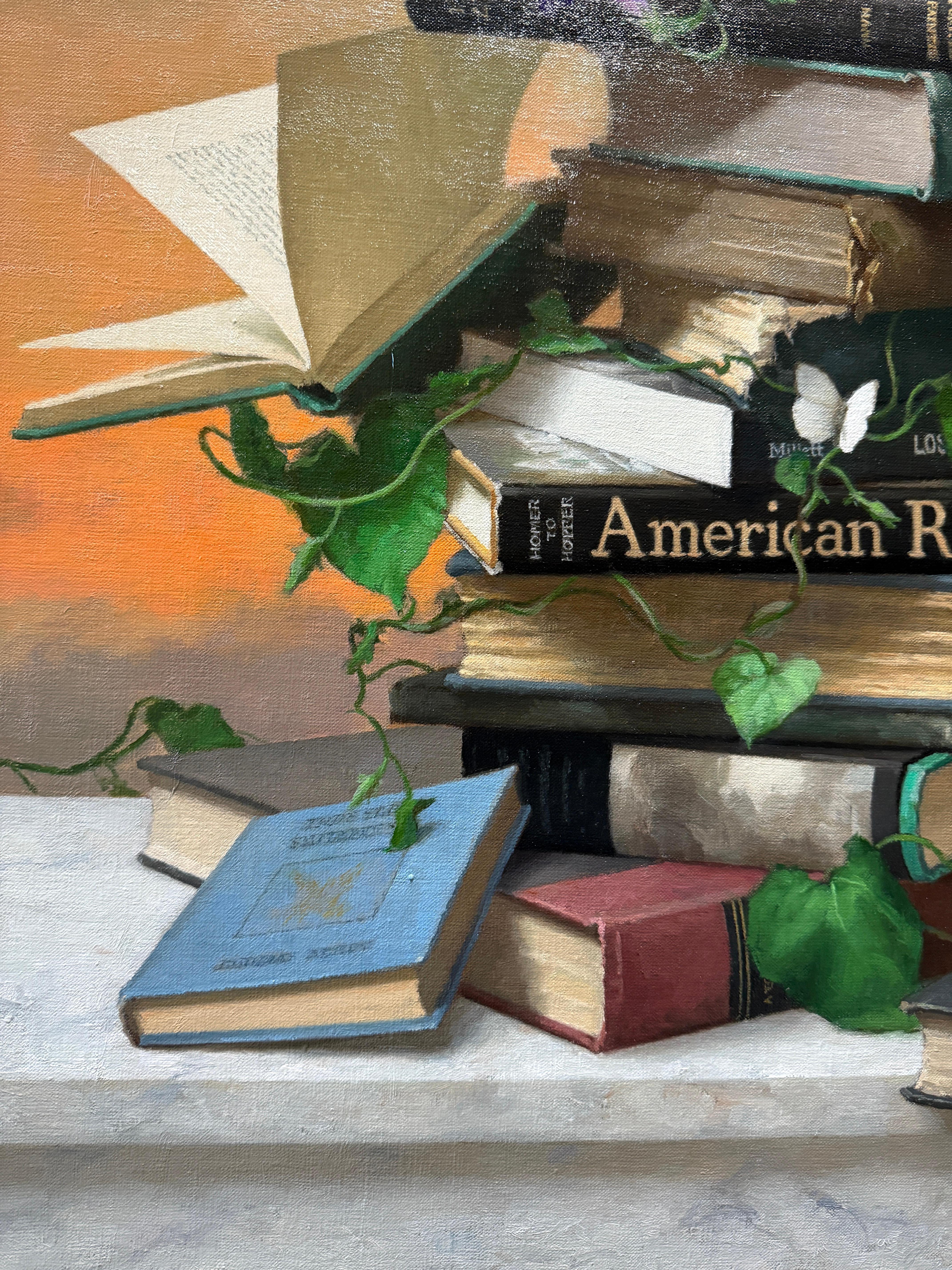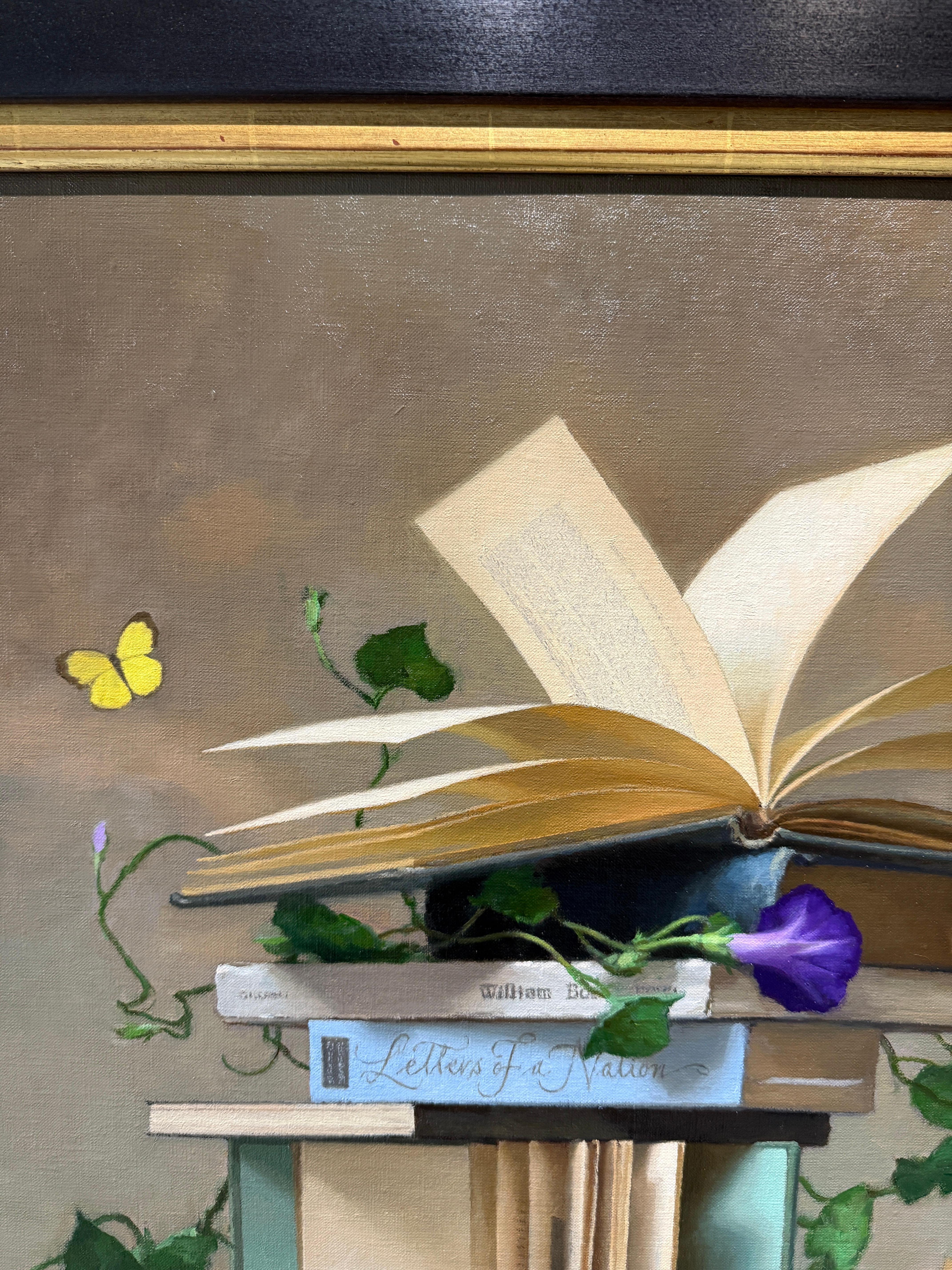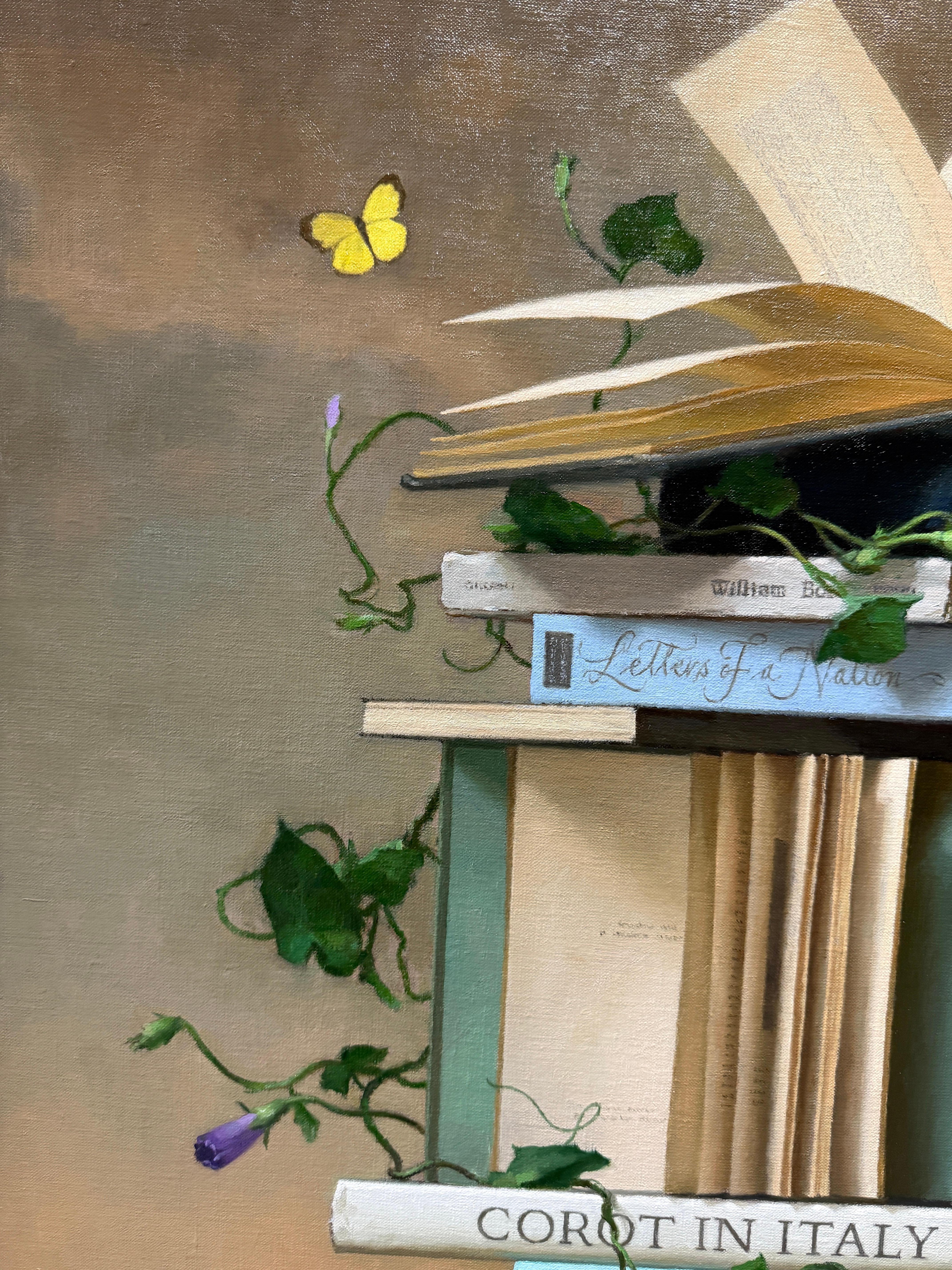 Das neunte "Books and Butterflies"-Gemälde von Steven Levin und das einzige noch verfügbare aus dieser Serie wurde im August 2025 an unsere Galerie geliefert. Ein sorgfältig gemaltes Stillleben mit einem Turm aus übereinander gestapelten Büchern. Viele kunsthistorische Bücher, einige Titel: "Amerikanische Realisten" "Corot in Italien" "Sargent im Ausland" sowie amerikanische Geschichte, wie im Buchrücken "Letters of a Nation" zu sehen. Ein orangefarbener, dunstiger Himmel bildet die Kulisse für dieses Stillleben, das ziemlich surreal wirkt. Es gibt keine Landschaft, nur den Himmel. Wir befinden uns oberhalb des Horizonts; die Bücher stehen auf einem Sims aus feinem Marmor. Veilchen und Efeuranken winden sich um den Bücherturm und laden Schmetterlinge ein.