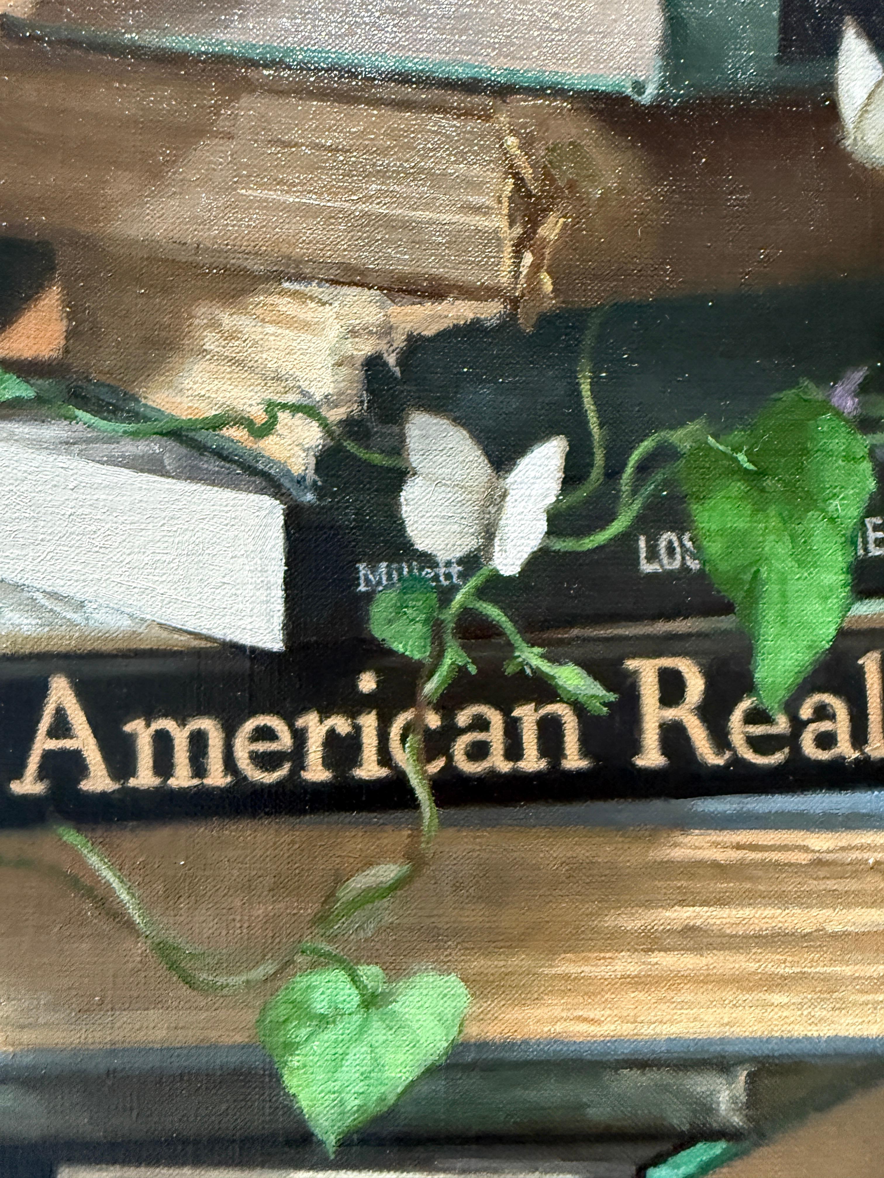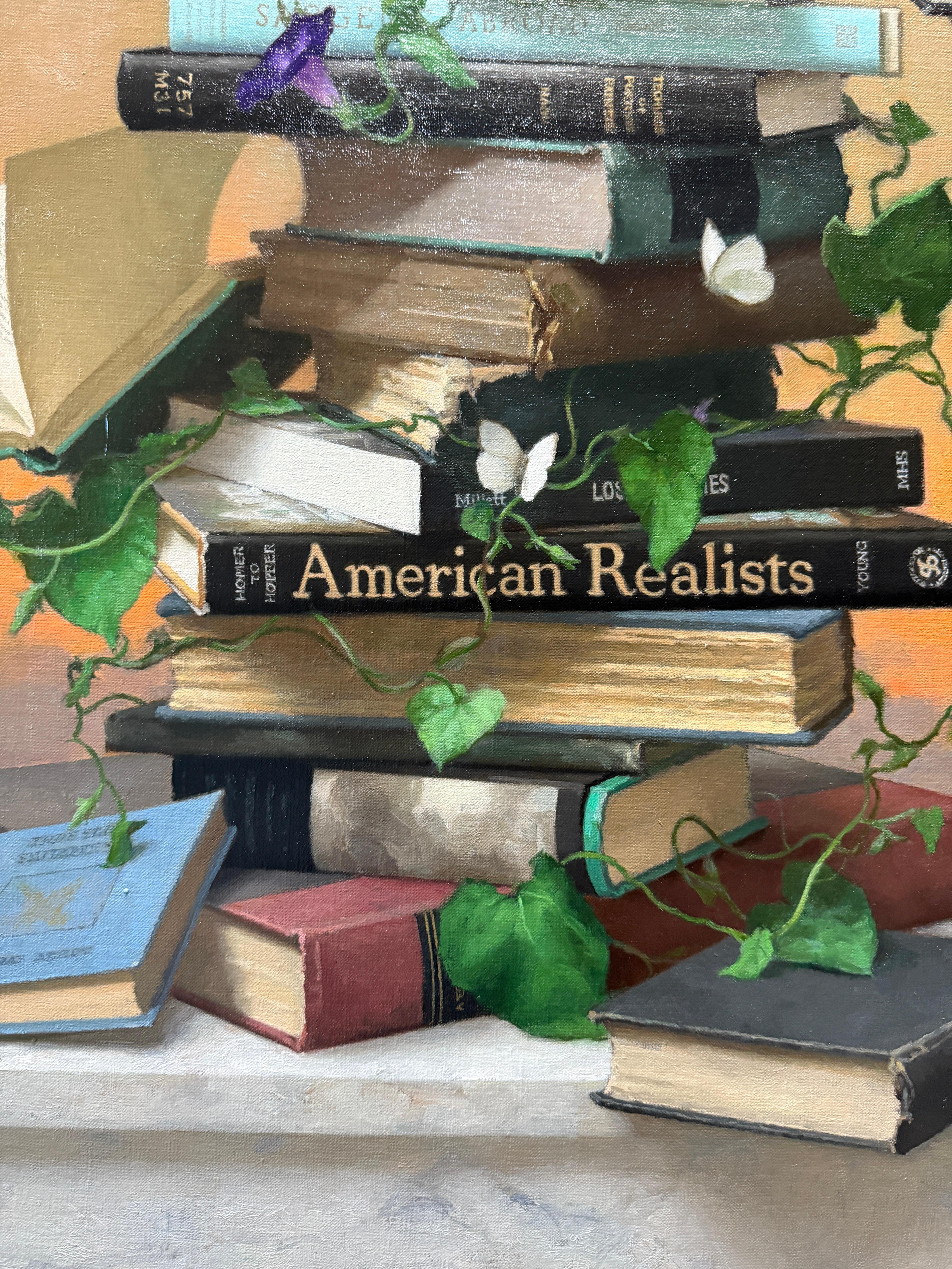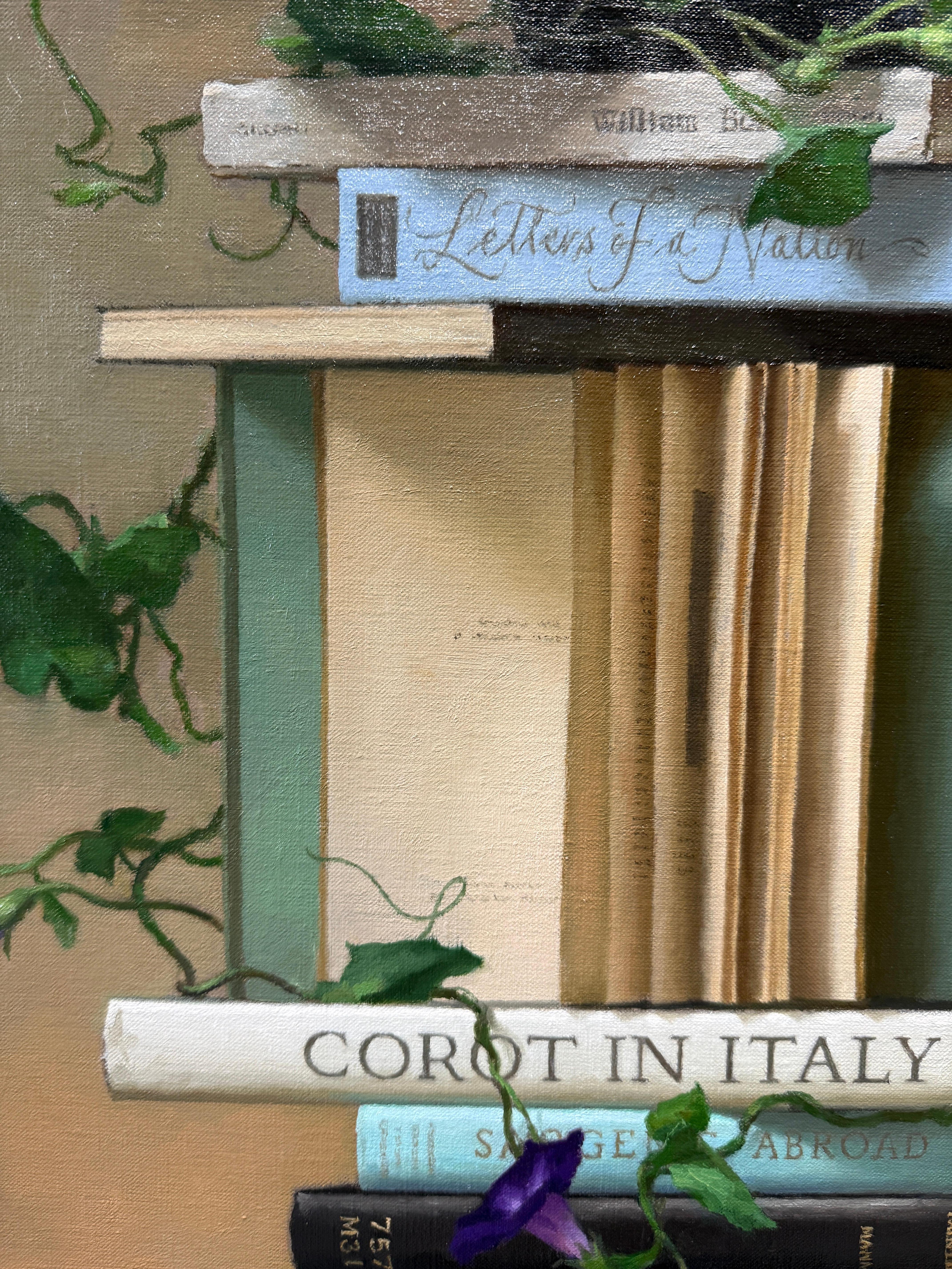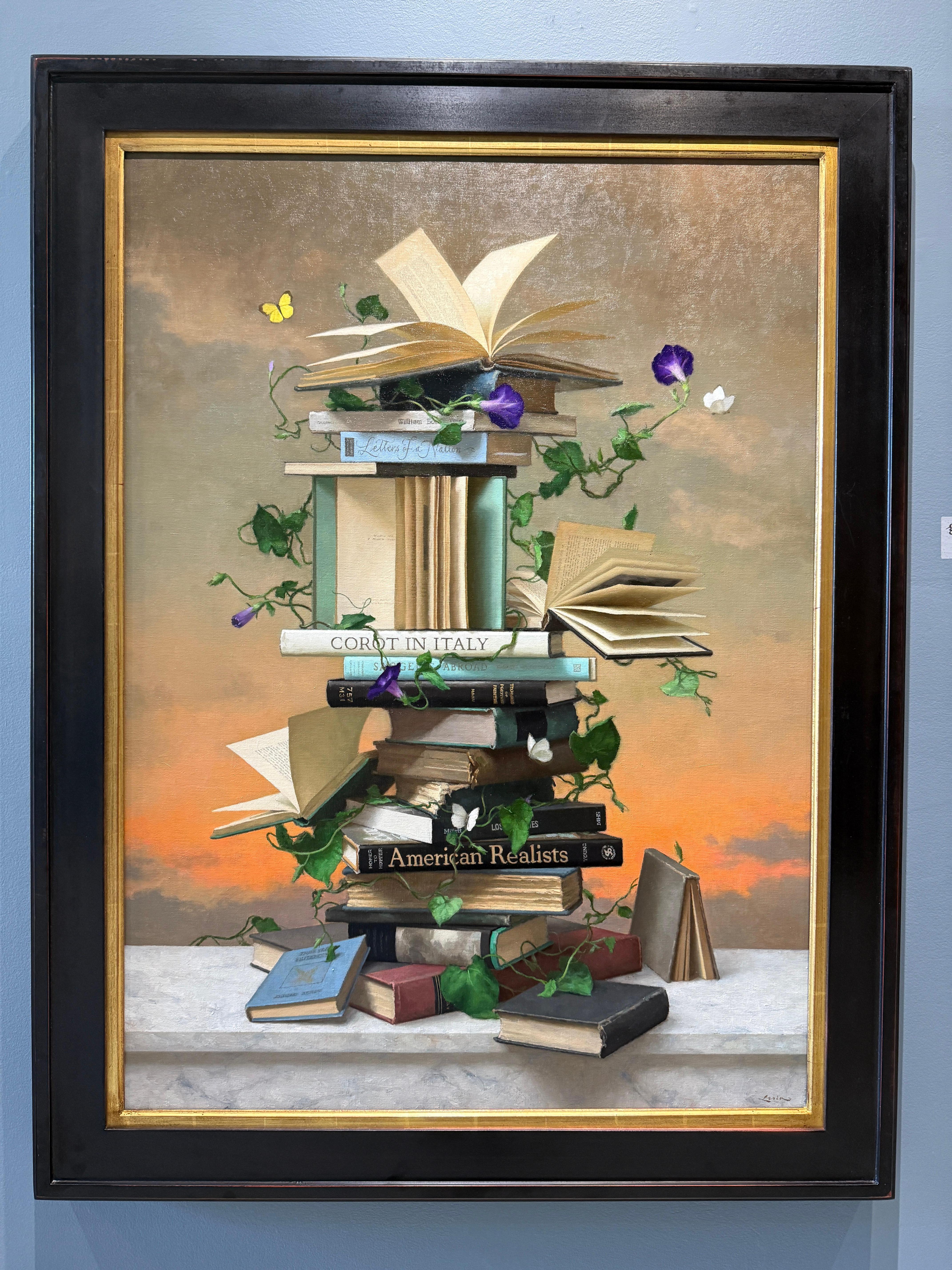 Das neunte "Books and Butterflies"-Gemälde von Steven Levin und das einzige noch verfügbare aus dieser Serie wurde im August 2025 an unsere Galerie geliefert. Ein sorgfältig gemaltes Stillleben mit einem Turm aus übereinander gestapelten Büchern. Viele kunsthistorische Bücher, einige Titel: "Amerikanische Realisten" "Corot in Italien" "Sargent im Ausland" sowie amerikanische Geschichte, wie im Buchrücken "Letters of a Nation" zu sehen. Ein orangefarbener, dunstiger Himmel bildet die Kulisse für dieses Stillleben, das ziemlich surreal wirkt. Es gibt keine Landschaft, nur den Himmel. Wir befinden uns oberhalb des Horizonts; die Bücher stehen auf einem Sims aus feinem Marmor. Veilchen und Efeuranken winden sich um den Bücherturm und laden Schmetterlinge ein.