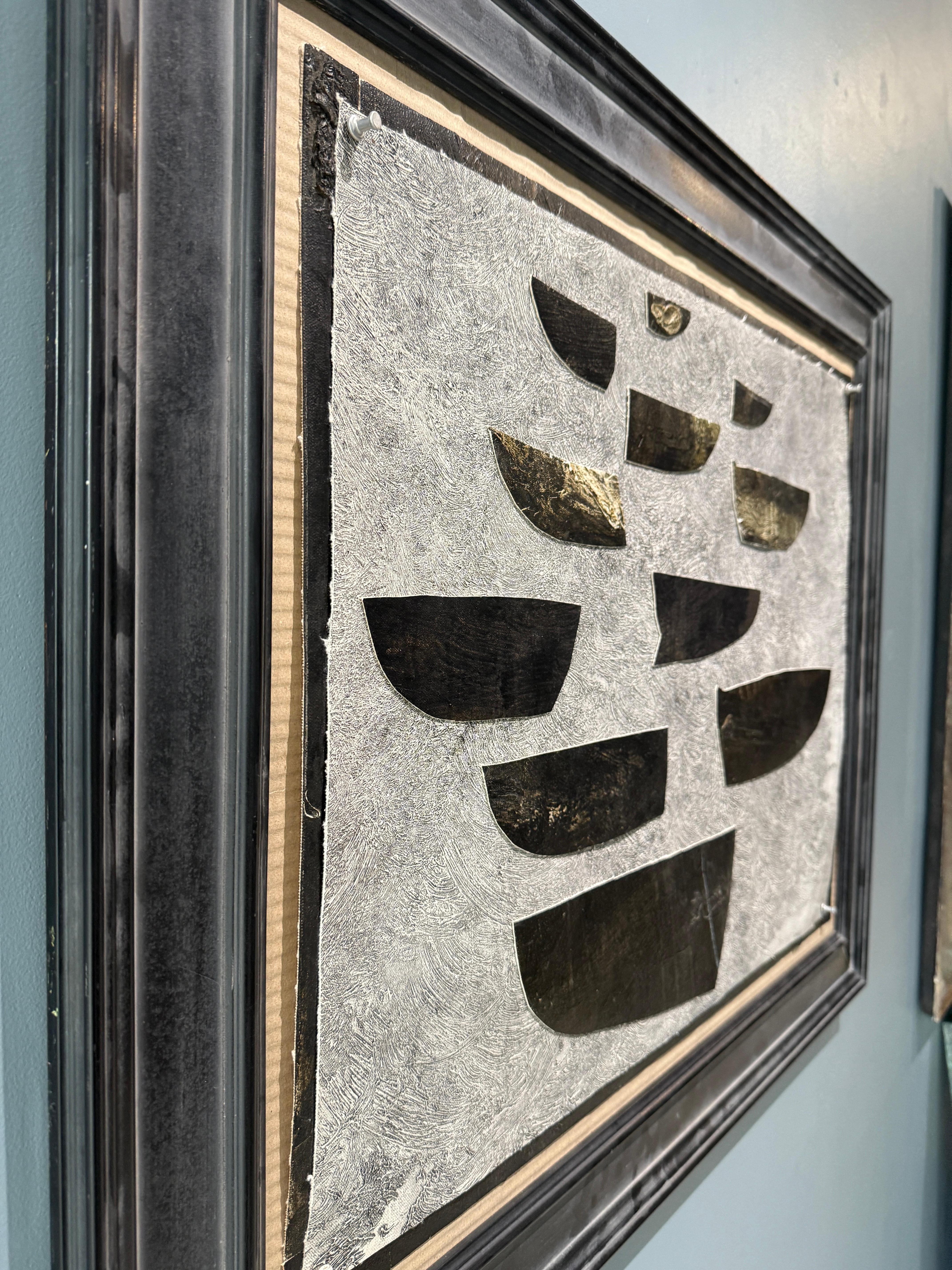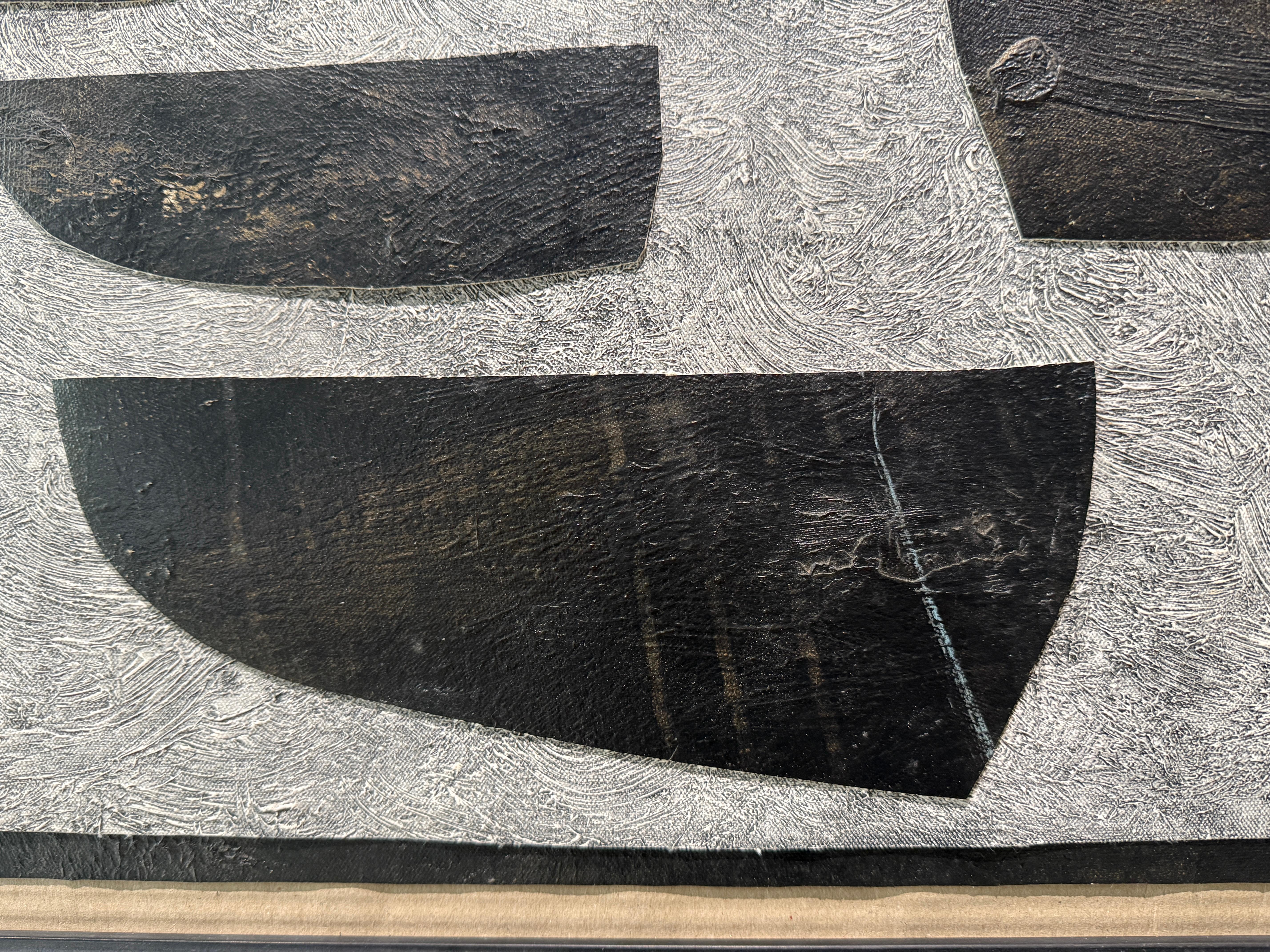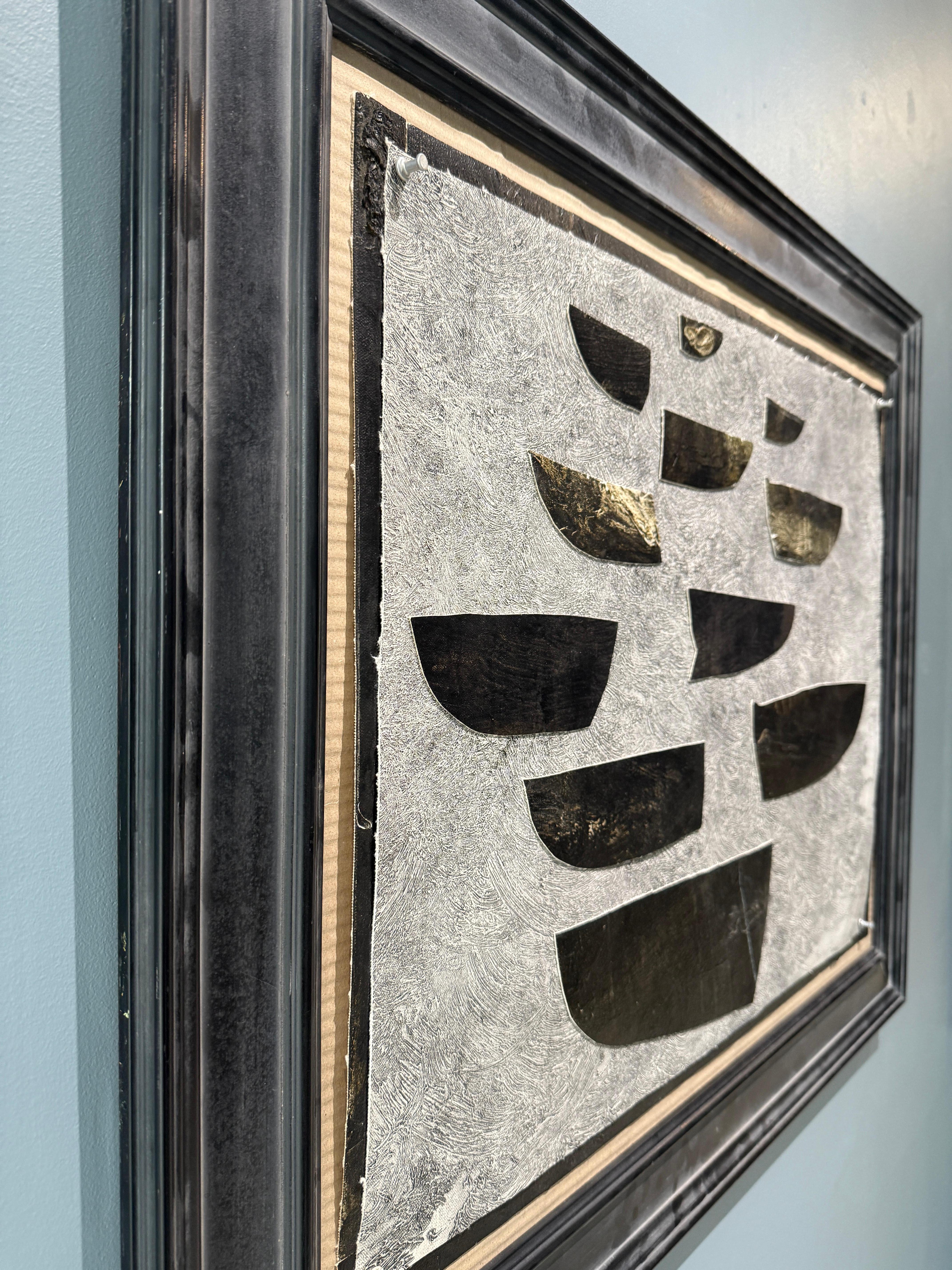 Eine Öl auf Leinwand Gemälde Collage von Terry Elkins (geb. 1951 / Vicksburg, Mississippi). Elkins schneidet bemalte Leinwand in Bootssilhouetten, die so angeordnet sind, dass sie in entgegengesetzte Richtungen segeln, wobei sich die einzelnen Boote voneinander entfernen. Diese Ausschnitte werden auf eine andere Leinwand geklebt, gemalt mit dicken, titanweißen, strukturierten Pinselstrichen. Diese Leinwand wird dann auf eine andere, mit schwarzer Farbe bemalte Leinwand geklebt.