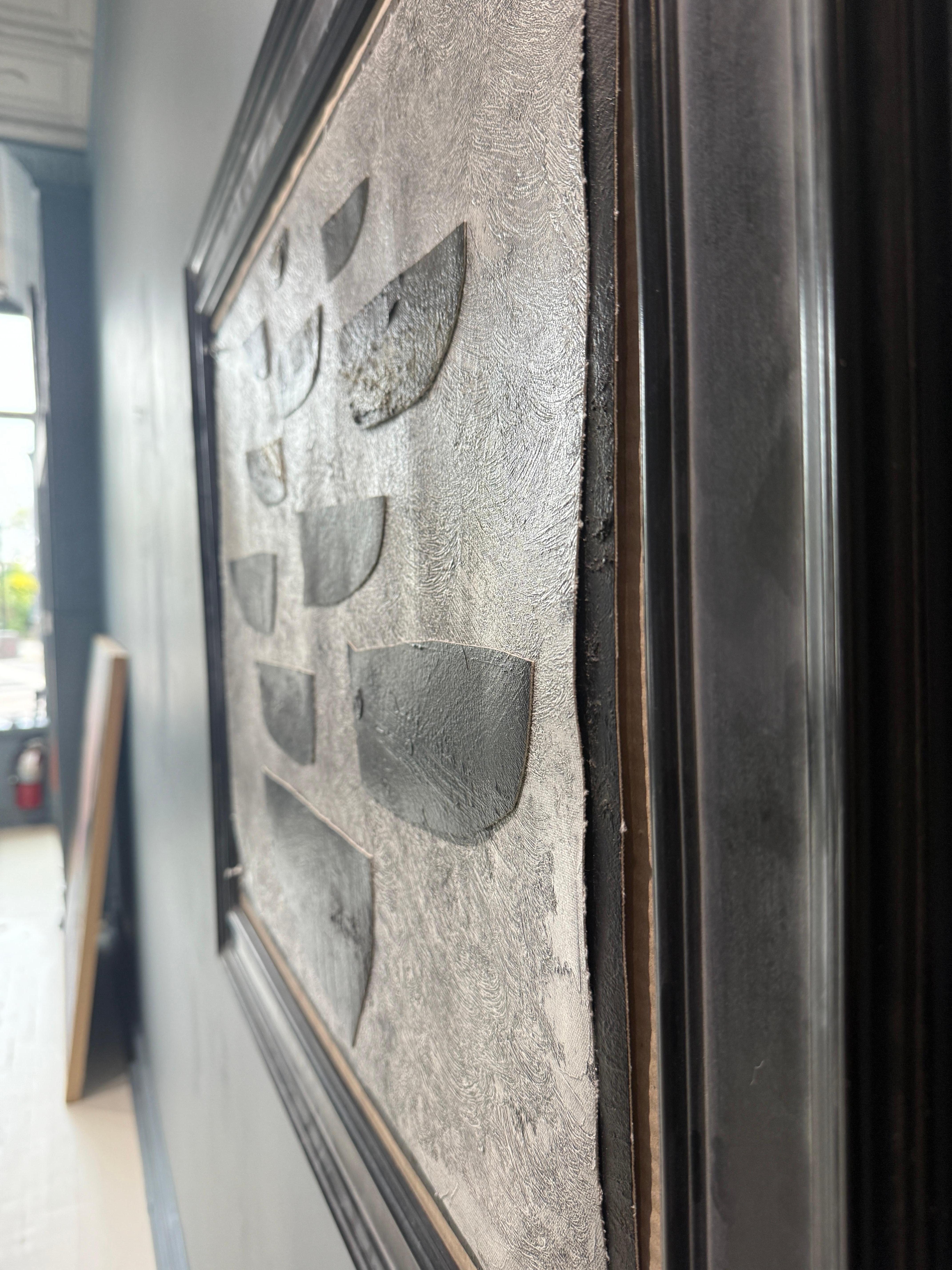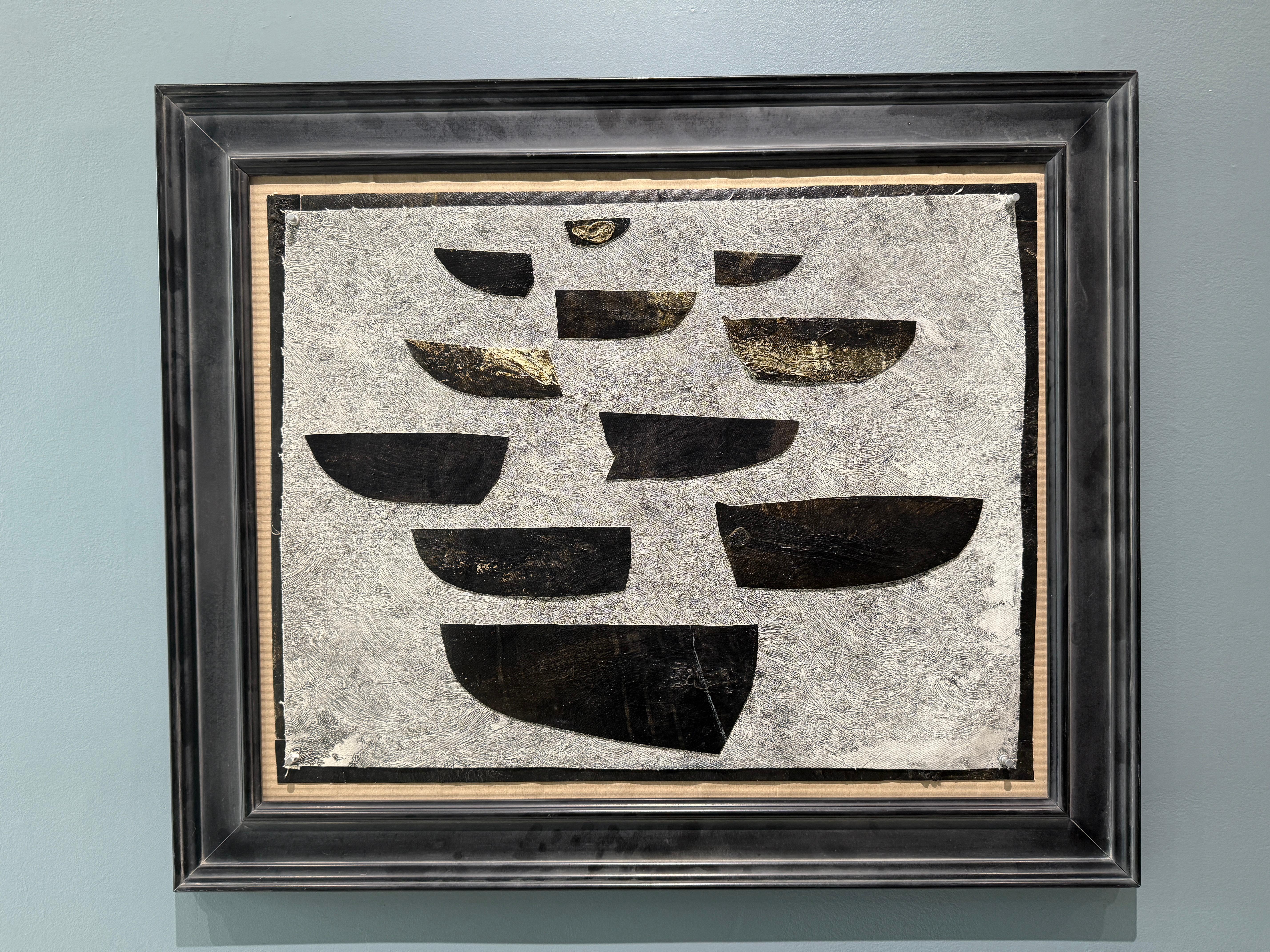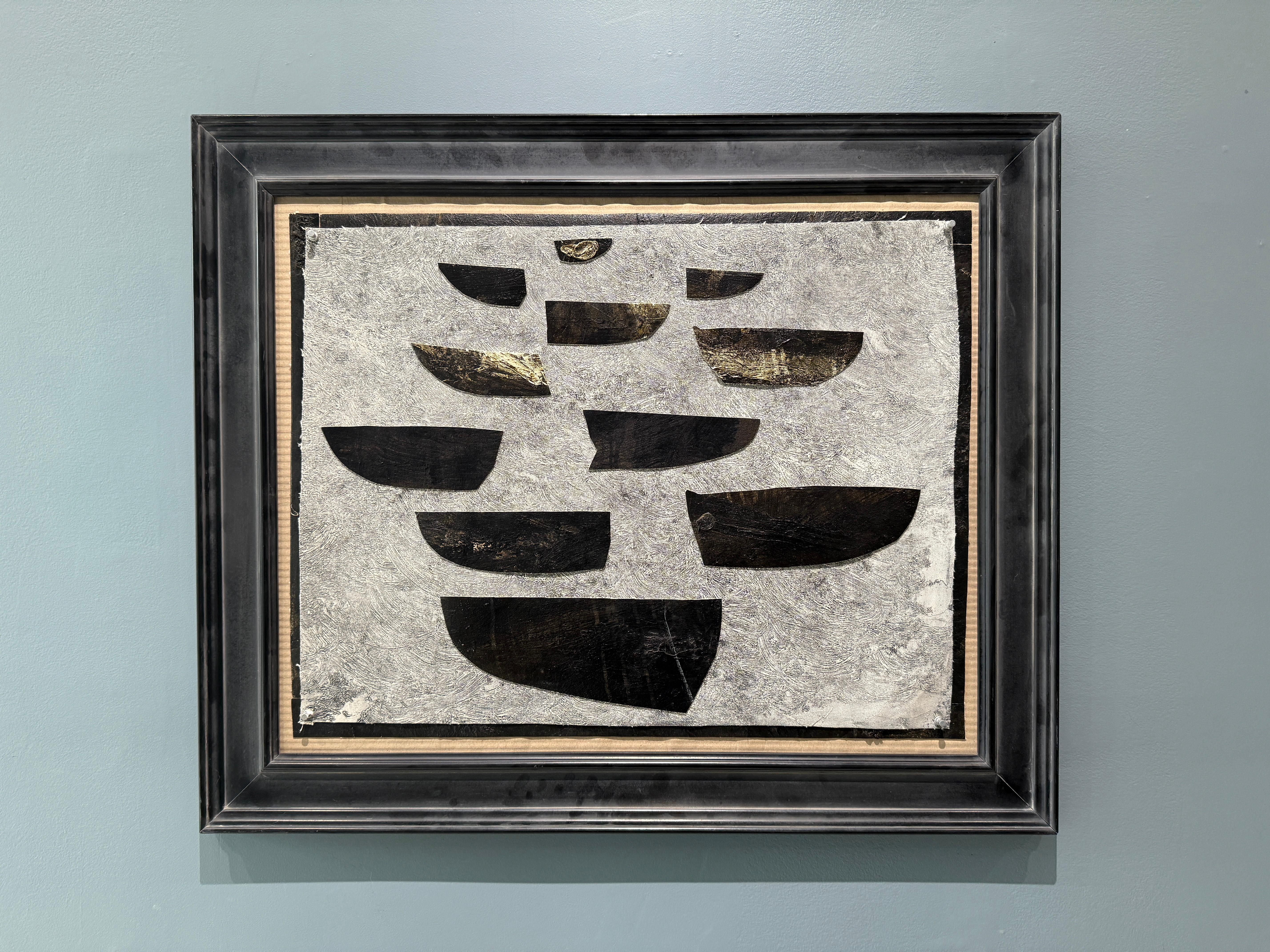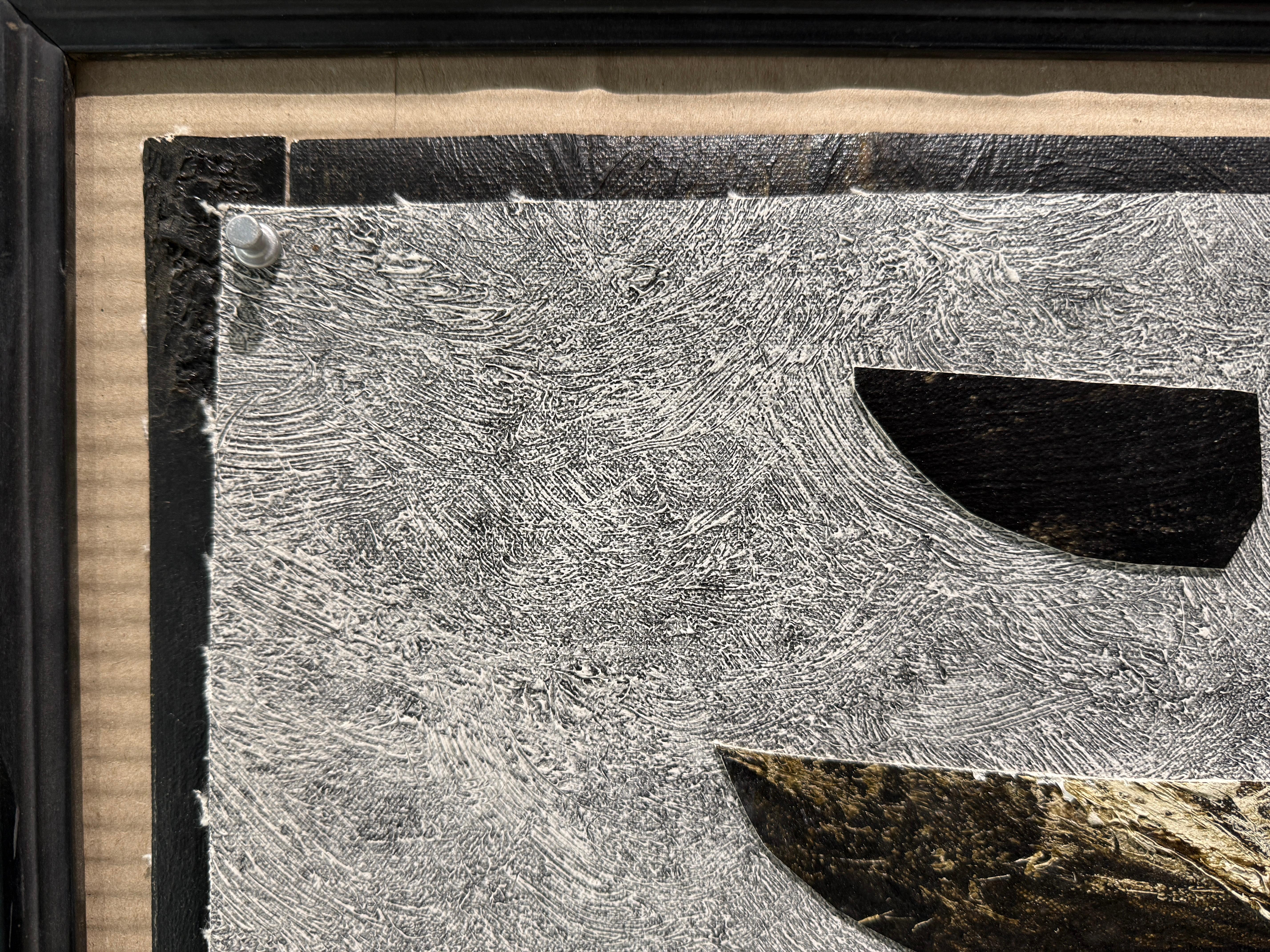 Eine Öl auf Leinwand Gemälde Collage von Terry Elkins (geb. 1951 / Vicksburg, Mississippi). Elkins schneidet bemalte Leinwand in Bootssilhouetten, die so angeordnet sind, dass sie in entgegengesetzte Richtungen segeln, wobei sich die einzelnen Boote voneinander entfernen. Diese Ausschnitte werden auf eine andere Leinwand geklebt, gemalt mit dicken, titanweißen, strukturierten Pinselstrichen. Diese Leinwand wird dann auf eine andere, mit schwarzer Farbe bemalte Leinwand geklebt.
