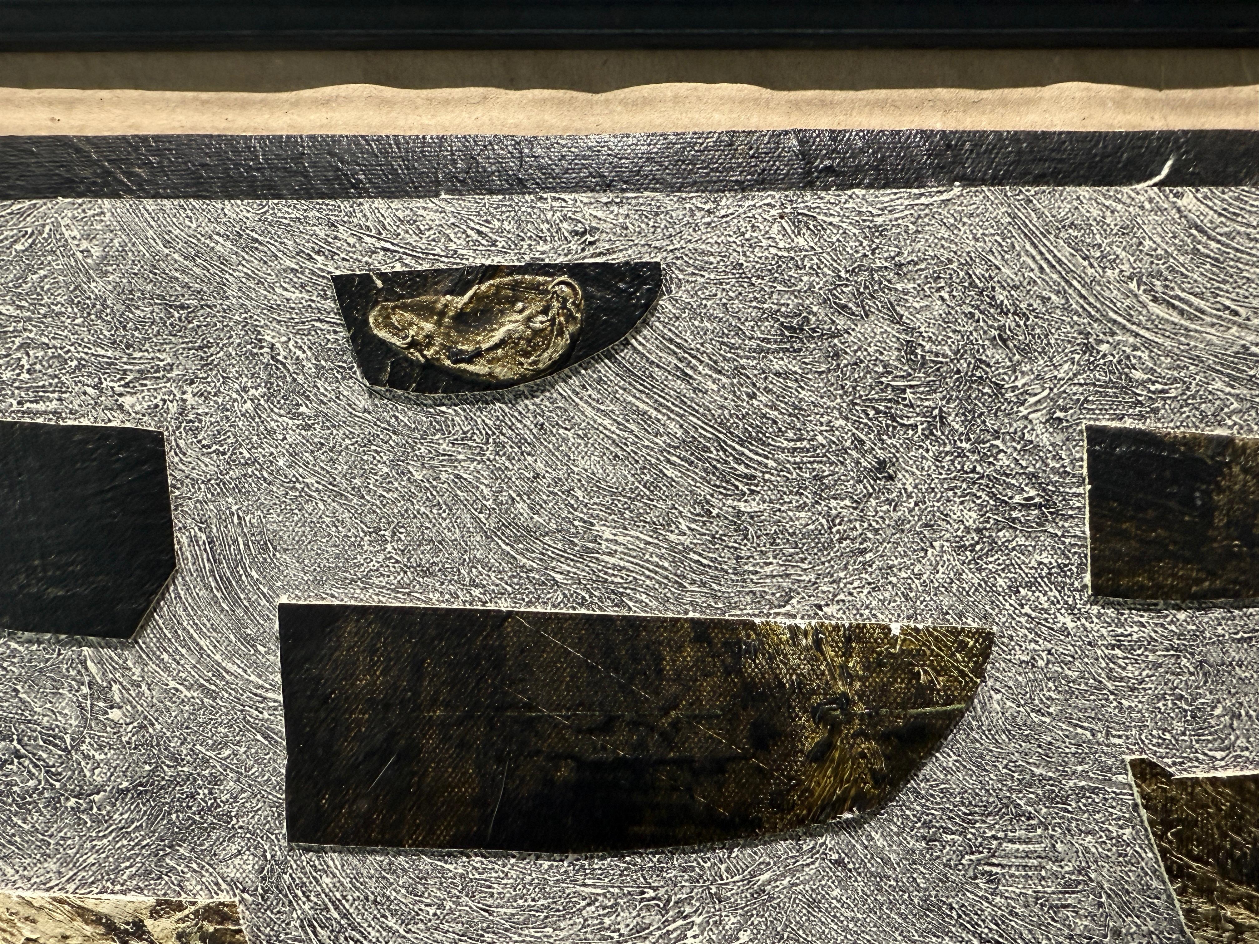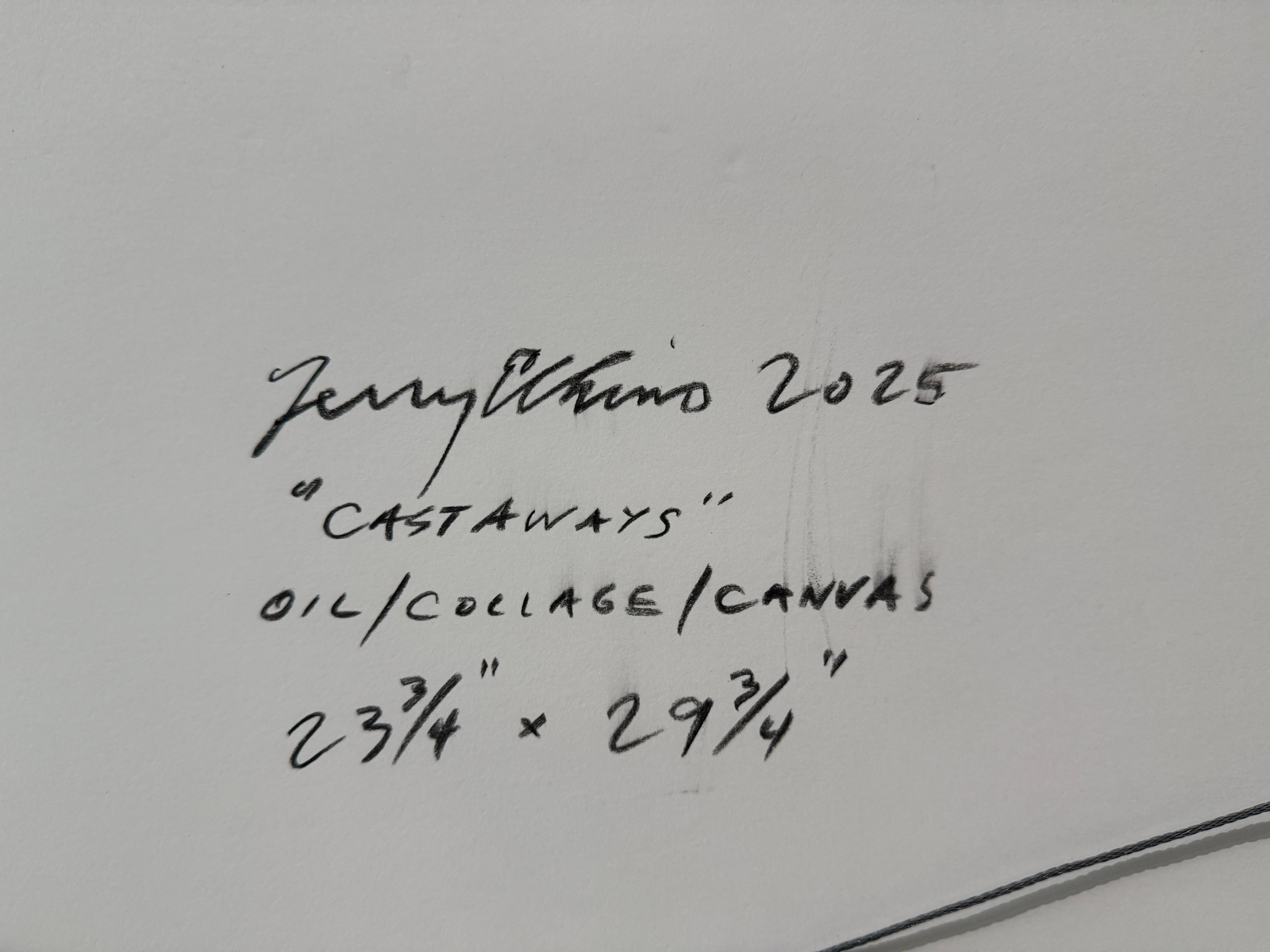 Verso signiert: "Terry Elkins 2025 "Castaways" Öl/Collage/Leinwand 23 3/4" x 29 3/4" "