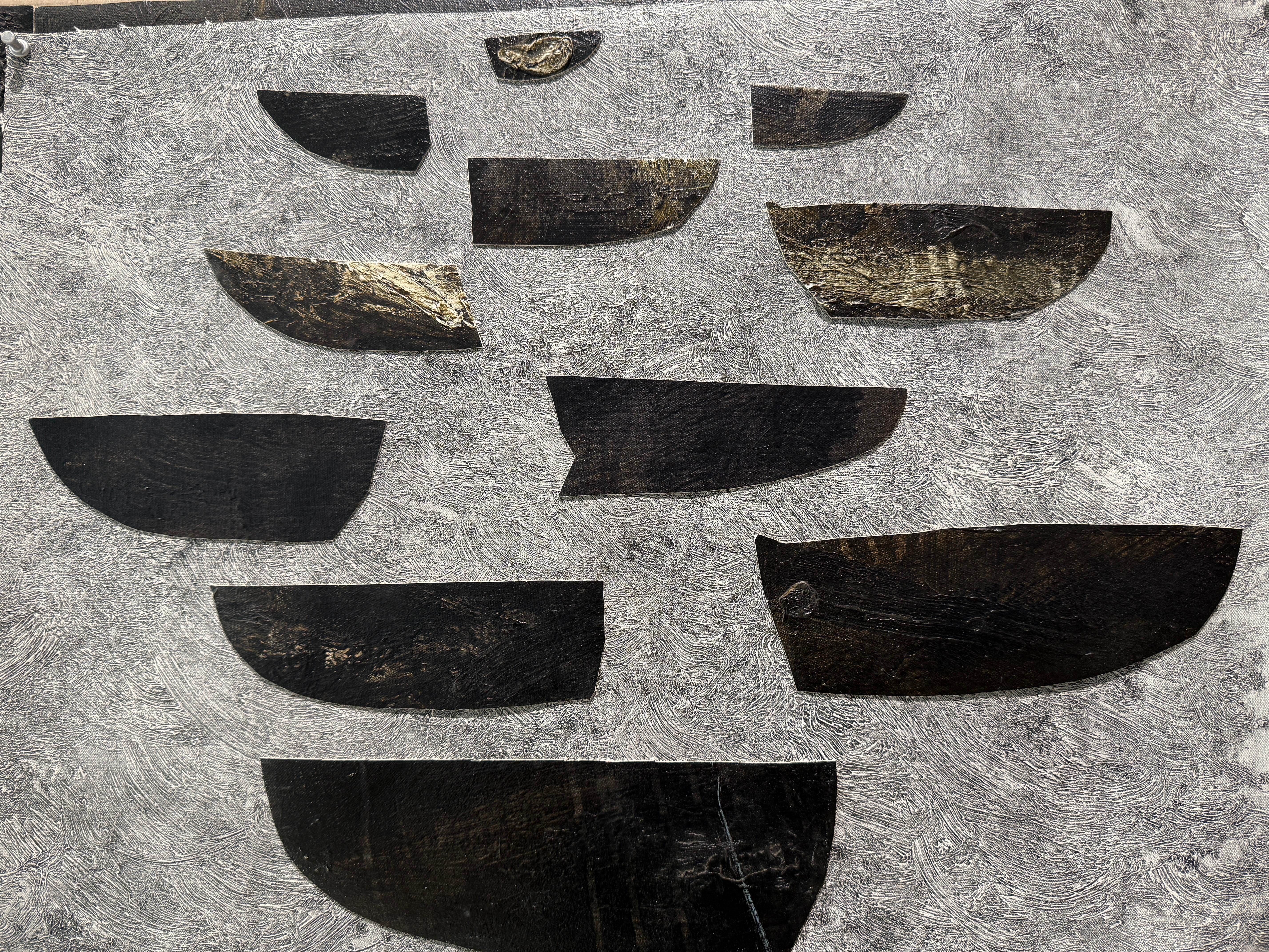 Eine Öl auf Leinwand, Leinwandcollage des amerikanischen Künstlers Terry Elkins. Elkins nimmt bemalte Leinwände, schneidet sie in einfache Bootsformen und arrangiert sie auf einer te...