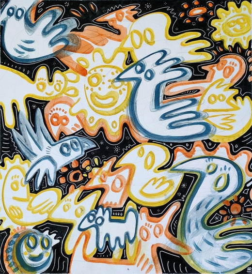 Ángel Moyano Rivas ist ein aufstrebender Maler aus Spanien, dessen Werke auf nationaler Ebene ausgestellt wurden. Rivas malt am häufigsten im Stil des abstrakten Expressionismus und hat seine Arbeiten auch als Art Brut bezeichnet. Im Mittelpunkt seiner Arbeit steht das Thema der Liebe und des Respekts für alle Wesen. Seine Werke sind fröhliche Kakophonien aus Farben und ineinandergreifenden Themen.