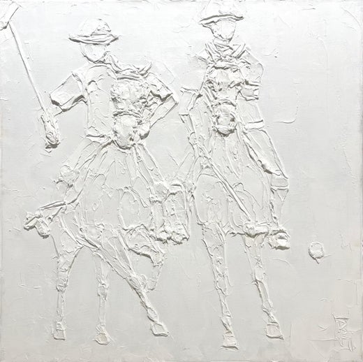 "Trot", 12x36 ist ein Ölgemälde auf Leinwand von der Künstlerin Brooke Major. In weißer Farbe ist eine Reihe von trabenden Pferden abgebildet. Der Künstler verwendet Schichten und Schichten von weißer Ölfarbe, um eine dreidimensionale Darstellung von Pferden zu schaffen. Ausdrucksstarke Pinselstriche und unterschiedliche Farbstärken erzeugen ein dramatisches Gefühl. Die überwiegende Verwendung von Weiß verleiht dem Ganzen eine klassische und beruhigende Wirkung.