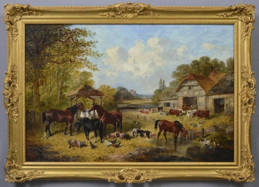 Charmantes Ölgemälde einer Landschaft aus dem 19. Bauernhofszene von John Frederick Herring, die verschiedene Tiere wie Pferde, Hühner, Ziegen und Enten zeigt und Kühe sowie einen ...