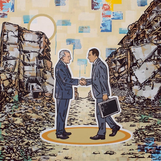 Ralf Schmidt: "Eine der Ideen für dieses Bild waren korrupte Waffengeschäfte in aller Welt: Die Hintergrundszene ist von der damaligen (und aktuellen) Situation in Syrien inspiriert, im Vordergrund stehen zwei Geschäftspartner, die zufrieden lächelnd ihr Geschäft abschließen. Ich hatte einige Bilder von dort gesehen und war entsetzt über die Situation. Weltweit werden mit Waffenexporten etwa 9,5 Milliarden Dollar erwirtschaftet. In einer Ausstellung sah ein Besucher das Bild als zwei Akteure, die die Sinnlosigkeit der gegenseitigen Zerstörung erkennen und sich gemeinsam für einen Neuanfang entscheiden. Wie die meisten meiner Bilder hat auch dieses einen symbolischen Charakter; es lässt sich auf Prozesse in der Geschäftswelt anwenden."