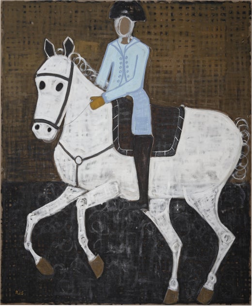 Chupa Chups, 2023, Öl, Acryl, Ölstift, Kohle, Bleistift und Sprühfarbe auf Leinen, 220 x 180 cm (nach John Vanderbank, A young gentleman riding a schooled horse, 1729 / Man on horseback, 1728)