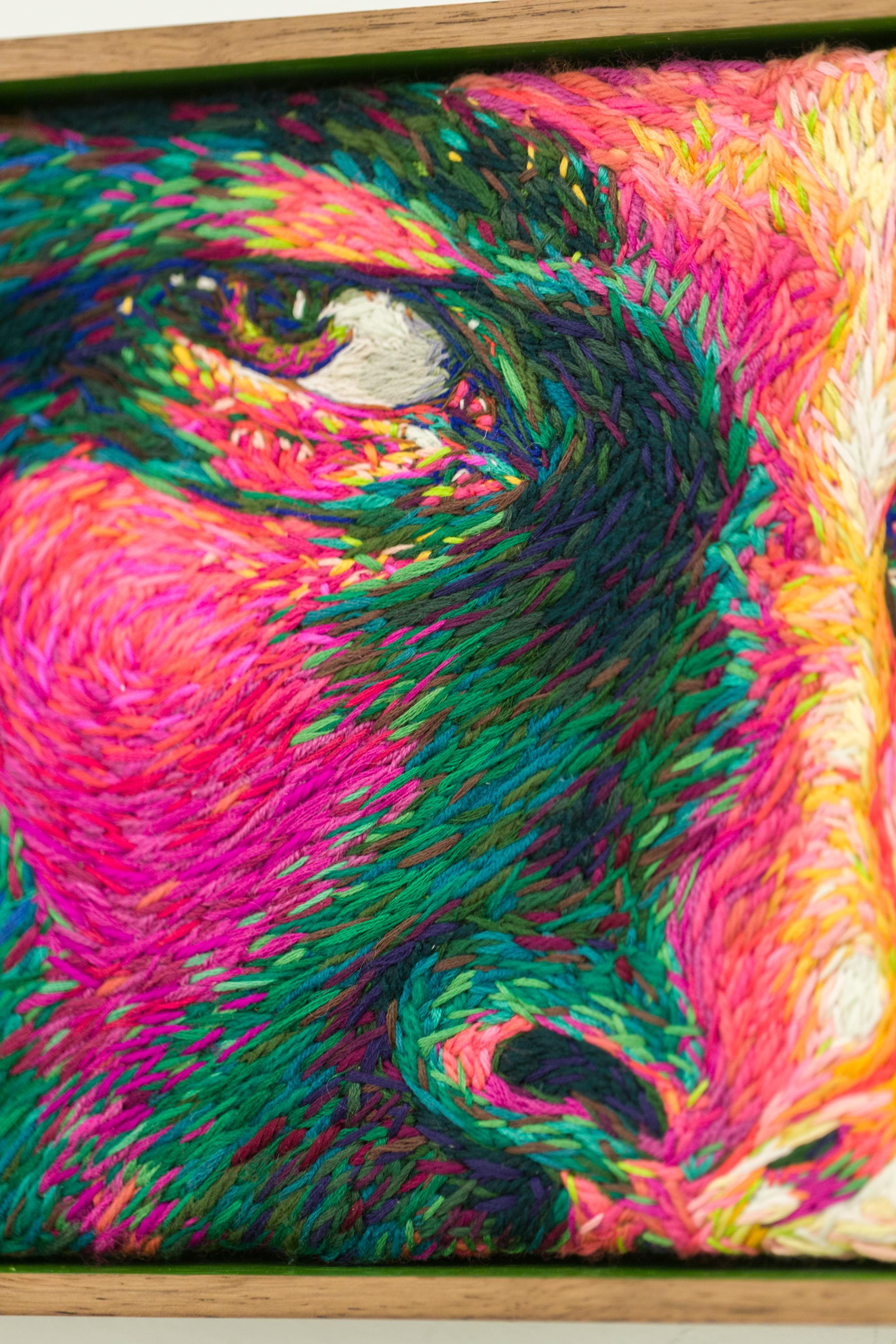 Diese Arbeit mit dem Titel "The Extra Mile" ist eine Originalarbeit von Danielle Clough, die Teil ihrer jüngsten Einzelausstellung "Crewel Intentions" ist und stark strukturierte und mit Garn gestickte Porträts zeigt. Clough bezieht sich auf Anzeigen aus alten Magazinen und setzt diese sinnlichen Figuren in Wolle, Baumwolle, Viskose und Seide auf Leinen in einen neuen Kontext. Dieses Stück misst 8,25 "h x 16,25 "b x 1,5 "d und wird gerahmt mit einem vom Künstler signierten Echtheitszertifikat geliefert.