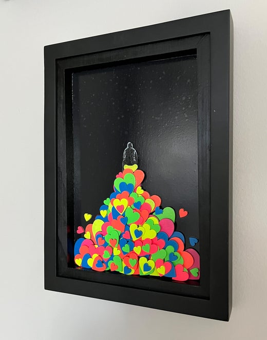Editionsversion - colagrauer und schwarzer Hintergrund mit klar fluoreszierenden Weltraumstern-Spritzern mit 3D-fluoreszierendem Herzberg und Mann, ...