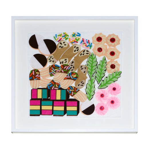 Original Sam Sidney Filzcollage, die einen italienischen Keksteller darstellt. Die Filzcollage ist auf säurefreiem Karton in einem weiß gestrichenen Schattenboxrahmen montiert. Unte...