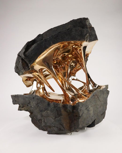 Alle anzeigenAlchemy by Romain Langlois - Rock-like bronze sculpture, golden, abstract