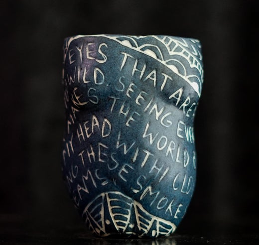 Diese Tasse ist eine von 48, die in der Installation "Fragmente unserer Liebesgeschichte" zu sehen sind. Diese Becher haben weibliche Formen, die an die Venus von Willendorf und andere historische Fruchtbarkeitsobjekte erinnern. Die Schnitzereien enthalten viele meiner eigenen Schriften und fließen von einer Tasse zur anderen. So wie wir die Geschichten der anderen in Stücken und Teilen aufbewahren, gibt es die Tassen jetzt überall in Zeit und Raum, mit vielen Sammlern. Keiner von ihnen hat die gleichen Worte, was jeden in Form, Farbe und Inhalt einzigartig macht.