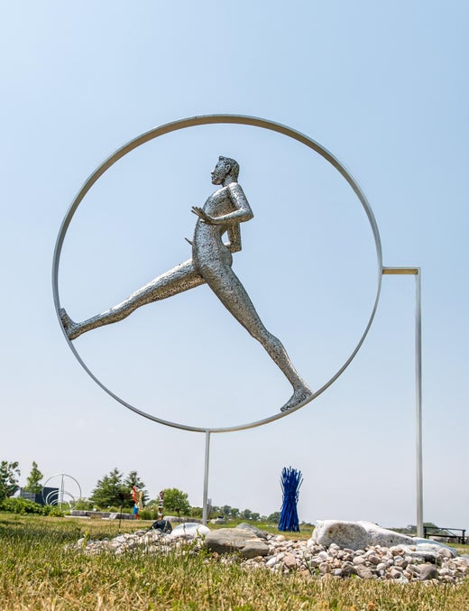 Hier steht eine Figur mit gespreizten Beinen und ausgestreckten Armen, als würde sie versuchen, das Gleichgewicht in einem großen Kreis zu halten. Die aus Aluminium gegossene Oberfläche ist sowohl glänzend als auch stark strukturiert. Ist dies ein weiterer kluger sozialer Kommentar zur universellen Suche nach einem Gleichgewicht in unserem Leben?