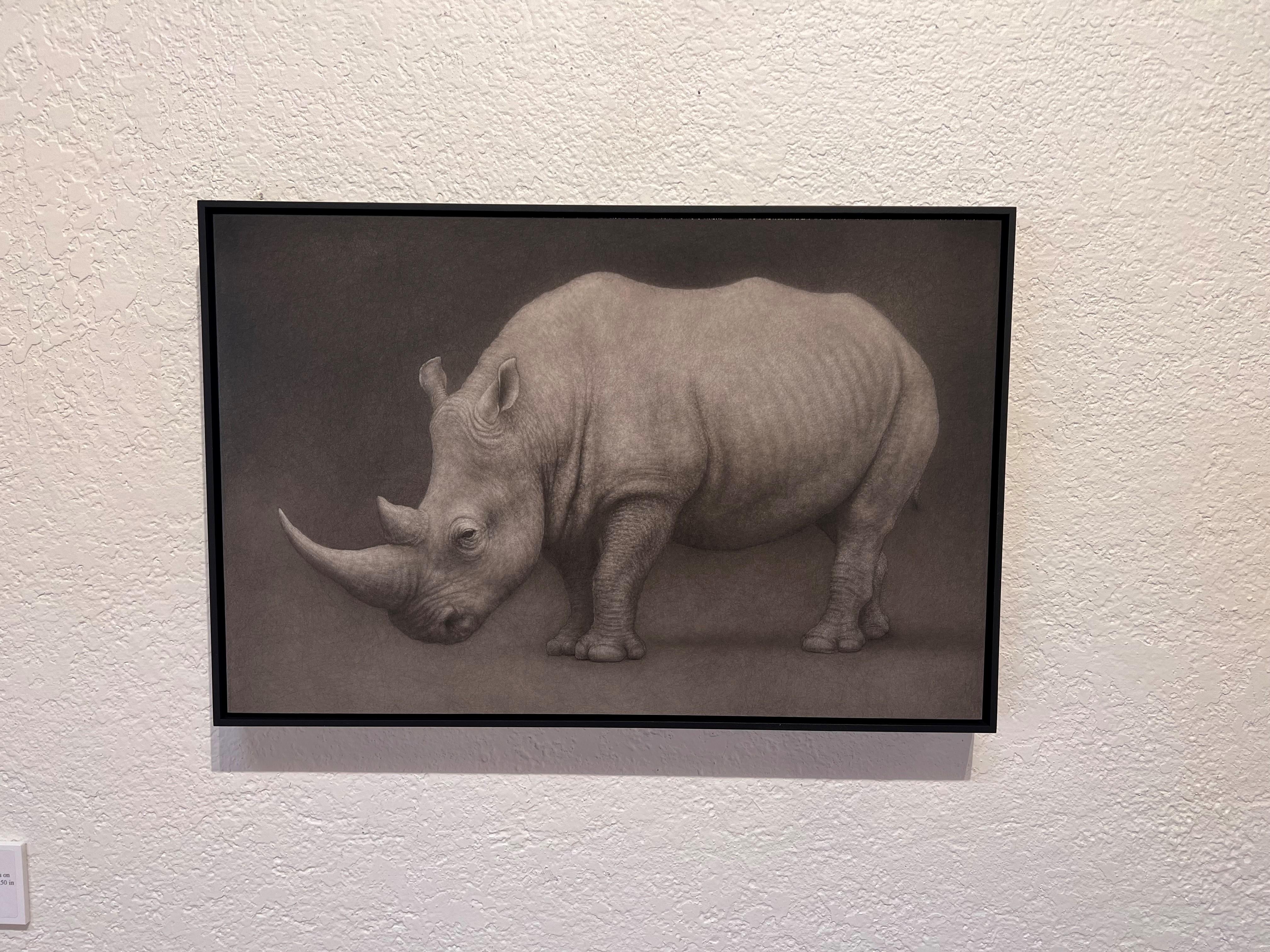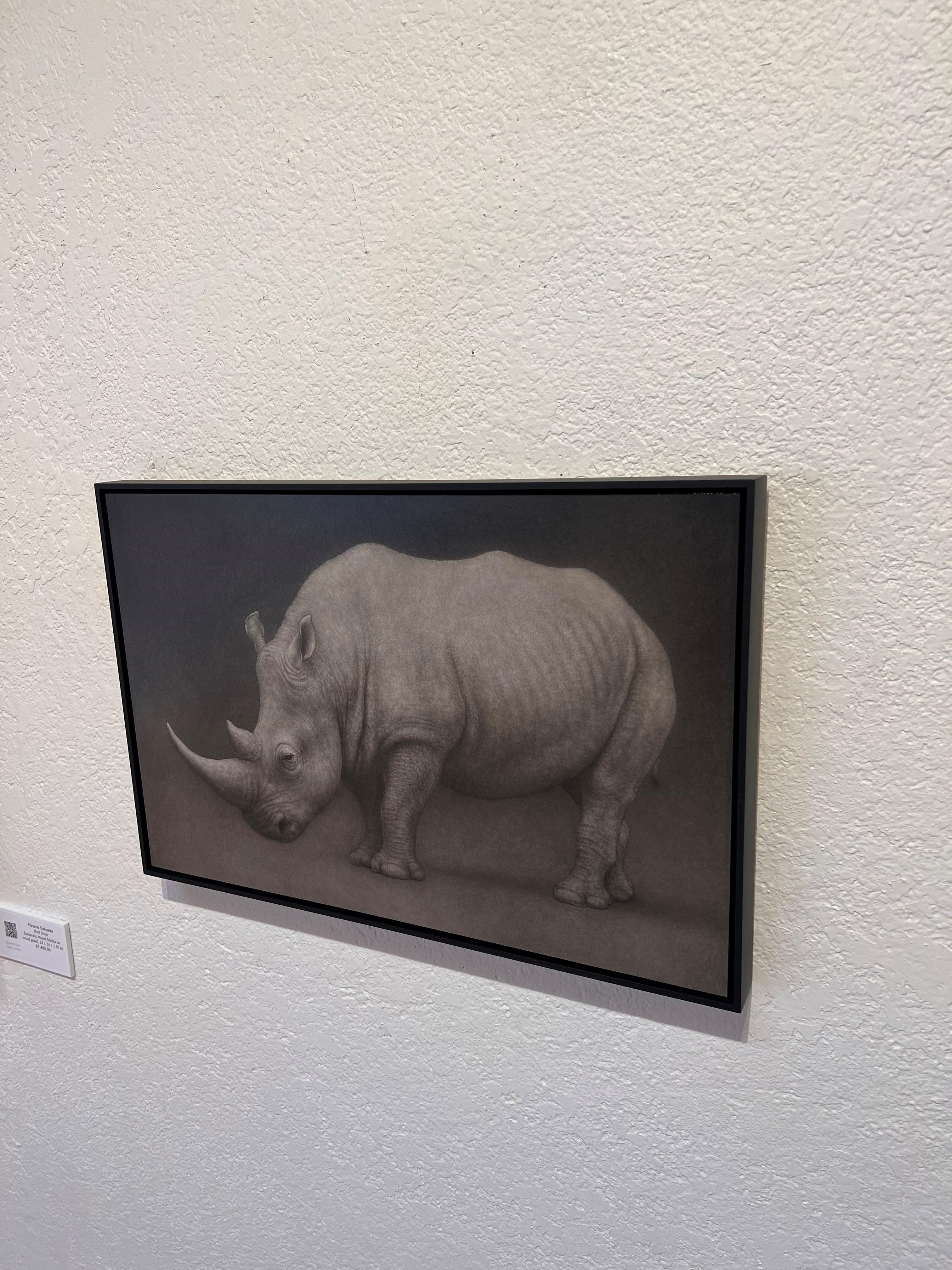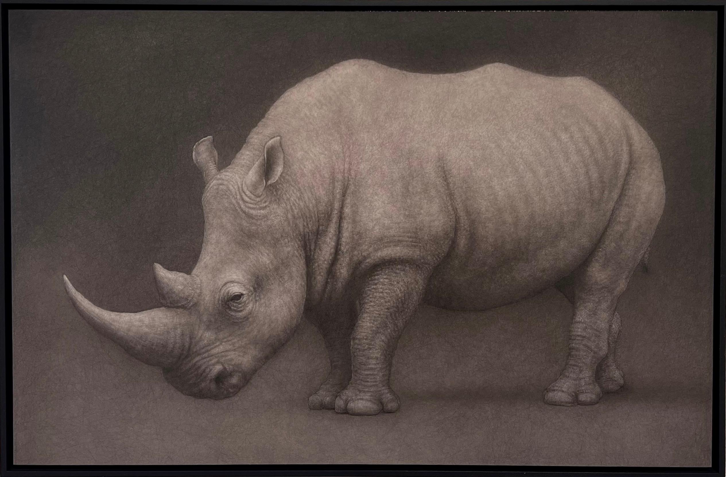 "Southern White" (2025) von Lee Andre ist eine wunderschöne fotorealistische Kohlezeichnung eines Breitmaulnashorns, das Blickkontakt mit dem Betrachter aufnimmt. Dieses Stück ruht auf 13 x 20 "und ist auf 13,75 x 20,75 Zoll in einem schwarzen quadratischen Holzrahmen gerahmt.