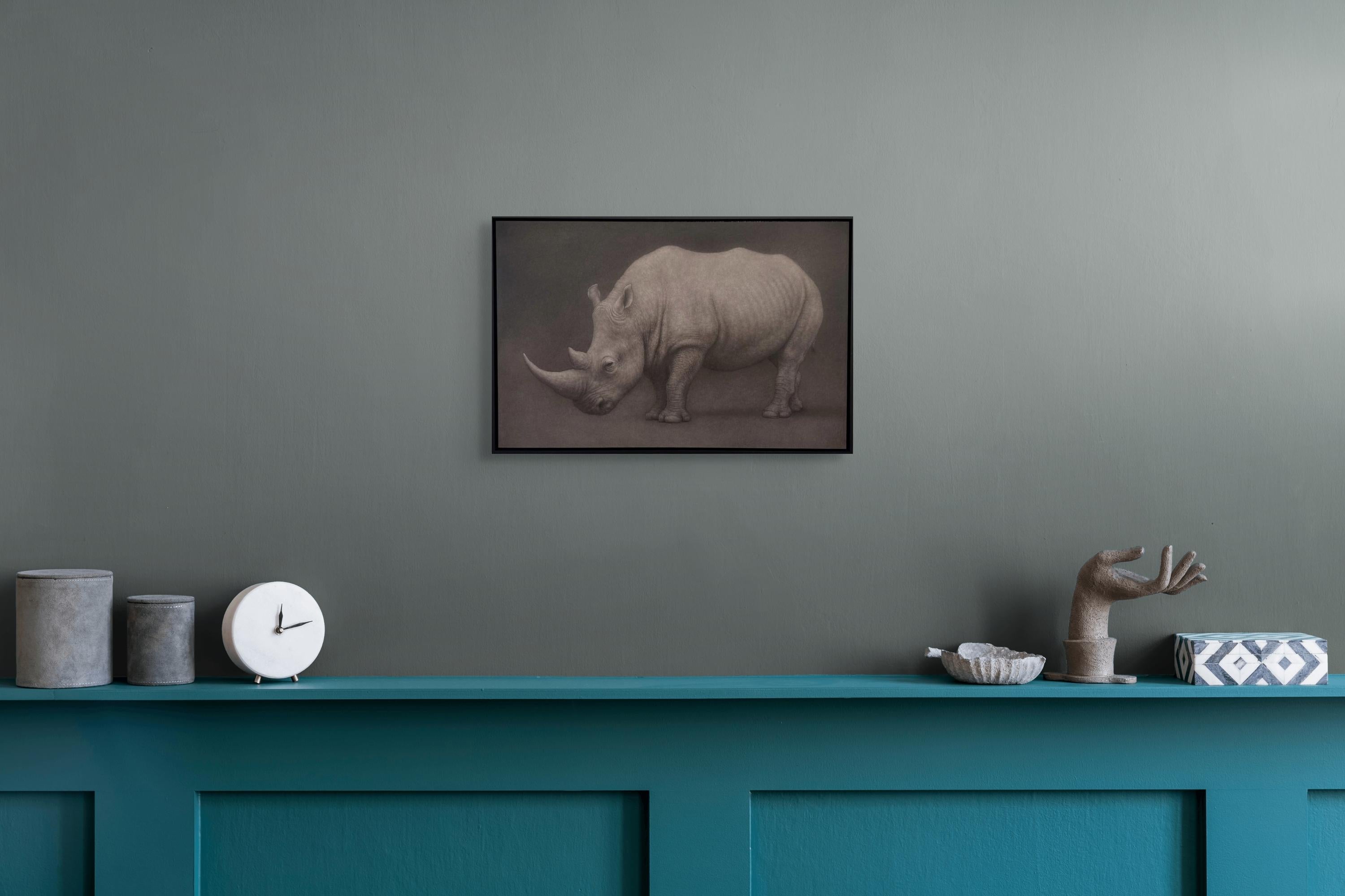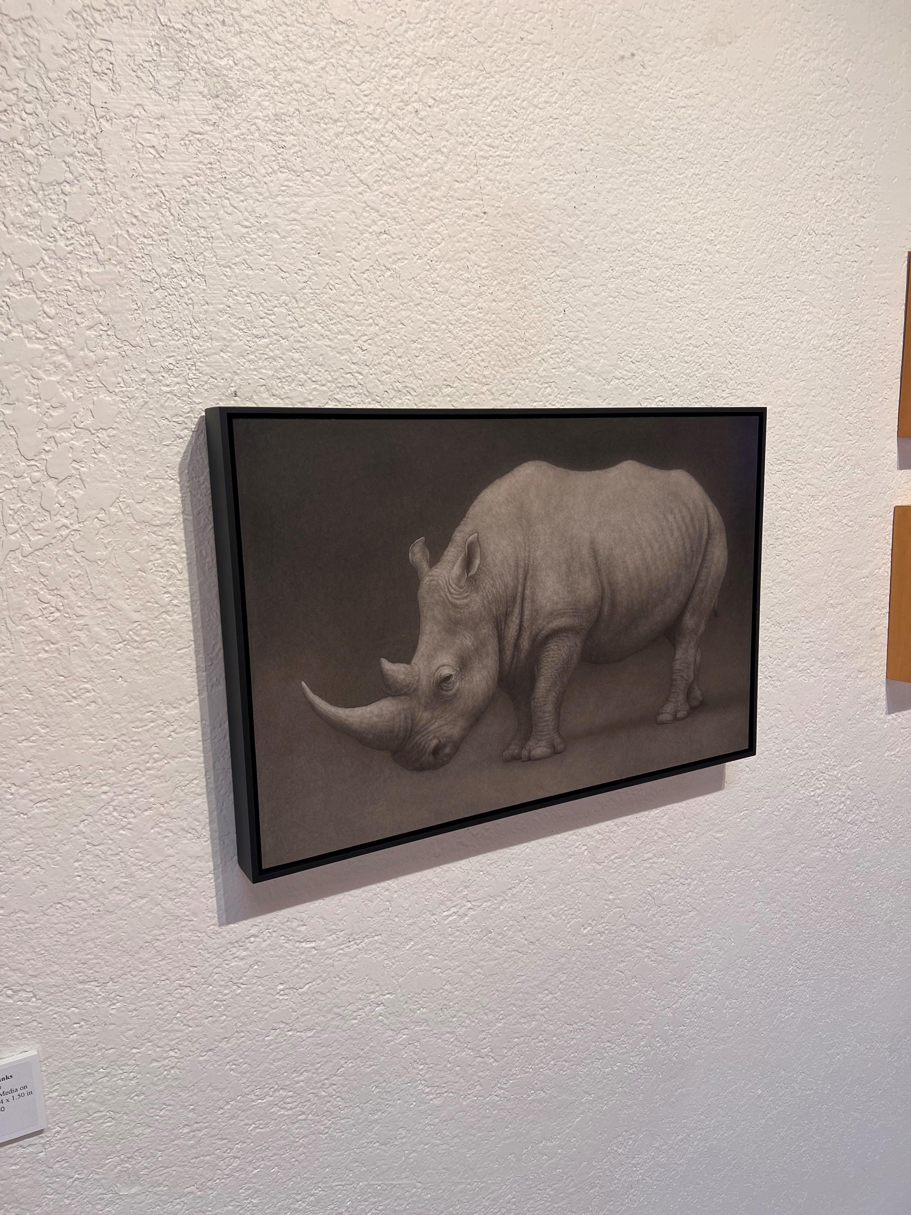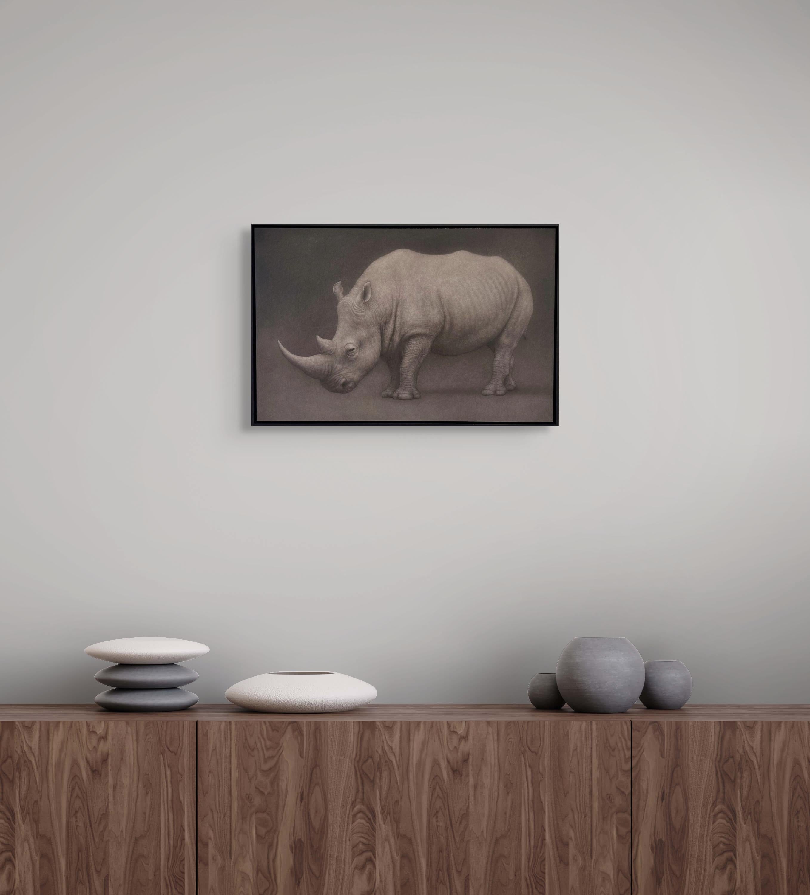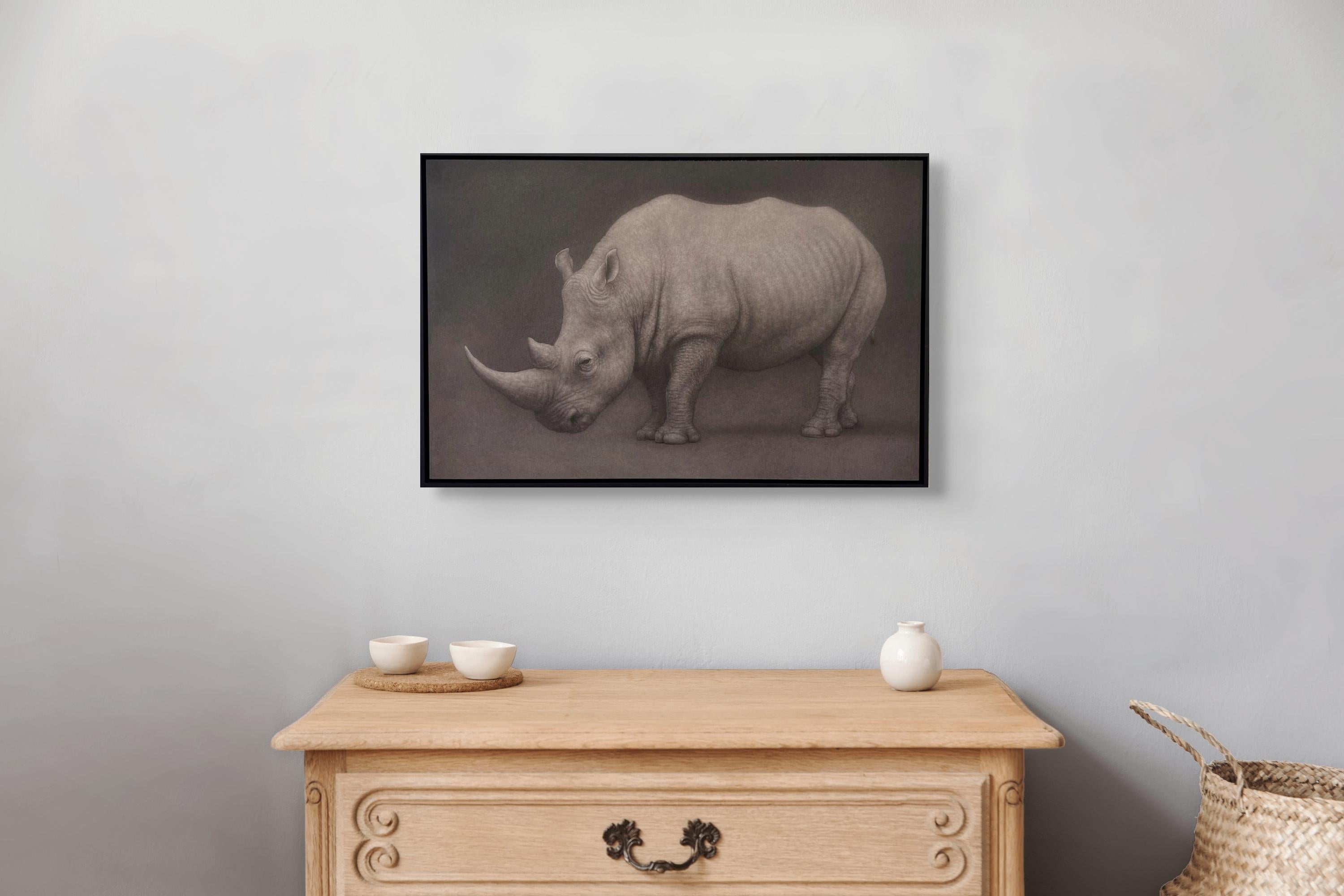 "Southern White" (2025) von Lee Andre ist eine wunderschöne fotorealistische Kohlezeichnung eines Breitmaulnashorns, das Blickkontakt mit dem Betrachter aufnimmt. Dieses Stück ruht auf 13 x 20 "und ist auf 13,75 x 20,75 Zoll in einem schwarzen quadratischen Holzrahmen gerahmt.