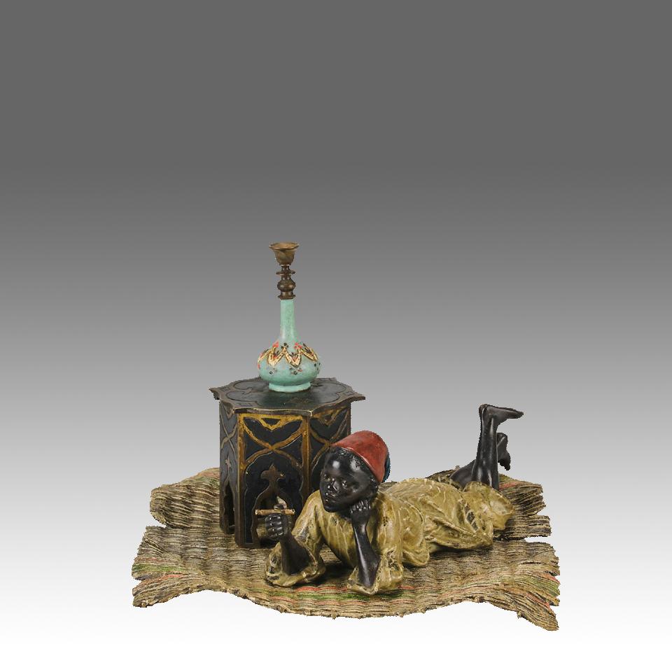 An excellent early 20th Century Austrian bronze study of a young Arab boy wearing a fez and holding a cigar whilst reclining on a straw rug next to an Orientalist table. The surface of the bronze with rich cold painted colours and very fine hand finished detail, signed with the Bergman 'B' in an amphora