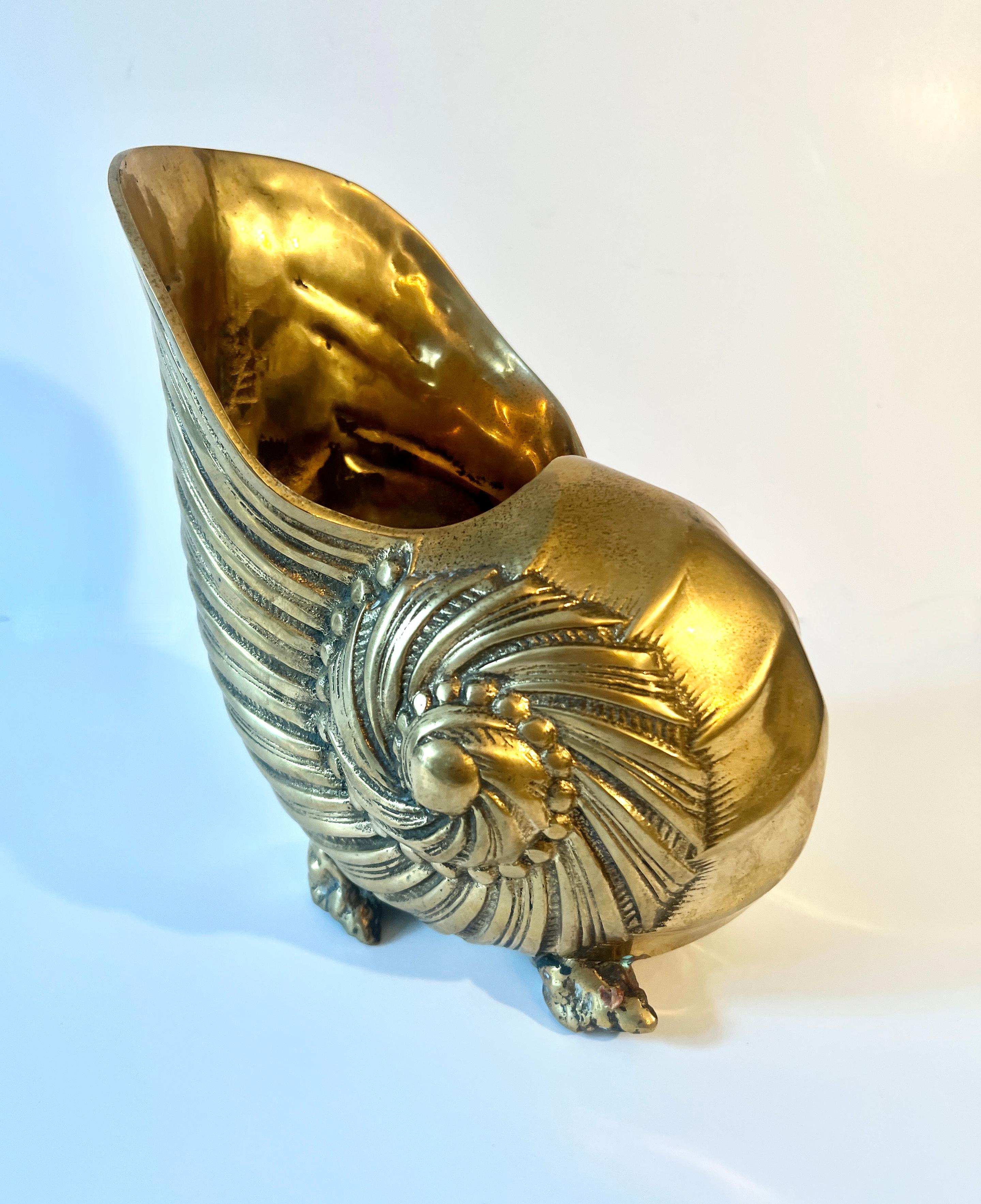 Eine schöne Messing Muschel Pflanzgefäß oder Jardiniere. Das Design ist einzigartig, denn jede Seite ist anders, eine konvex, die andere eher konkav. Die Füße sind ebenfalls aus Messingschalen. Hervorragend geeignet für eine Zimmerpflanze oder ein Arrangement.