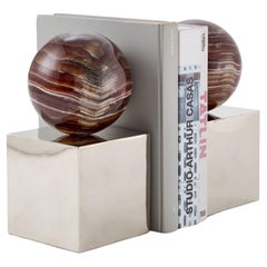 Salta bookends are solid heavy beautiful pieces of geometrical onyx stone, mostly in square base and round top. Very sharm for a personal library.