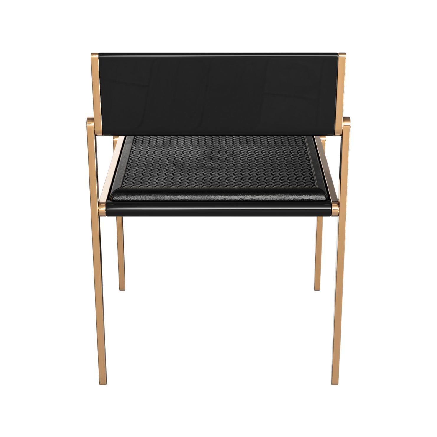 Der Mika Chair besteht aus einem Gestell aus polierter Bronze, das mit einer Polsterung aus gewebtem Leder versehen ist. Die Lichtreflexion des Bronzerahmens hebt die gewebten Detail...