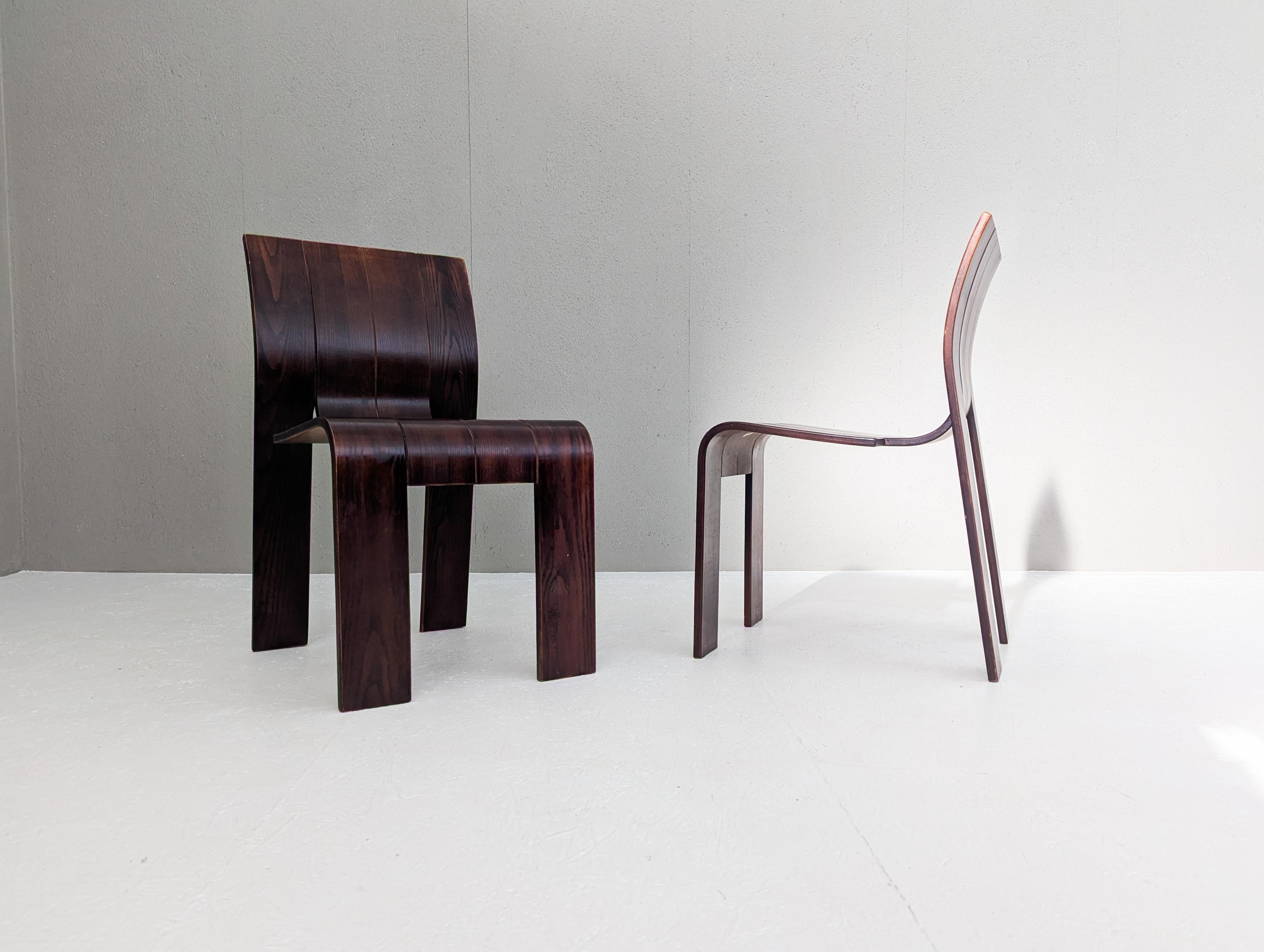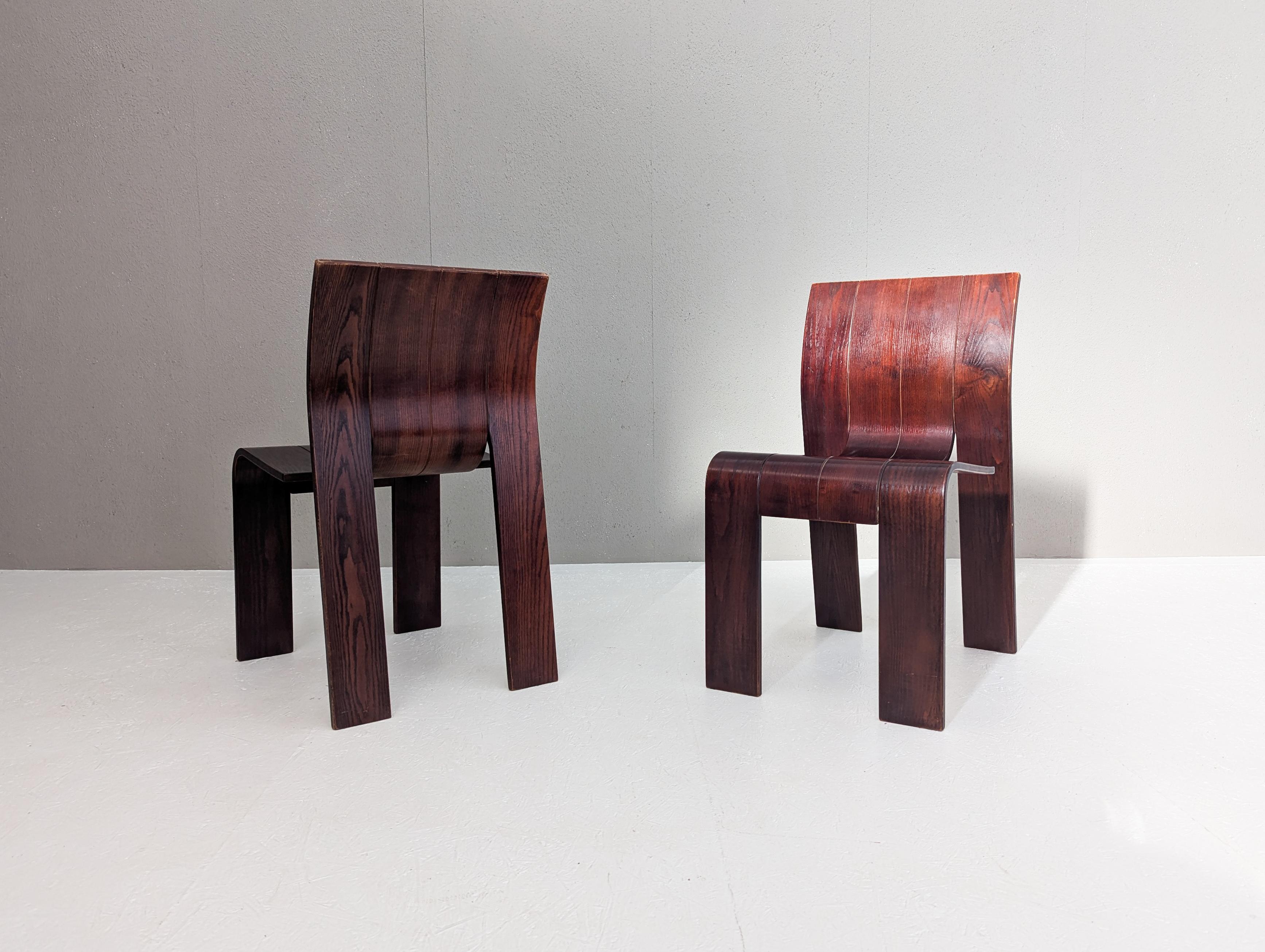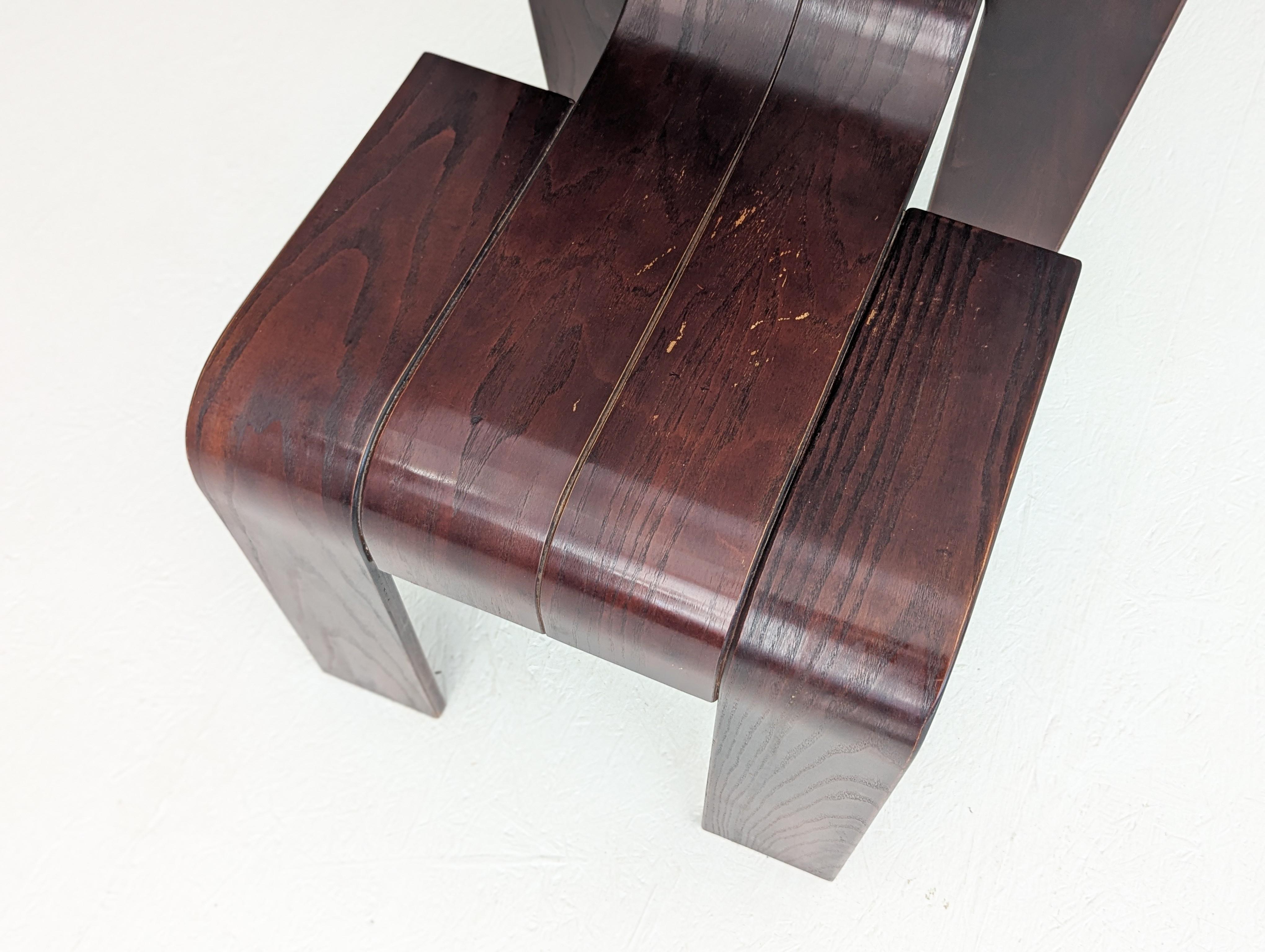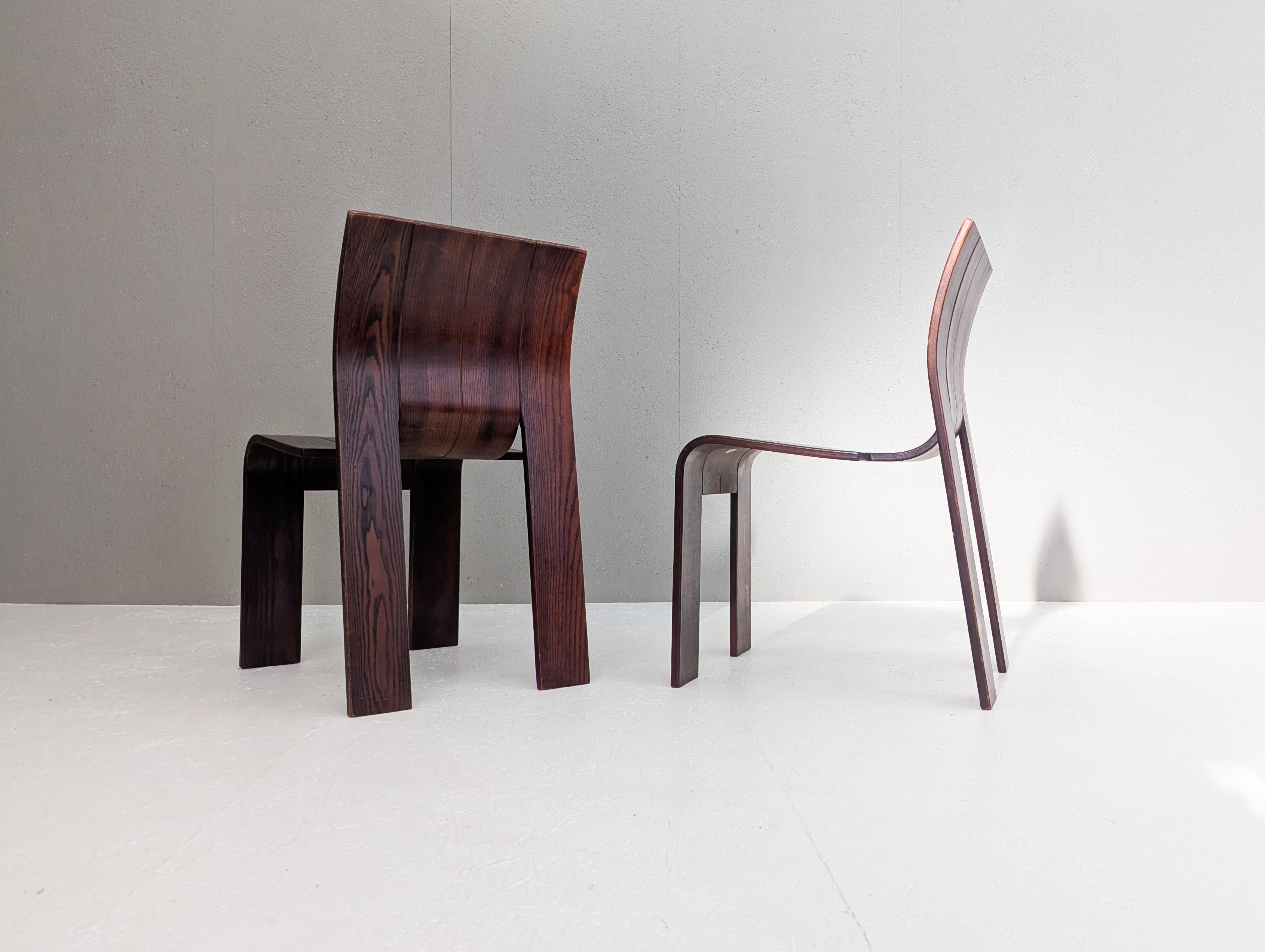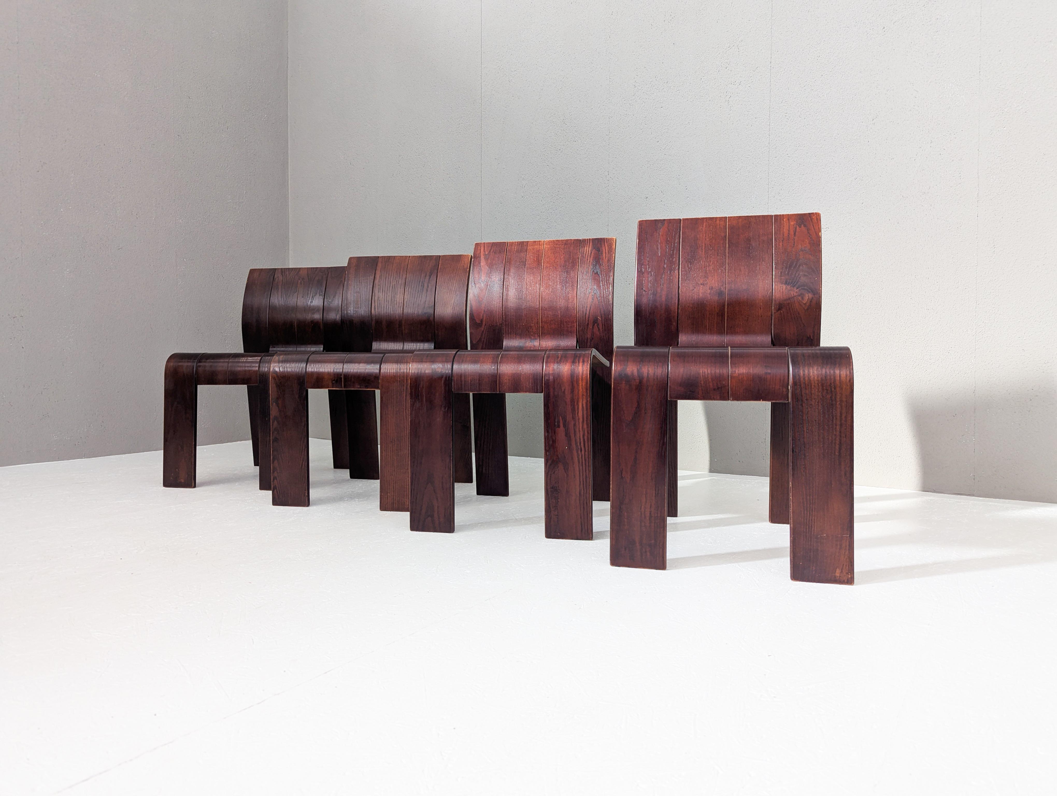 Die Stühle zeichnen sich durch eine durchgehende, bandartige Silhouette mit geschwungenen Rückenlehnen und Beinen aus, die aus gestapelten Holzleisten geschnitten und gebogen sind und ein überraschend ergonomisches und optisch einheitliches Profil bieten.