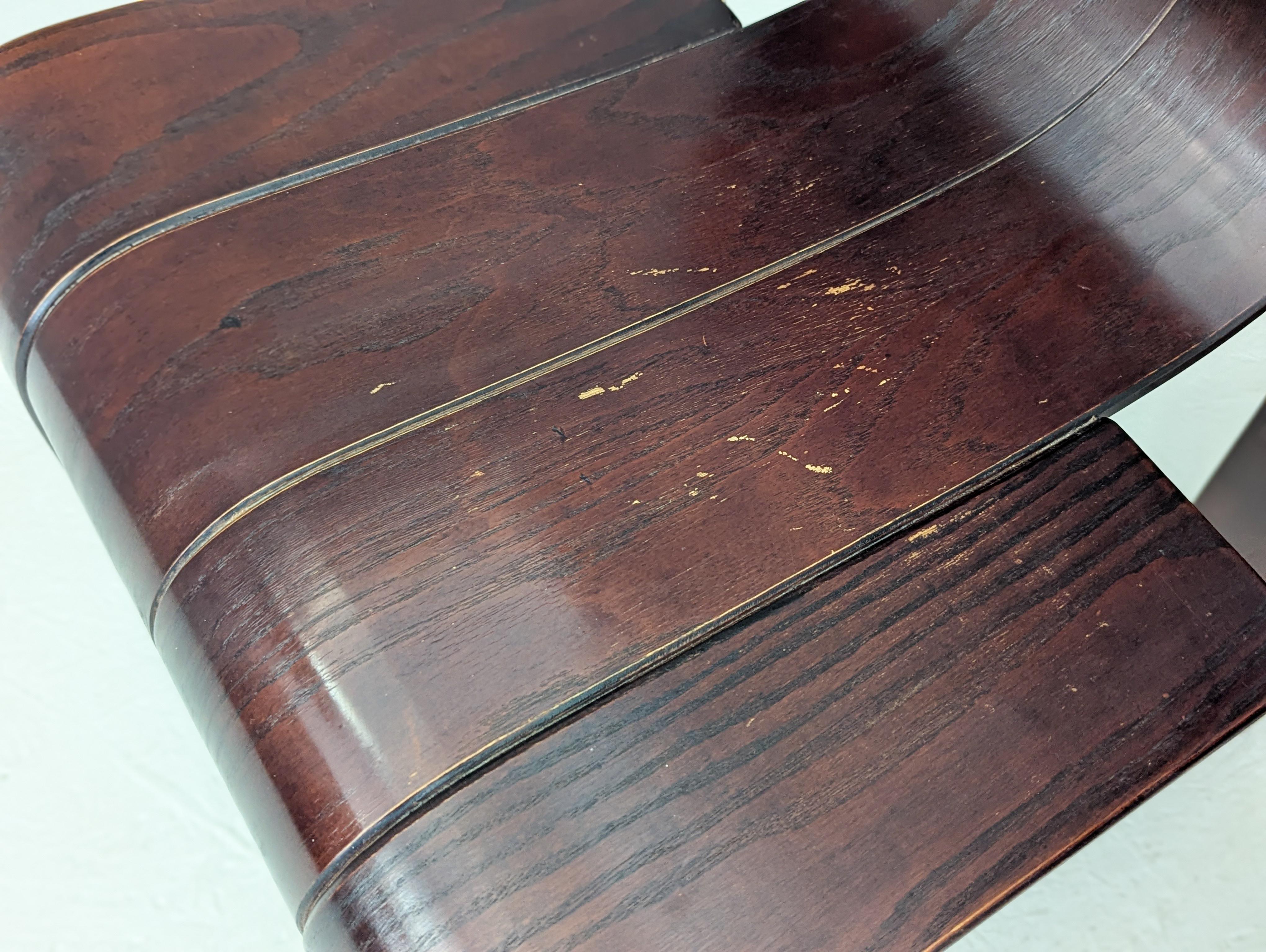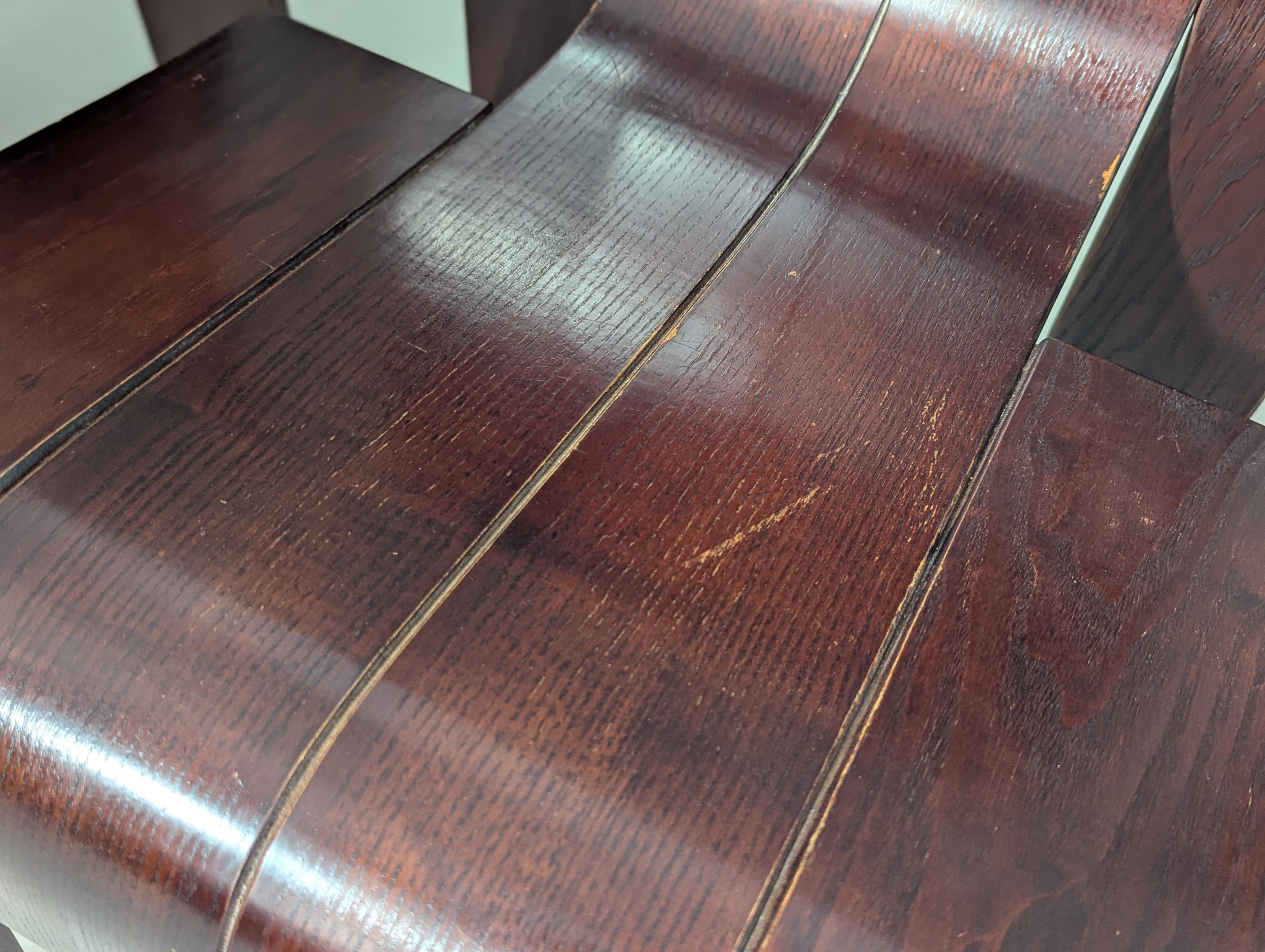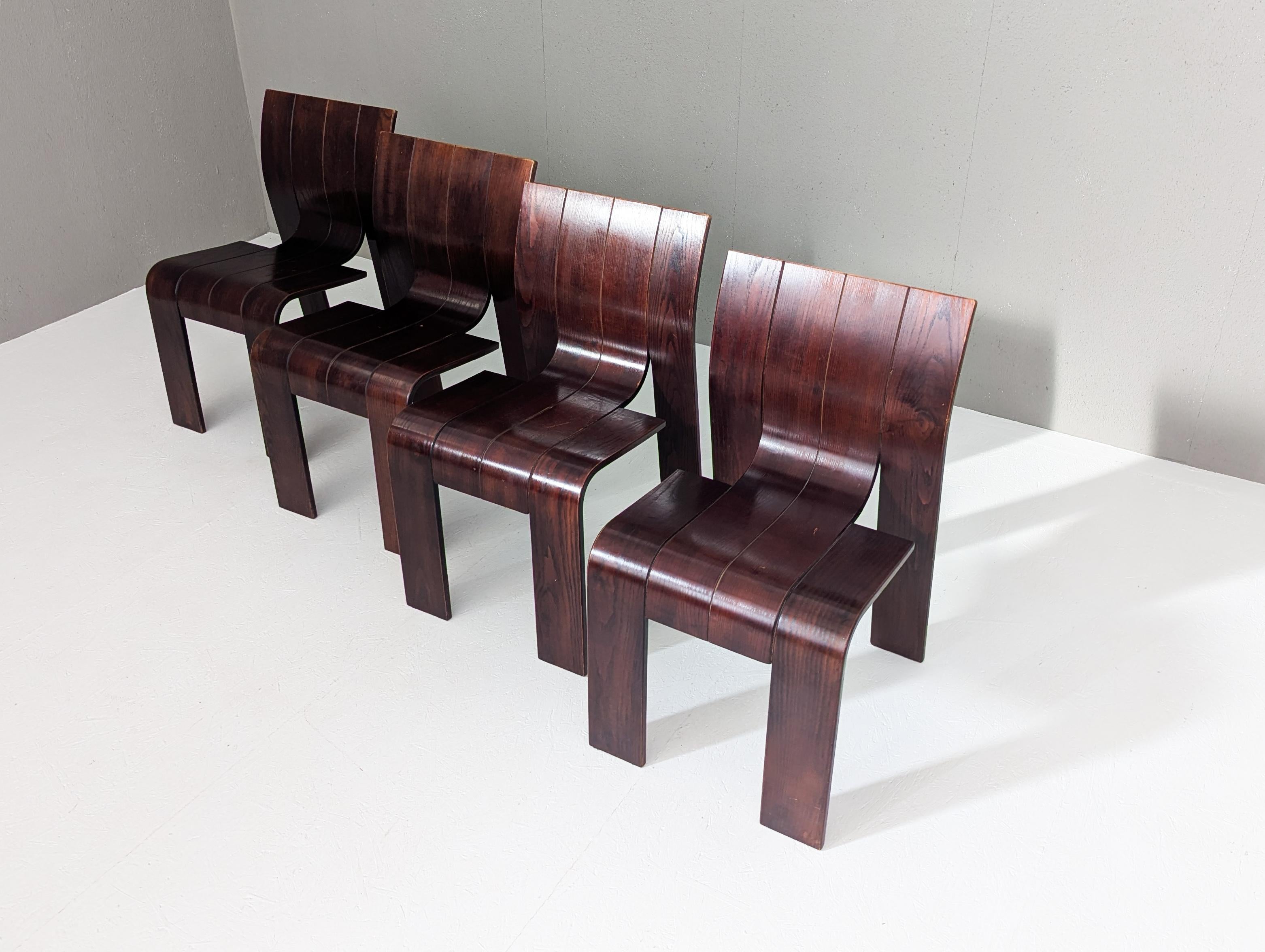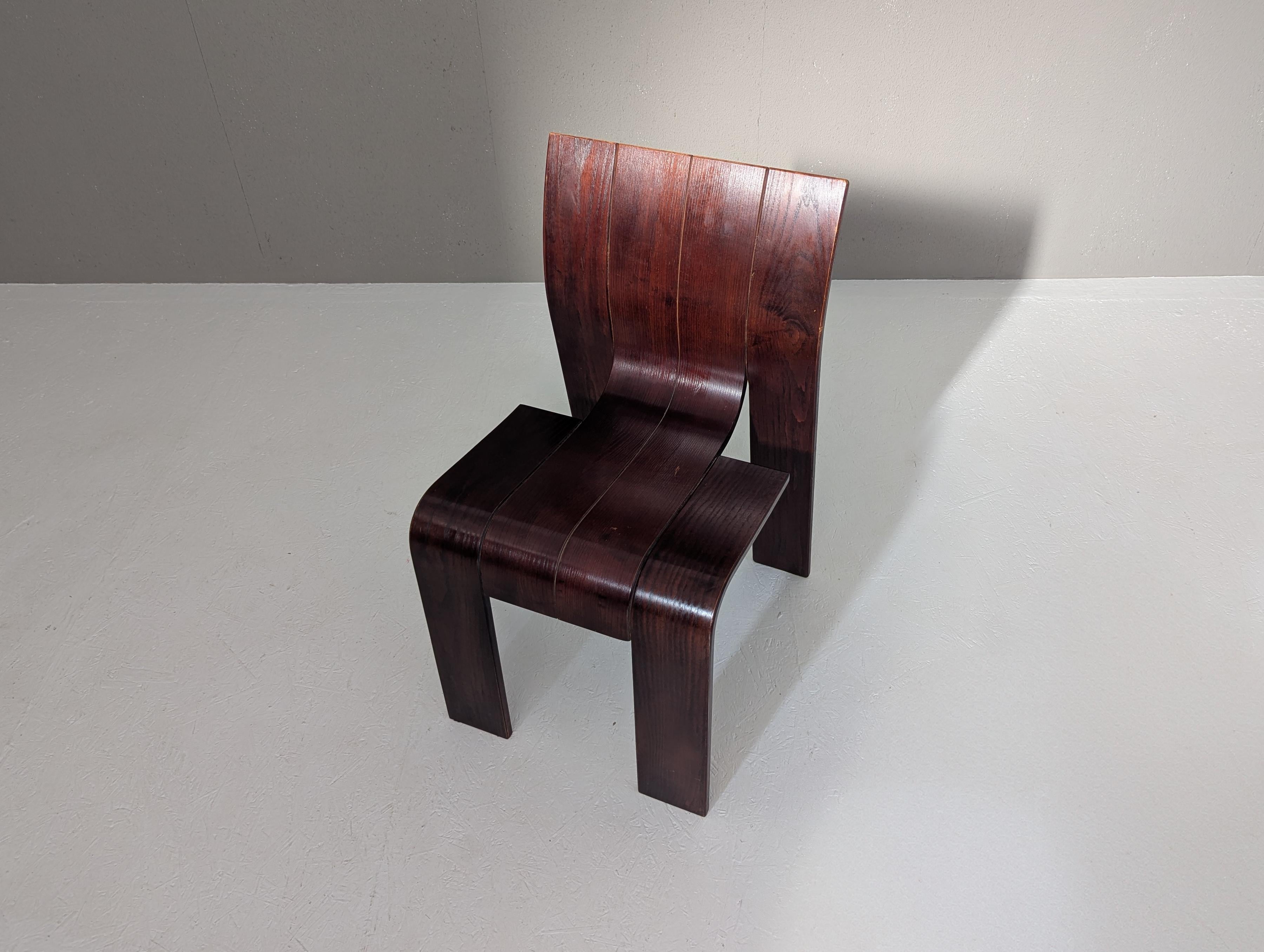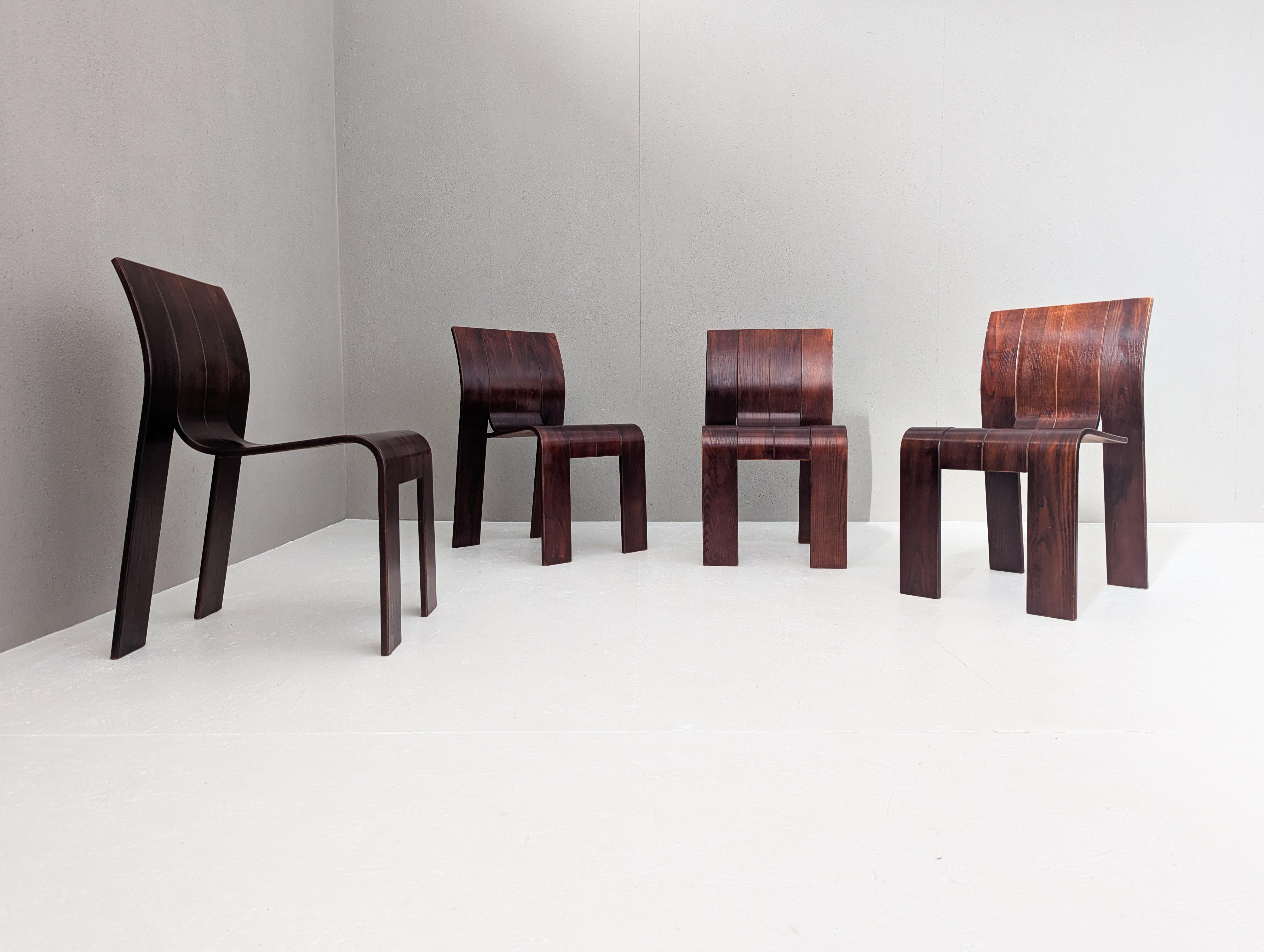 Die Stühle zeichnen sich durch eine durchgehende, bandartige Silhouette mit geschwungenen Rückenlehnen und Beinen aus, die aus gestapelten Holzleisten geschnitten und gebogen sind und ein überraschend ergonomisches und optisch einheitliches Profil bieten.