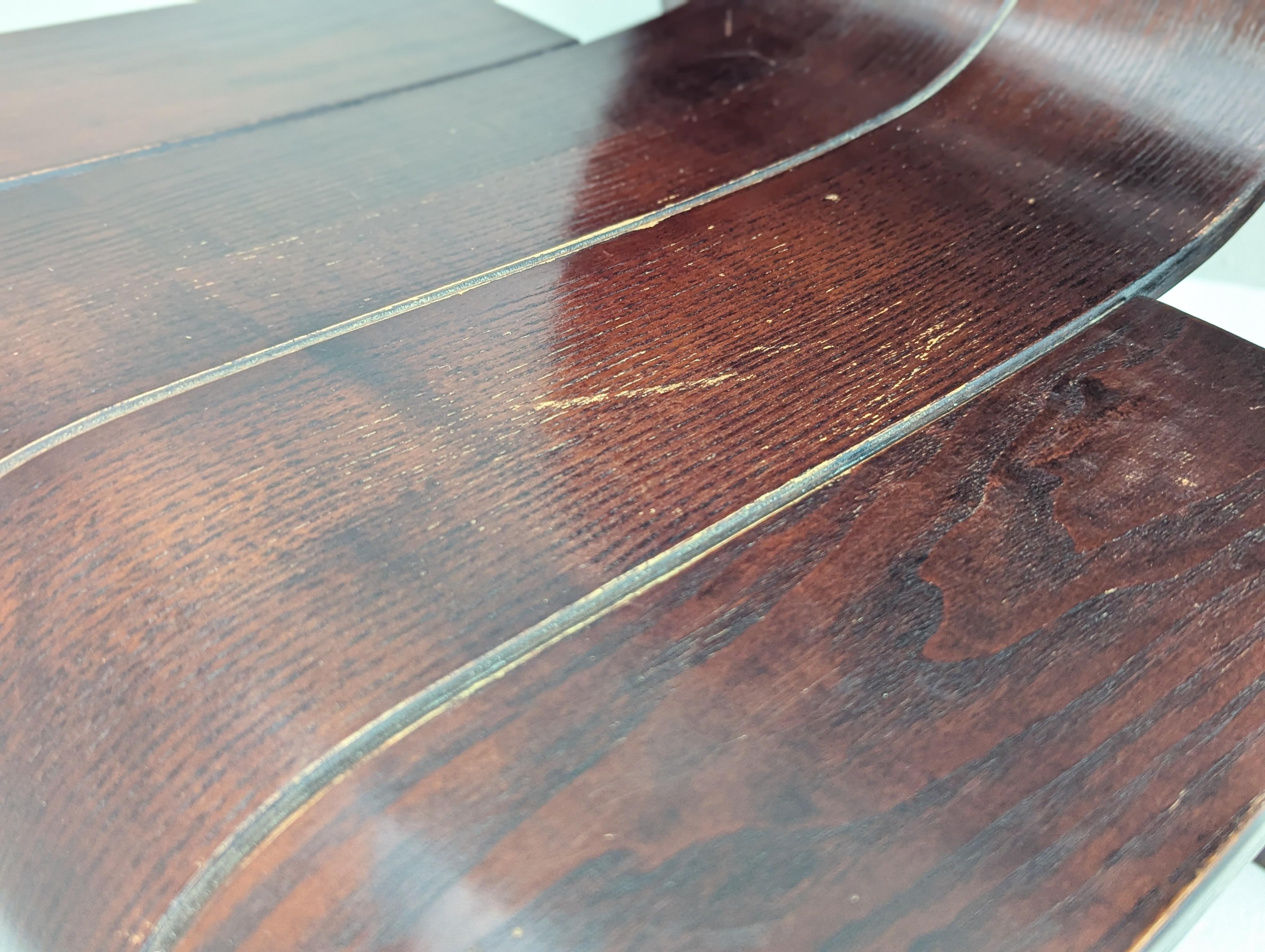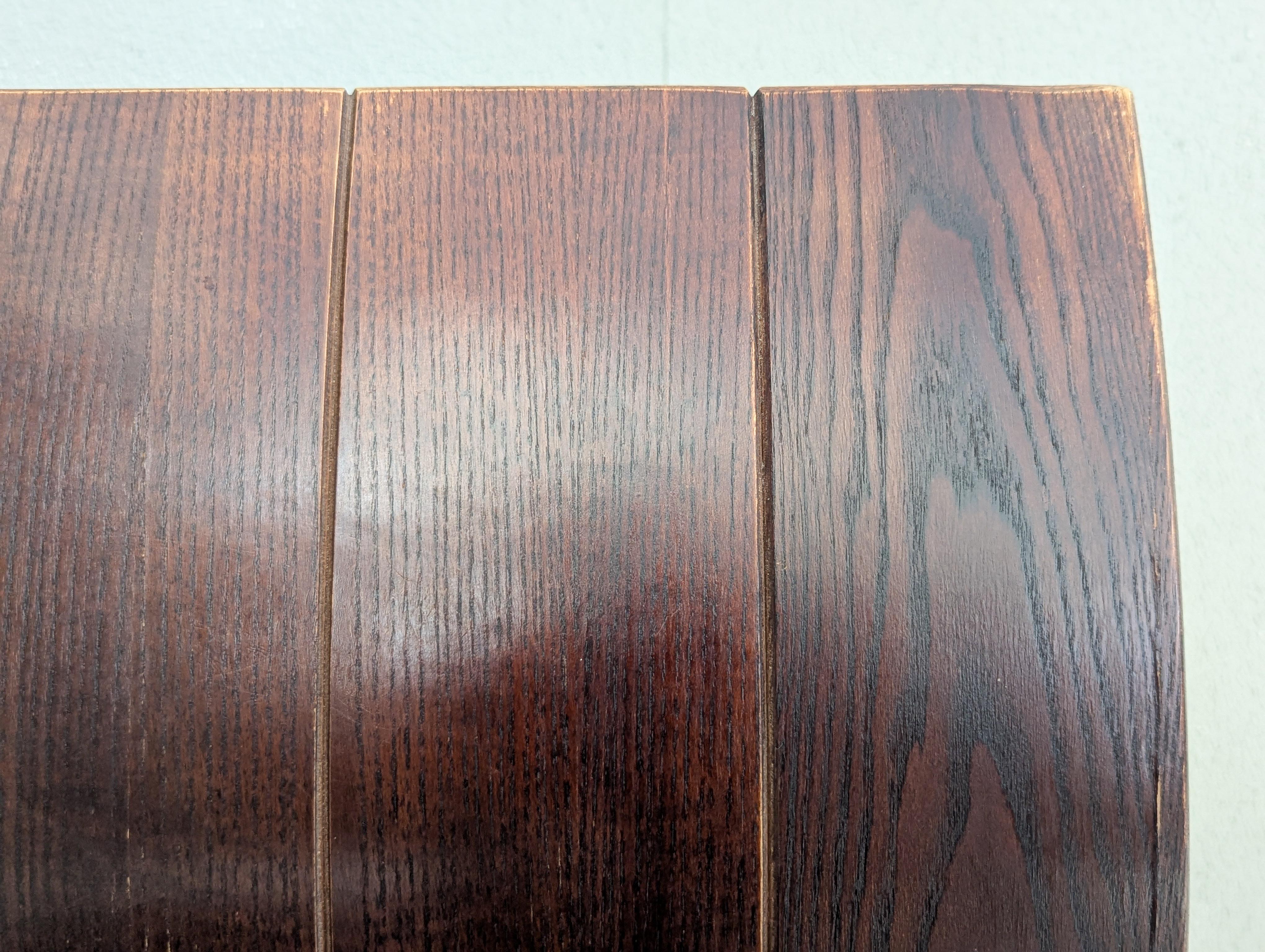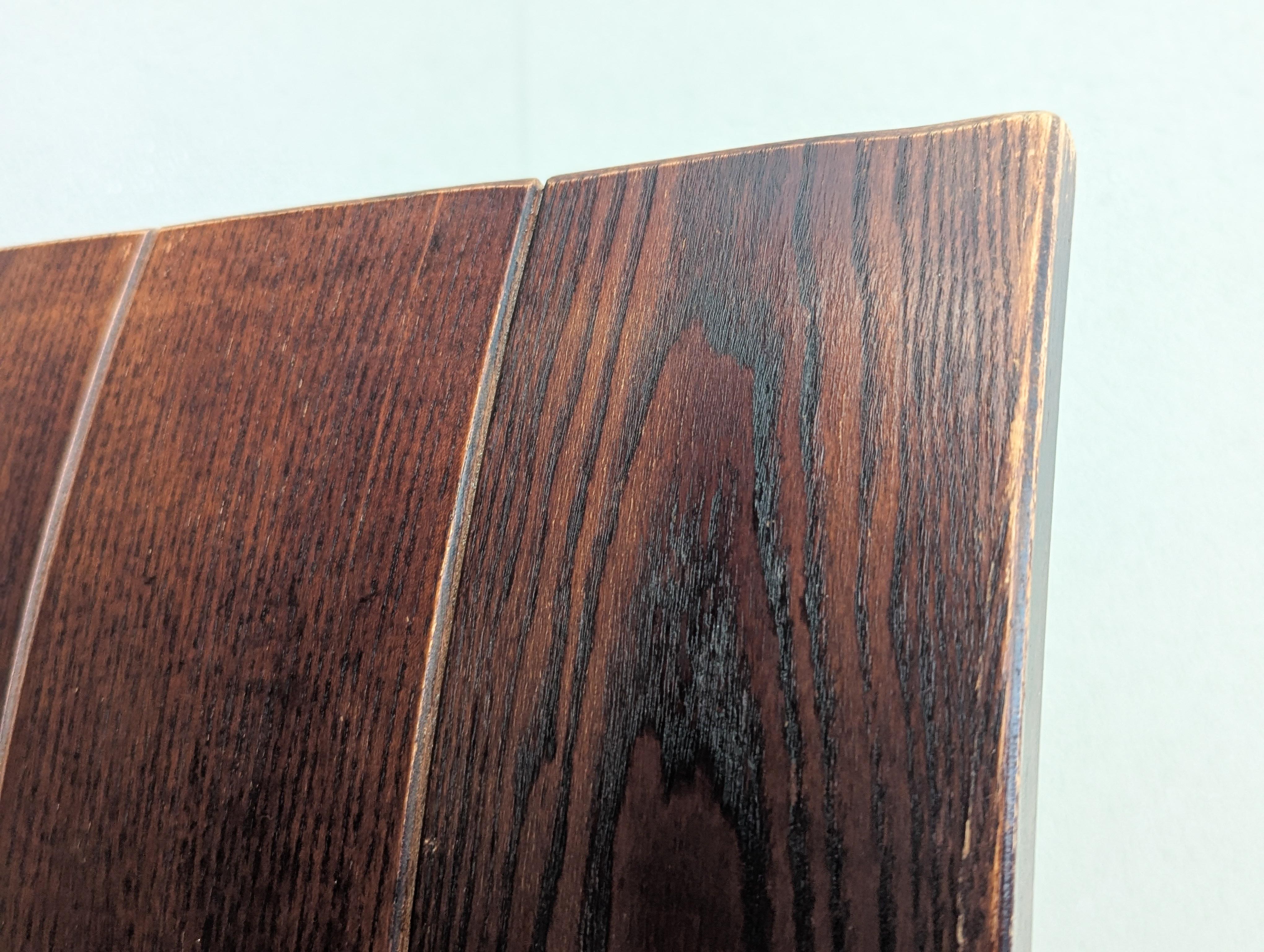 Die Stühle befinden sich in einem guten Vintage-Zustand mit einigen sichtbaren Gebrauchsspuren wie Kratzern auf der Oberfläche, leichtem Verblassen und Tonabweichungen im Holz - alles im Einklang mit Alter und Gebrauch. Strukturell solide und voll funktionsfähig, behält es seine kühne visuelle Präsenz und bleibt ein sammelwürdiges Beispiel für Bakkers frühes Werk.