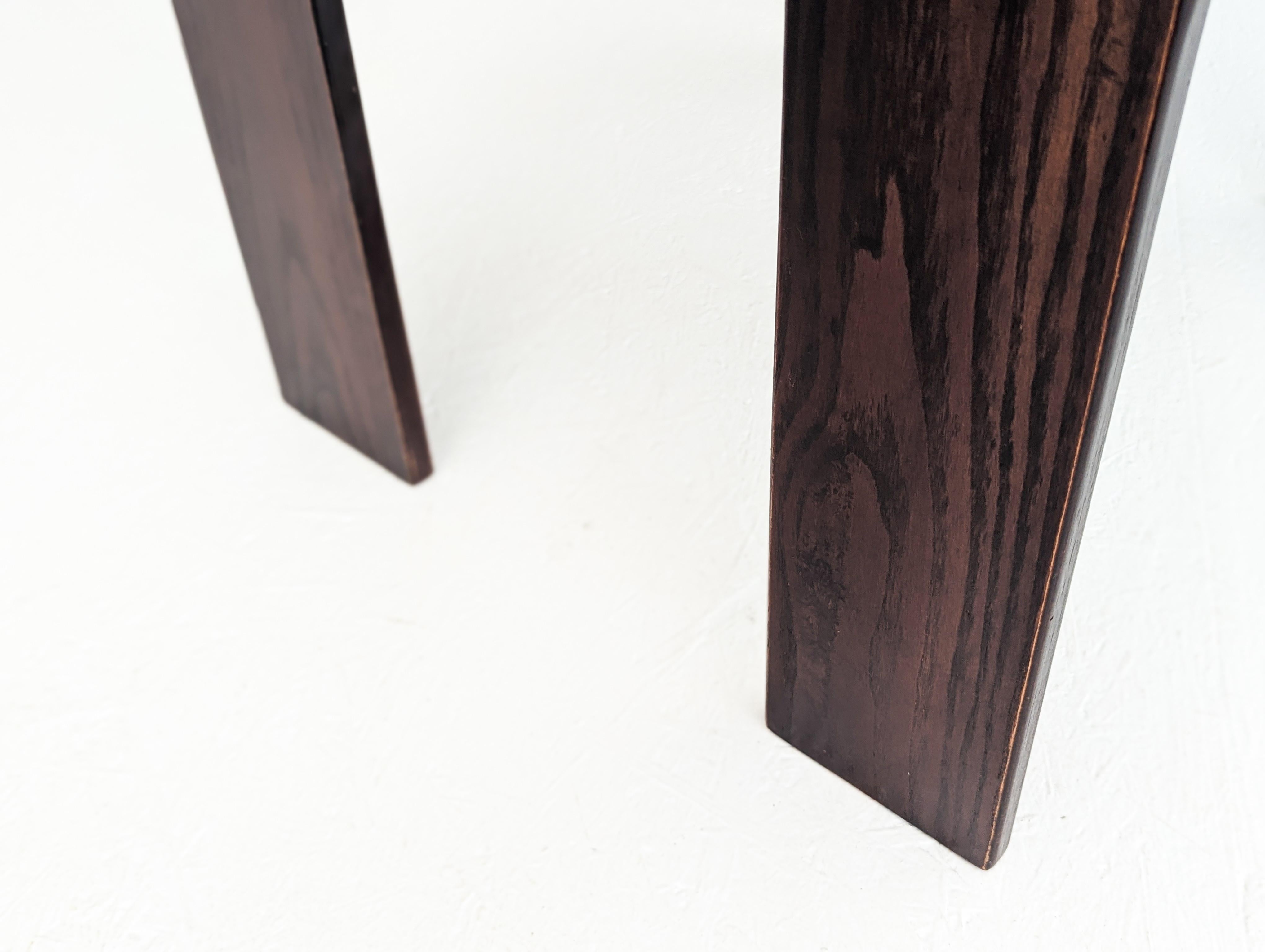 Die von Gijs Bakker in den frühen 1970er Jahren für den niederländischen Hersteller Castelijn entworfenen "Strip"-Esszimmerstühle sind ein ikonischer Ausdruck des radikalen Minimalismus und der postmodernen skulpturalen Form. Ganz aus dunkel gebeizten, laminierten Holzlamellen gefertigt - eine Konstruktionstechnik, die der Collection'S ihren Namen gibt und sie zugleich definiert.