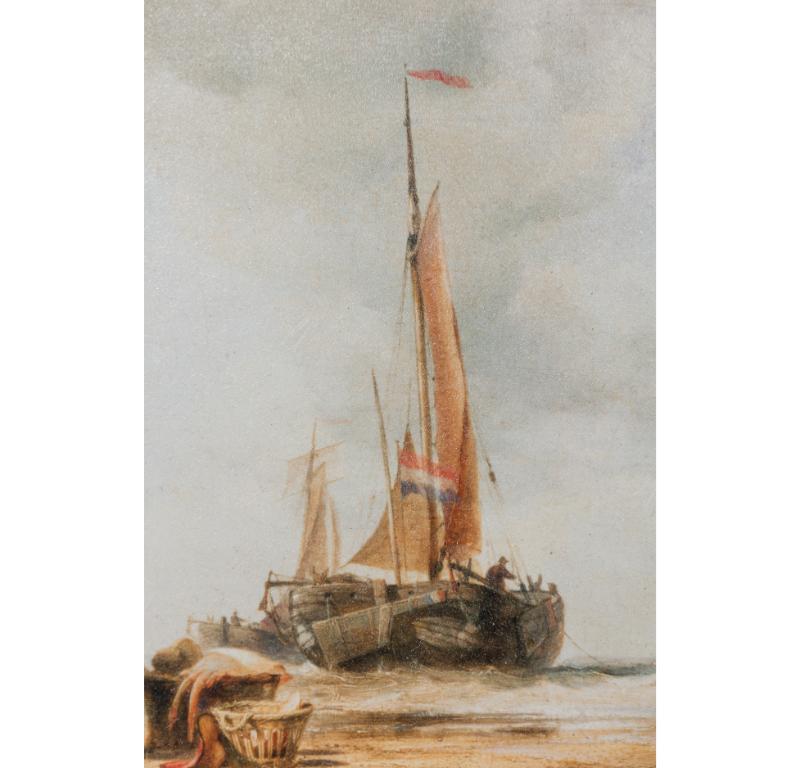 Kopie eines Landschaftsgemäldes mit dem Titel "Strand bei Schevenigen", das Figuren beim Entladen von Booten zeigt